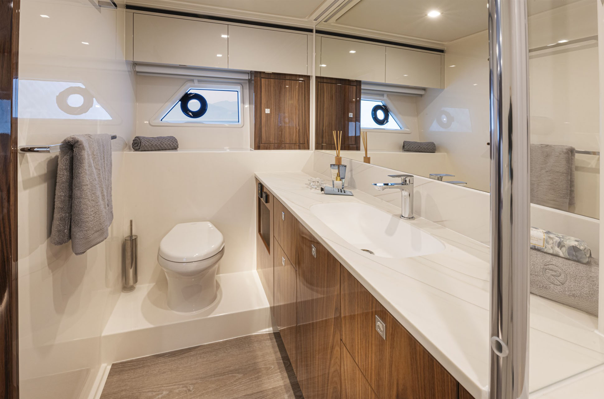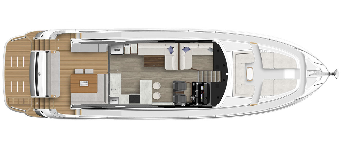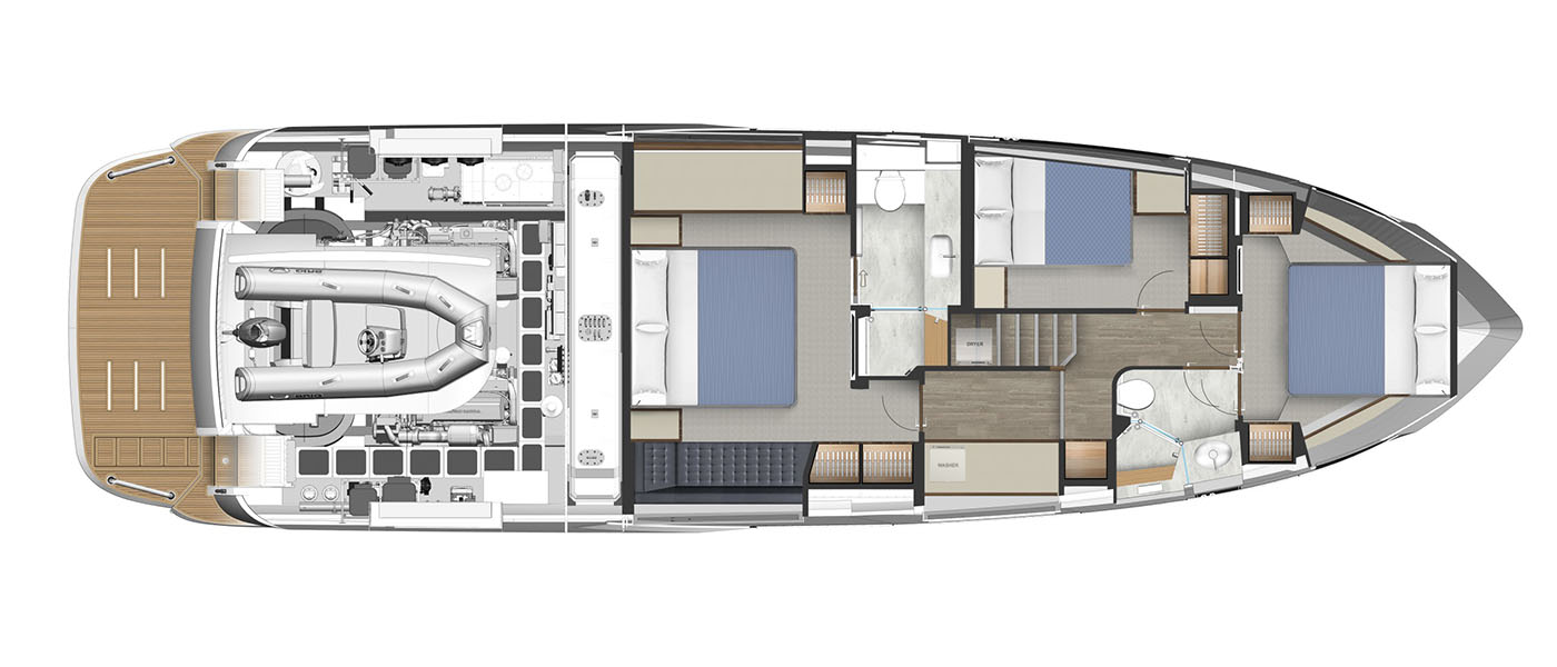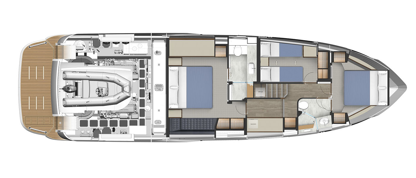 A tender garage keeps everything clean and organized, with extra room for water toys and gear. And for owners who care about practicality, the full-height engine room offers excellent access for service and day-to-day checks.