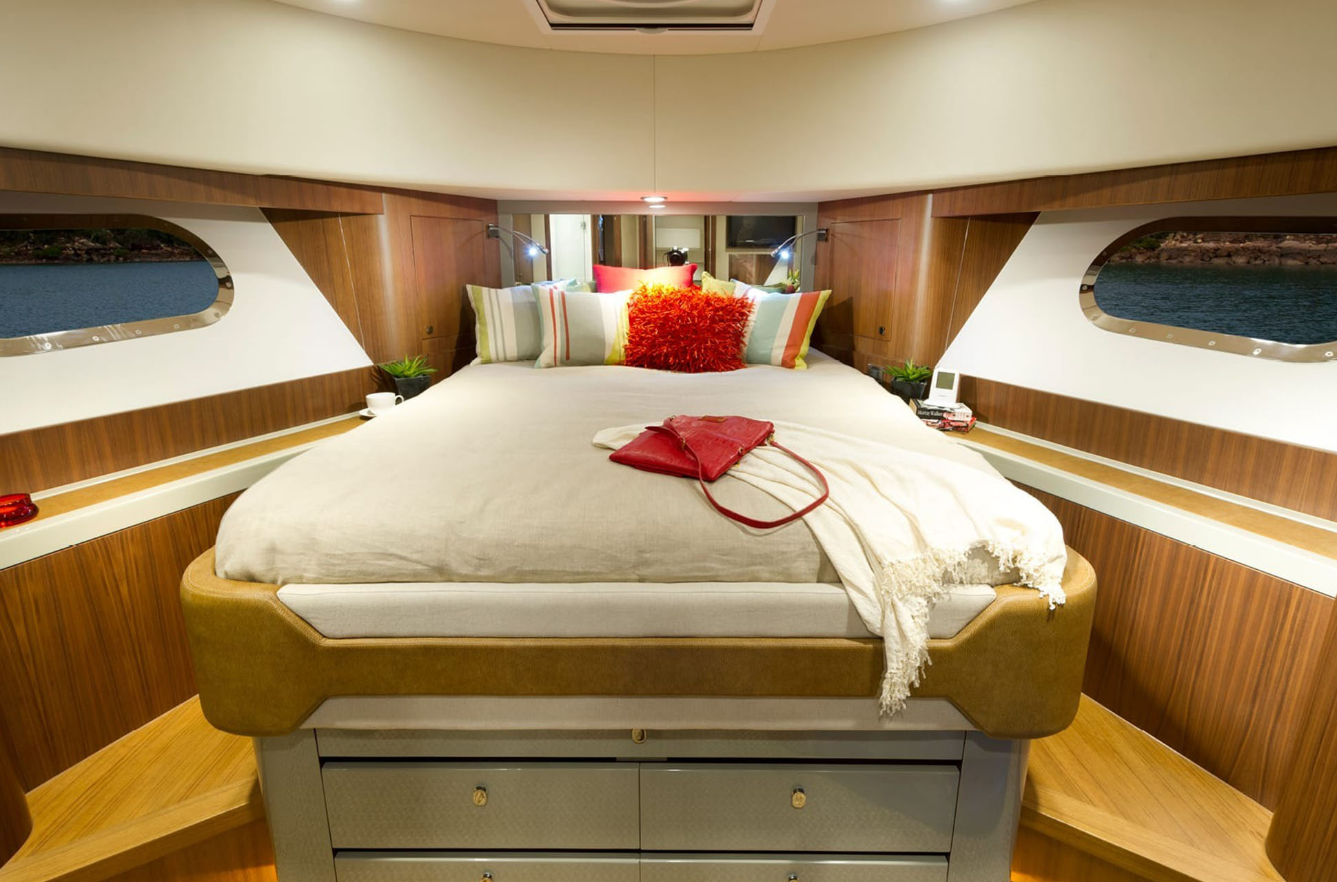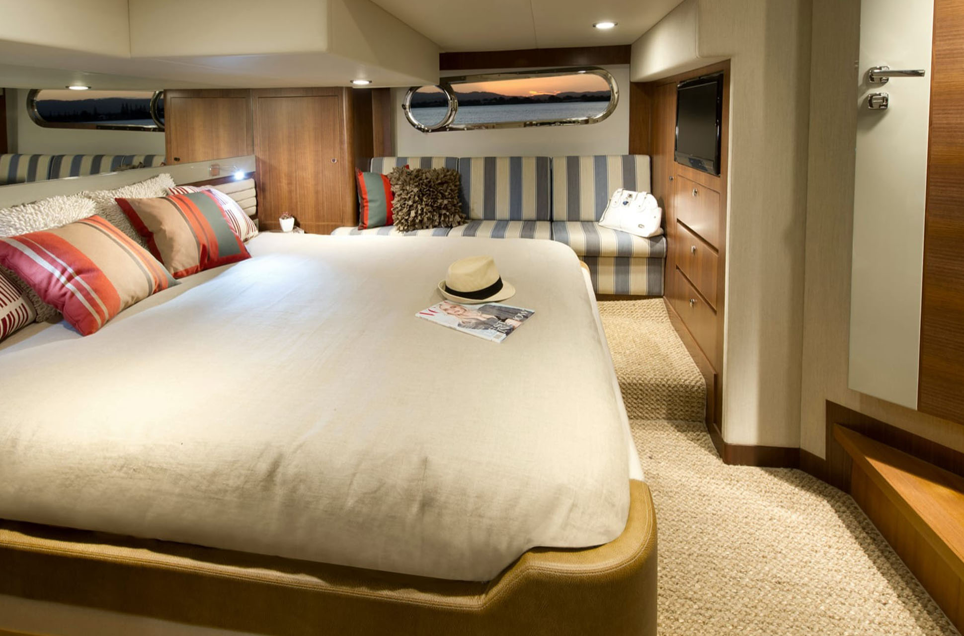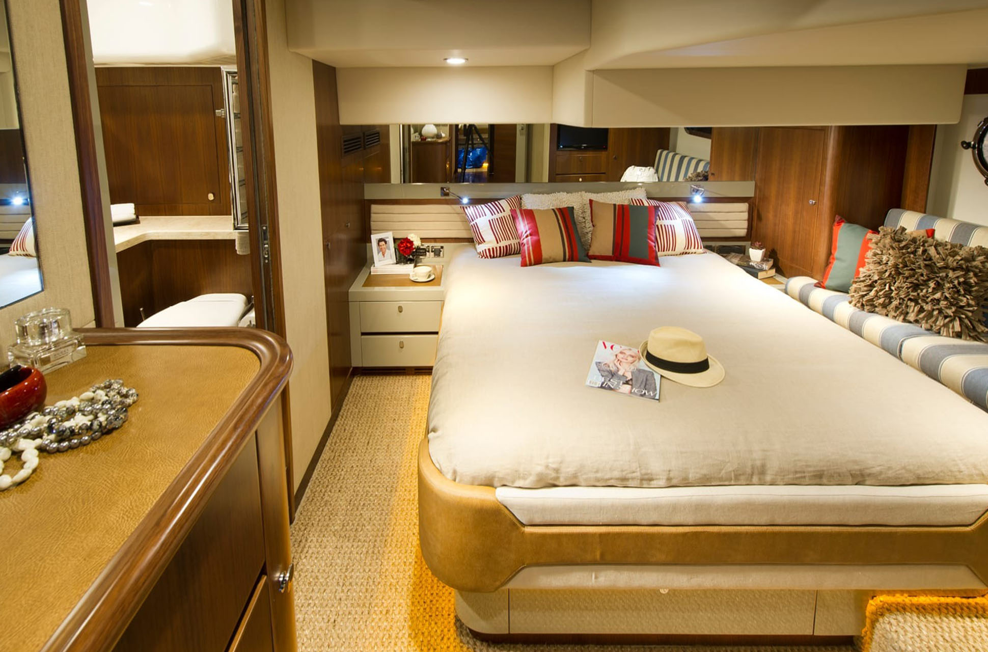 The layout is designed for single-level living, extending from the aft galley to the cockpit. At the lower helm, owners will find a well-equipped command station with dedicated guest seating. A standout feature for a yacht of this size is the full-beam master stateroom, offering exceptional comfort. The forward VIP stateroom occupies the yacht’s V-section with a queen island berth, while the third guest stateroom includes two adult-sized twin beds. Two bathrooms serve the accommodations deck.