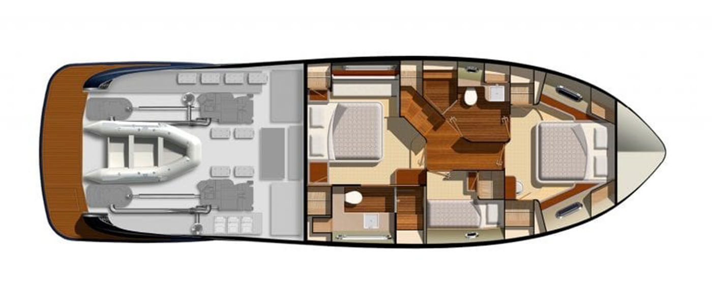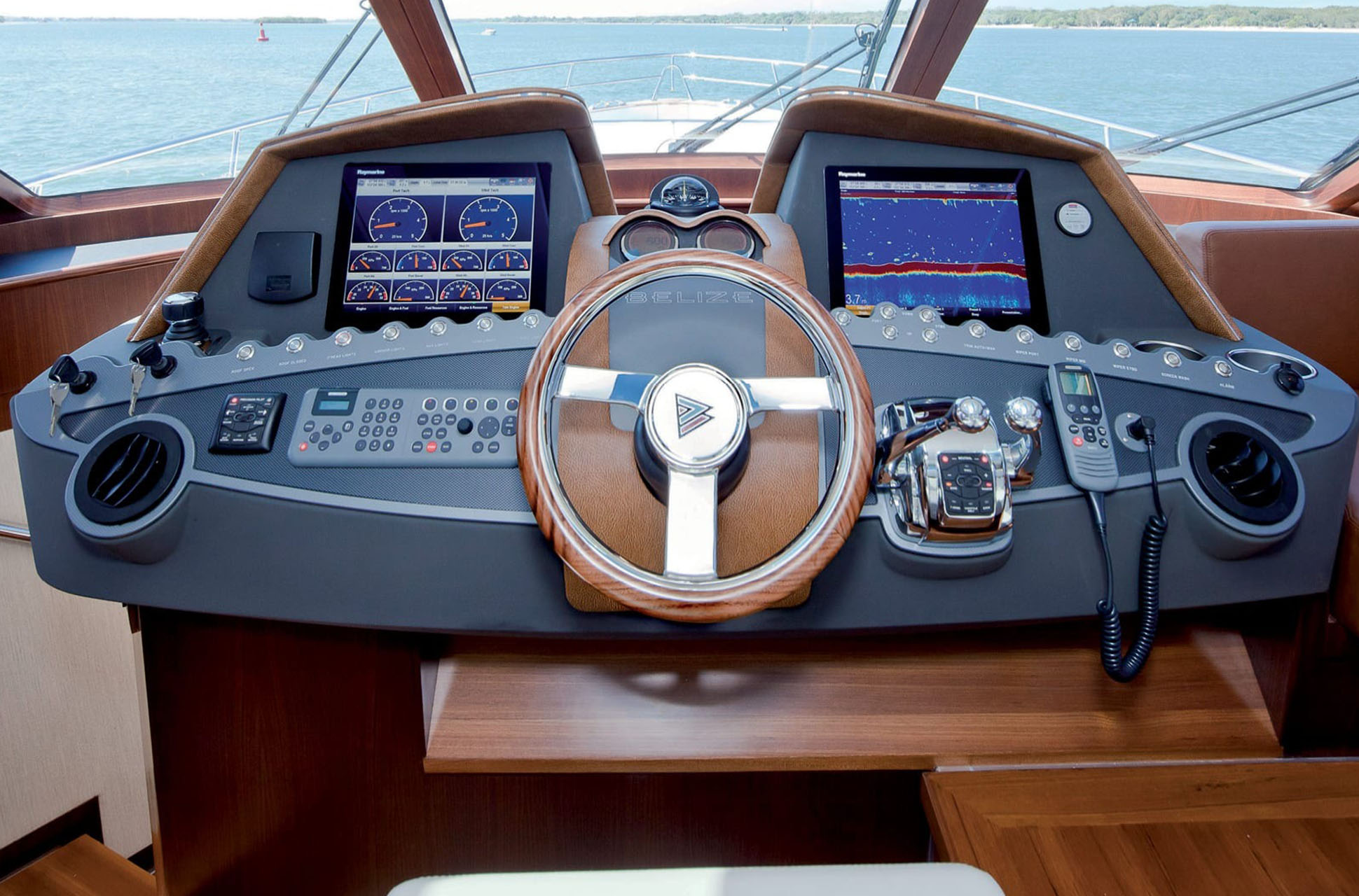 Built to high technical standards, the Belize 54 features resin-infused composite construction, a double vinyl-ester outer skin, a watertight stepped collision bulkhead, and independent foam-filled hull compartments. Onboard technology includes the CZone digital switching system, Glass Cockpit navigation, and the Volvo Penta Inboard Performance System (IPS) with joystick docking for enhanced maneuverability.
