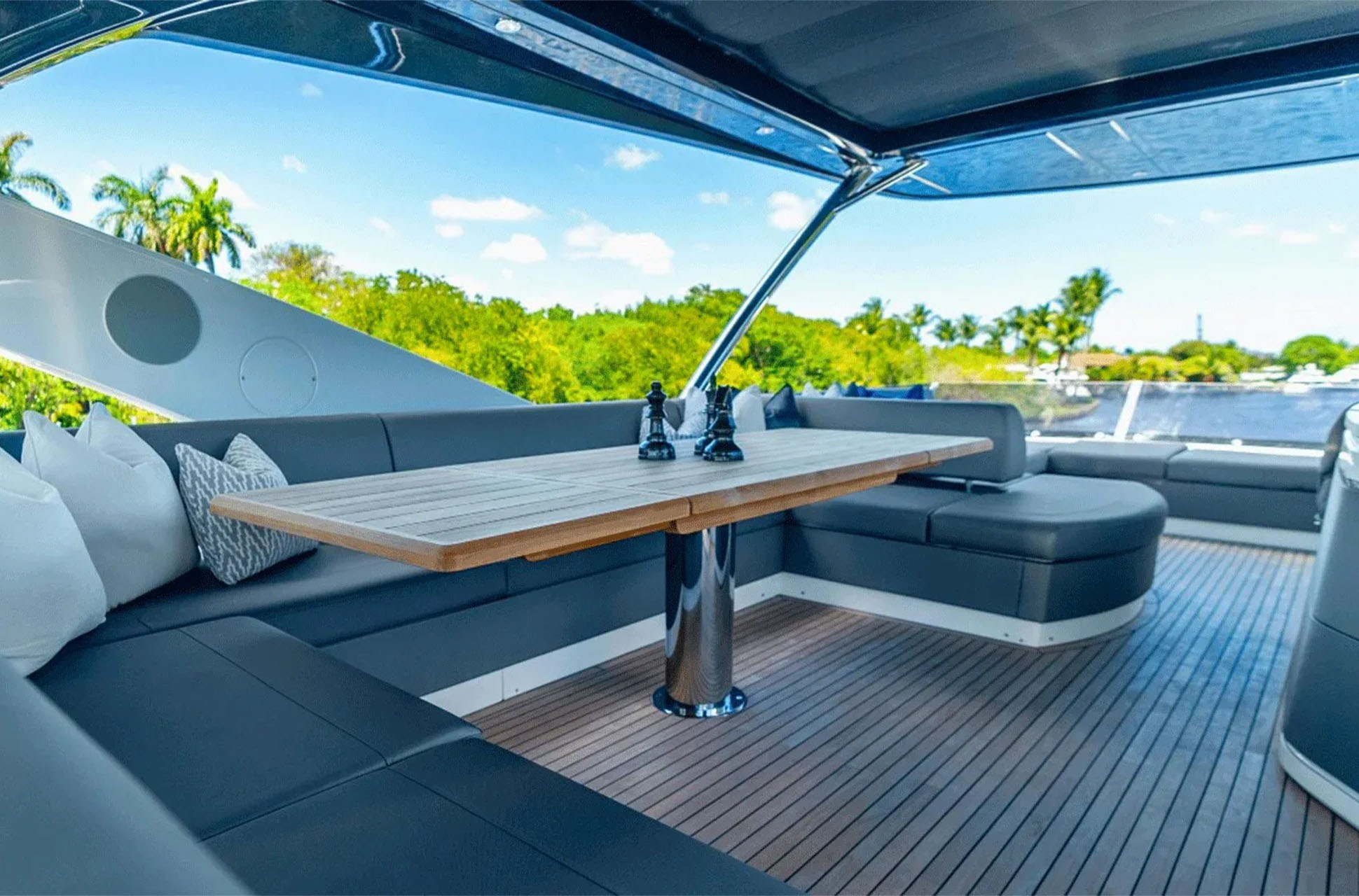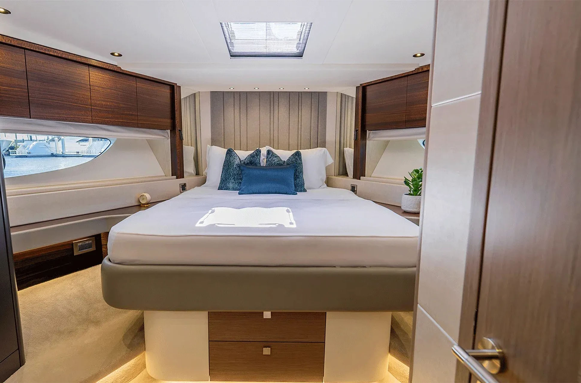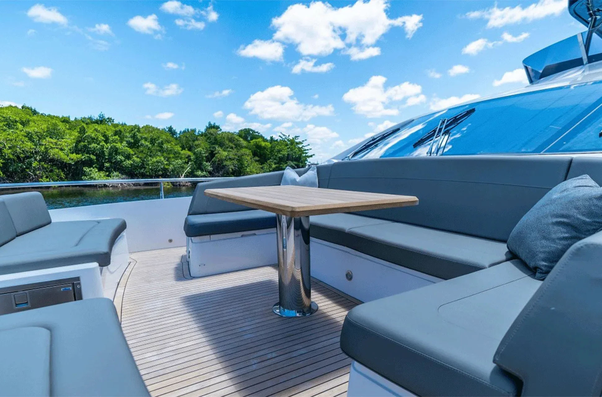 The cockpit can be customized with extra lounge seating or a cocktail bar, while the stern transforms into a mini beach club complete with a BBQ grill, fold-out seating, and a rain shower. An extended bathing platform accommodates a Williams 445 tender, SeaBobs, and more, enhancing on-water fun. Forward, the expansive foredeck offers twin sunbeds, flexible seating, and optional refrigeration, ensuring the perfect setting for any social occasion.