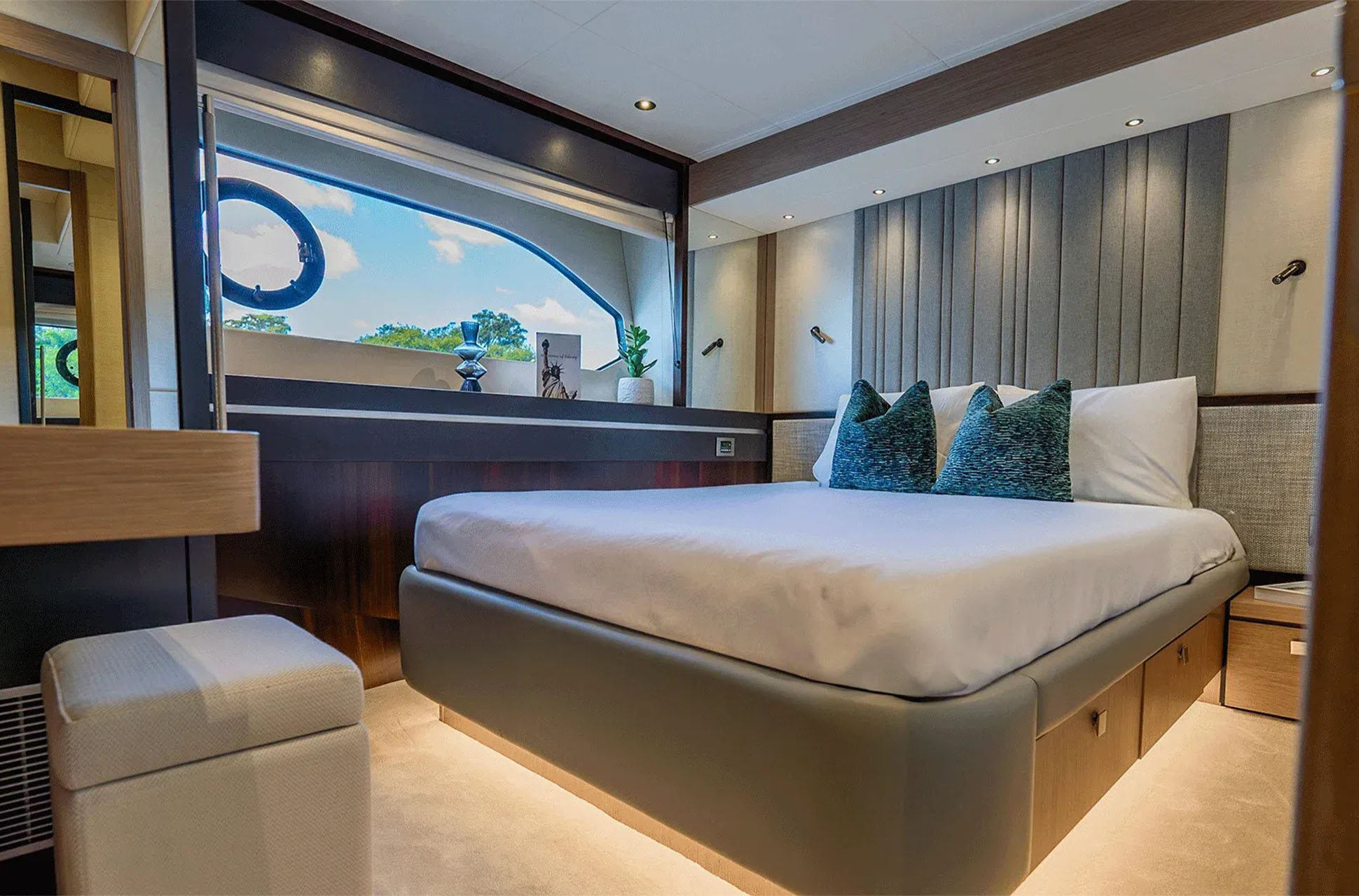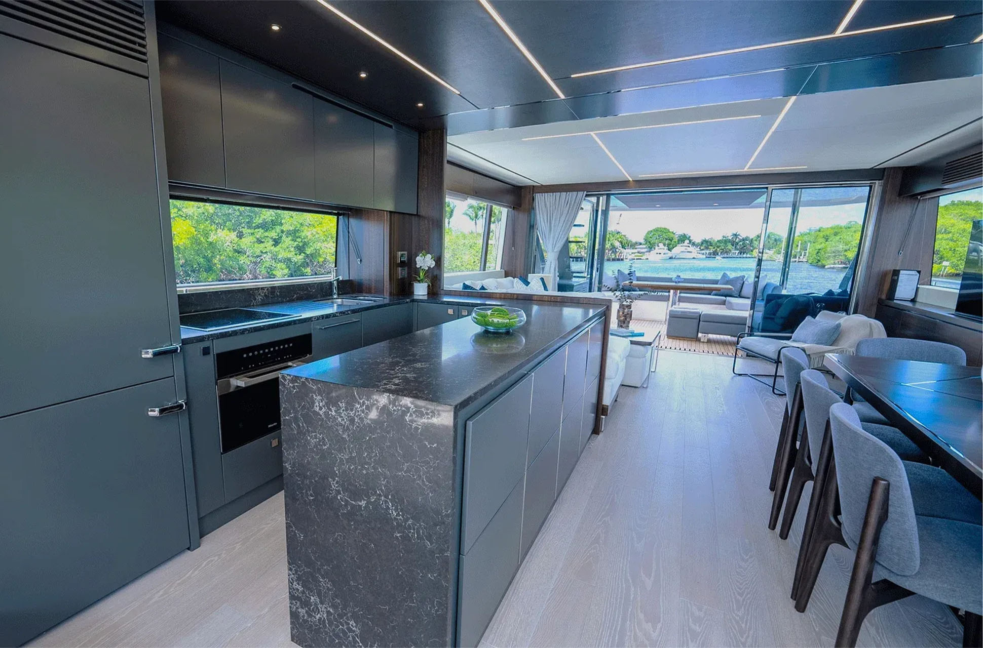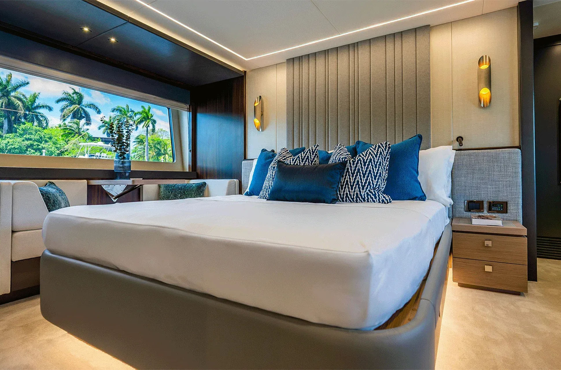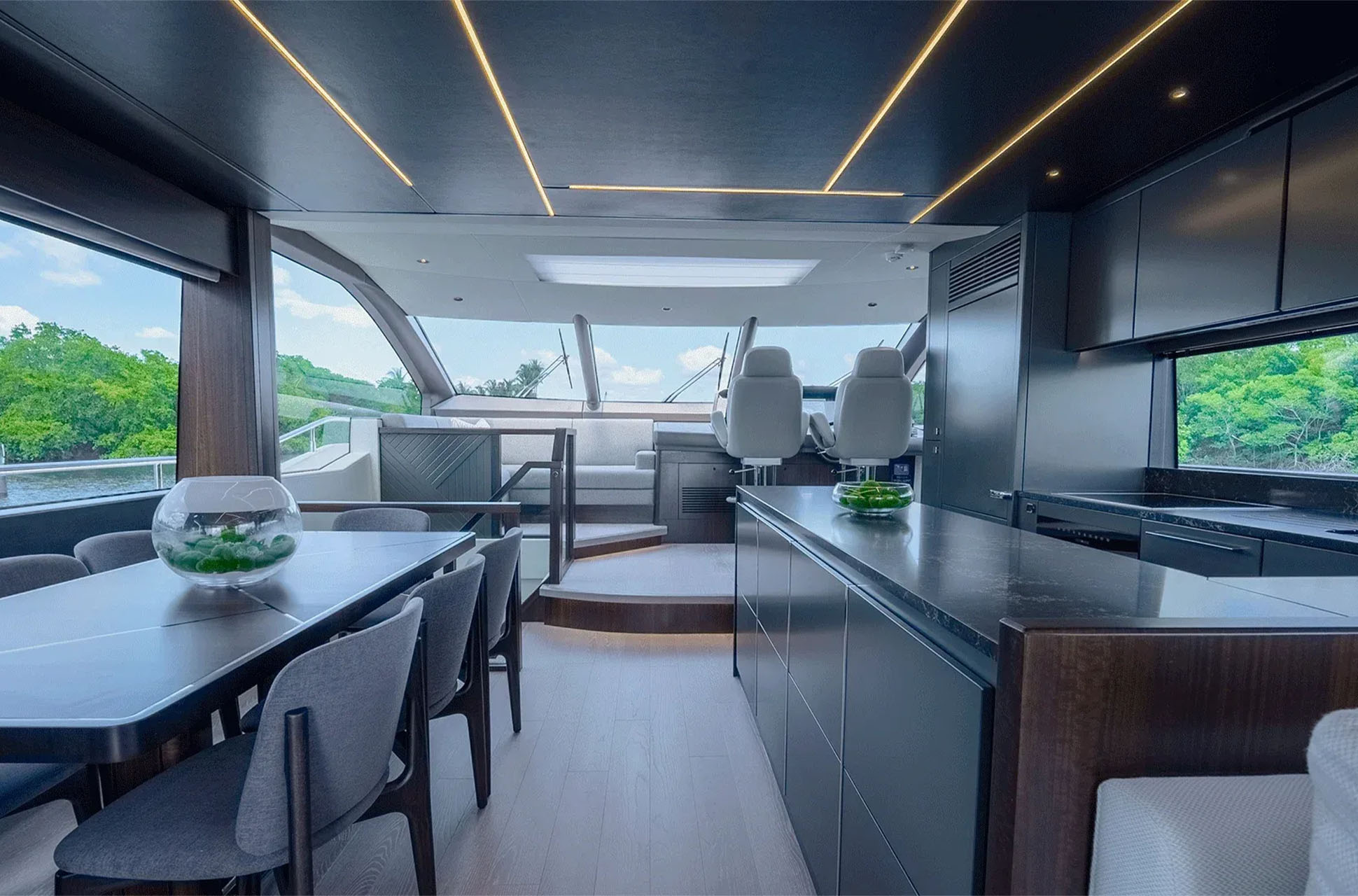 Striking on the horizon, the 76 Yacht features expansive glass that floods the interior with natural light, while the main deck offers nearly 360-degree views, perfect for entertaining. Designed for al fresco living, the flybridge provides unmatched space and flexibility, with options for a spa tub, jet ski with crane, or additional sunbeds—allowing owners to tailor the layout to their lifestyle.
