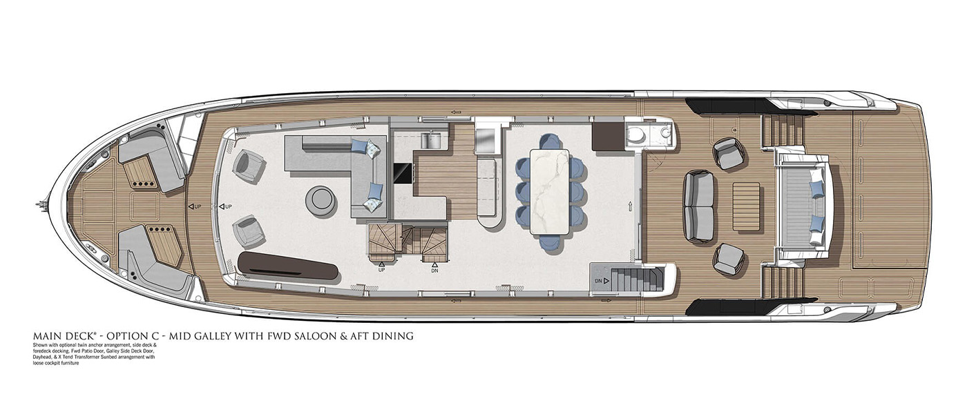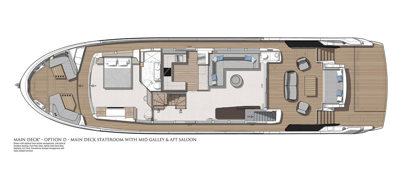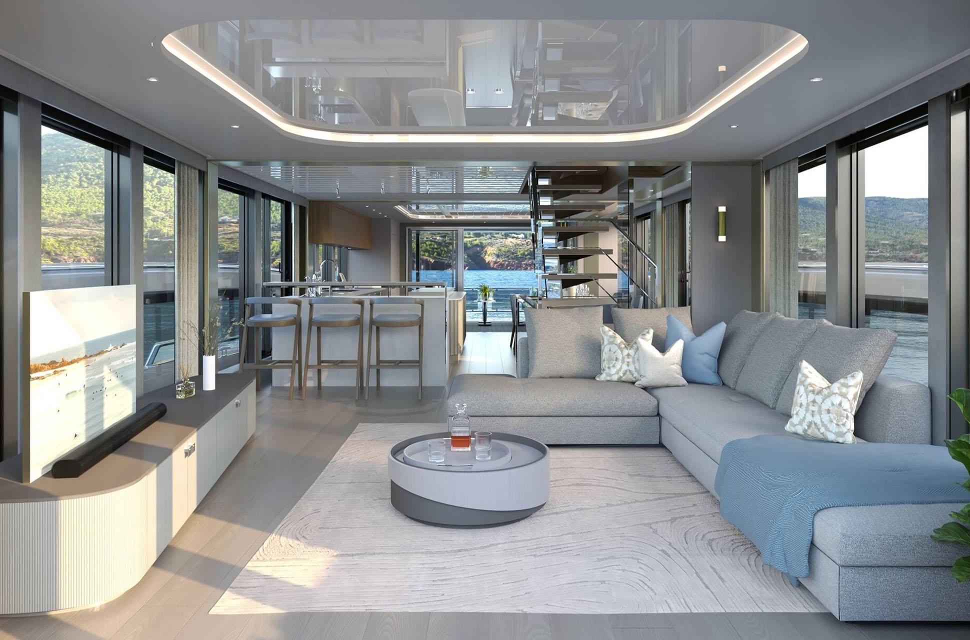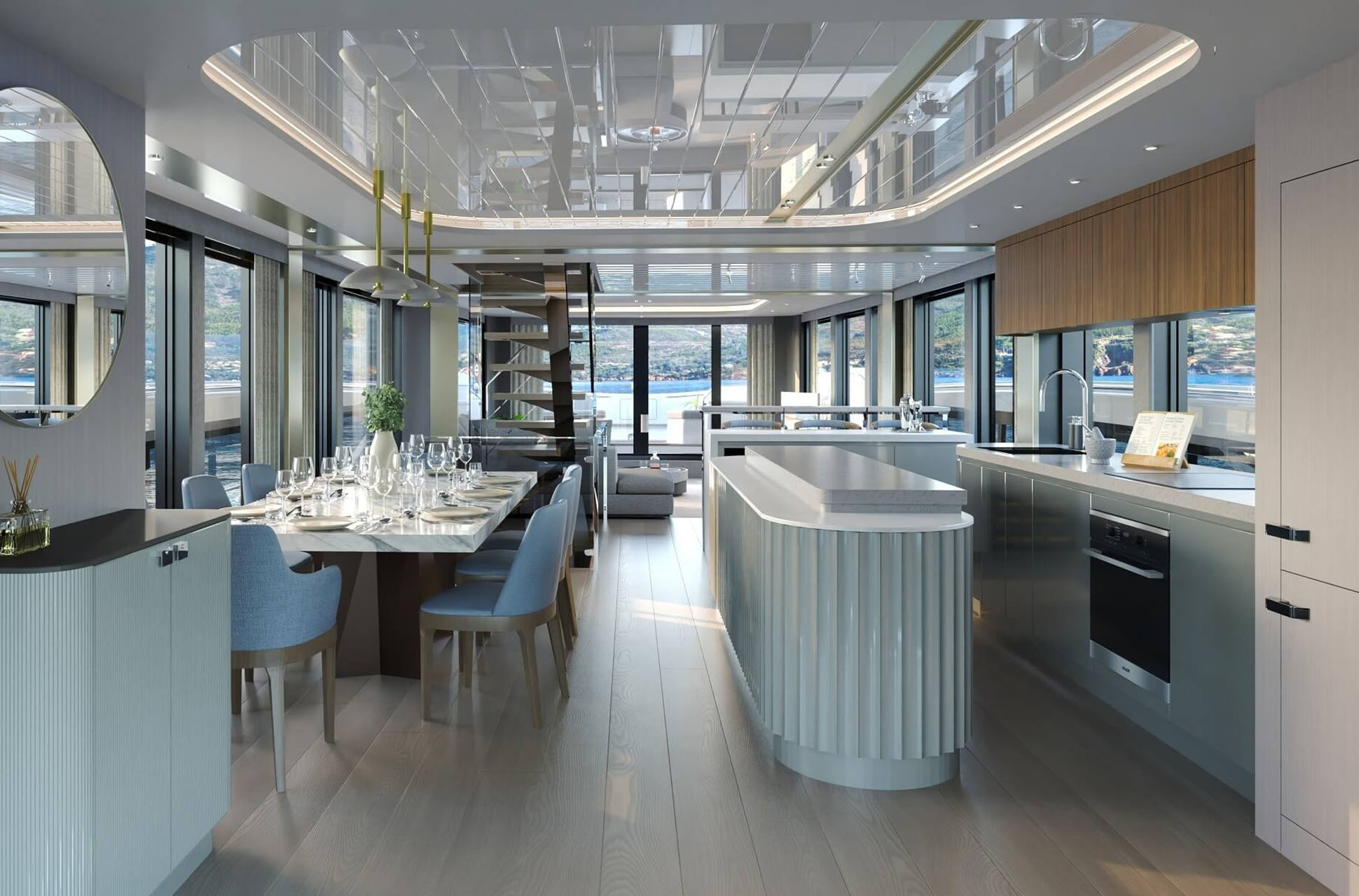 The main deck saloon delivers 360° views through full-height glazing, creating a luxury penthouse feel. Owners can opt for an open-plan setup with aft galley, dining, and a forward bar, or a more private central galley with varying levels of enclosure for separation between guests and crew. Dual patio doors connect the interior to the outside, while a striking floating staircase adds style without disrupting views.