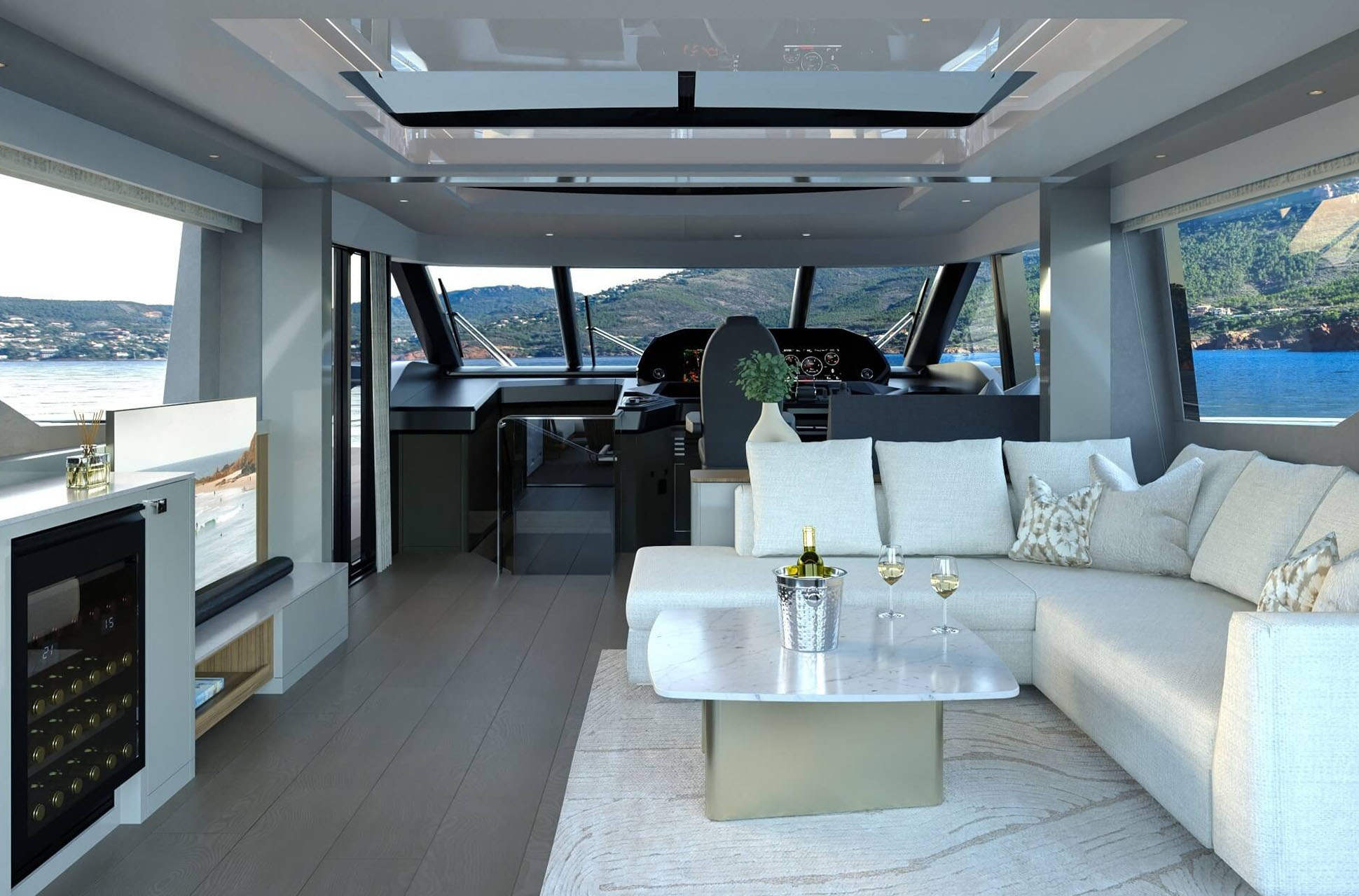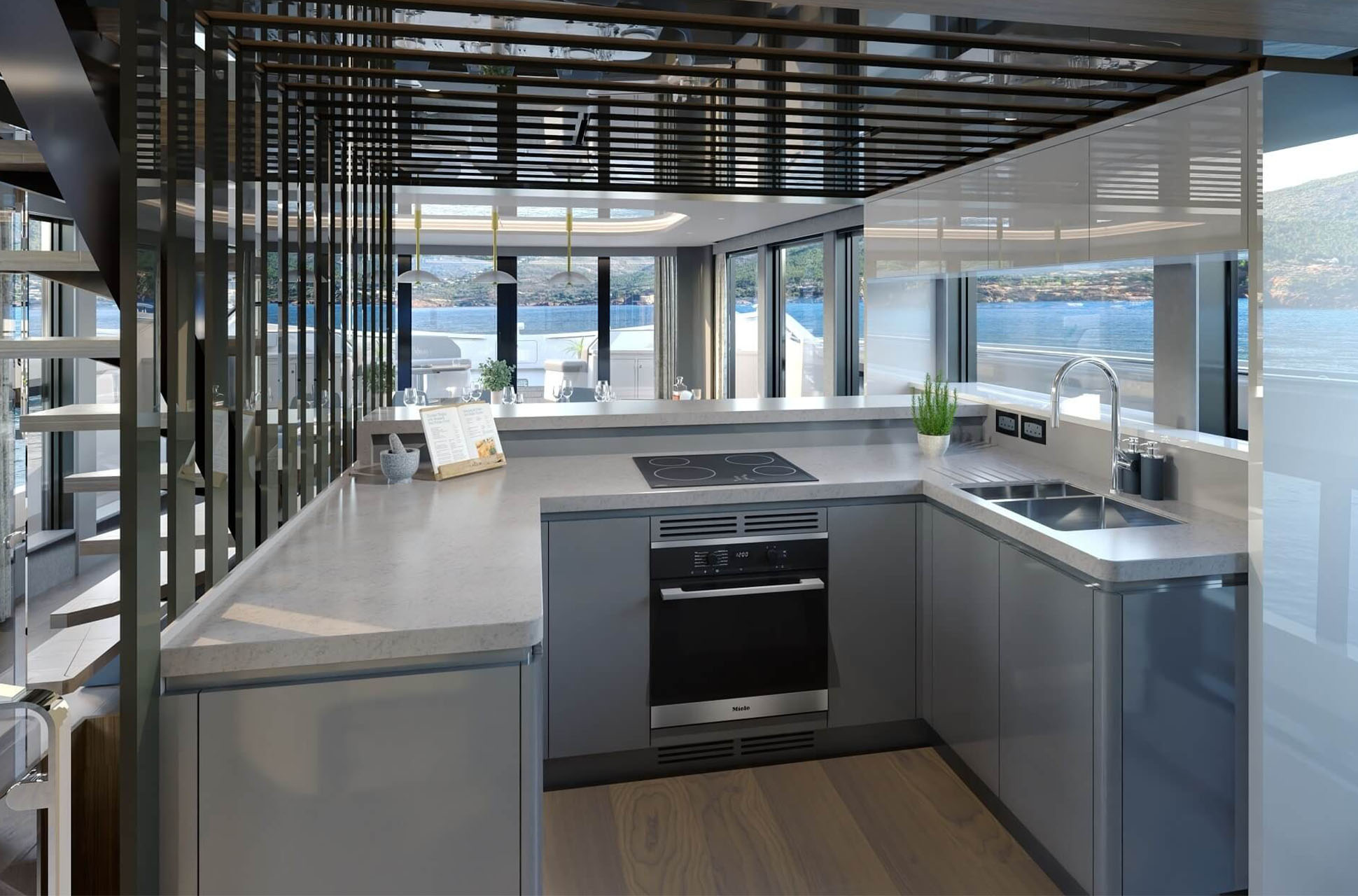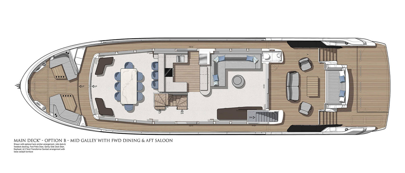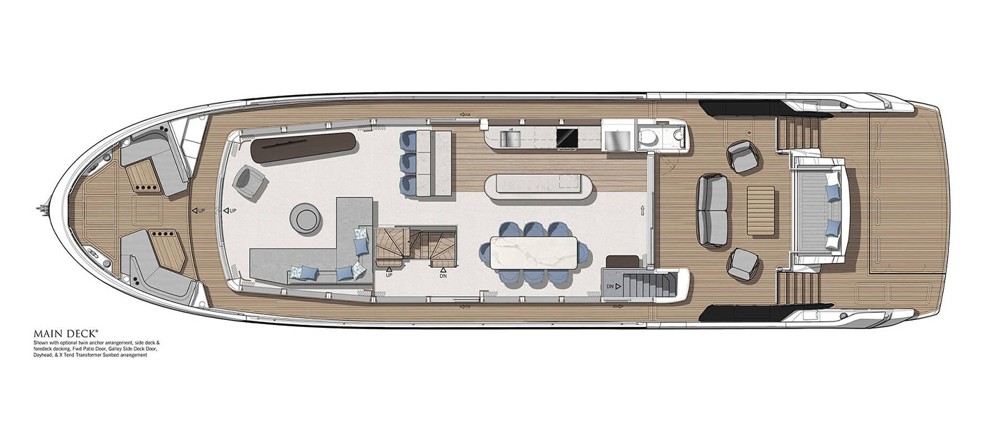 The main deck saloon delivers 360° views through full-height glazing, creating a luxury penthouse feel. Owners can opt for an open-plan setup with aft galley, dining, and a forward bar, or a more private central galley with varying levels of enclosure for separation between guests and crew. Dual patio doors connect the interior to the outside, while a striking floating staircase adds style without disrupting views.