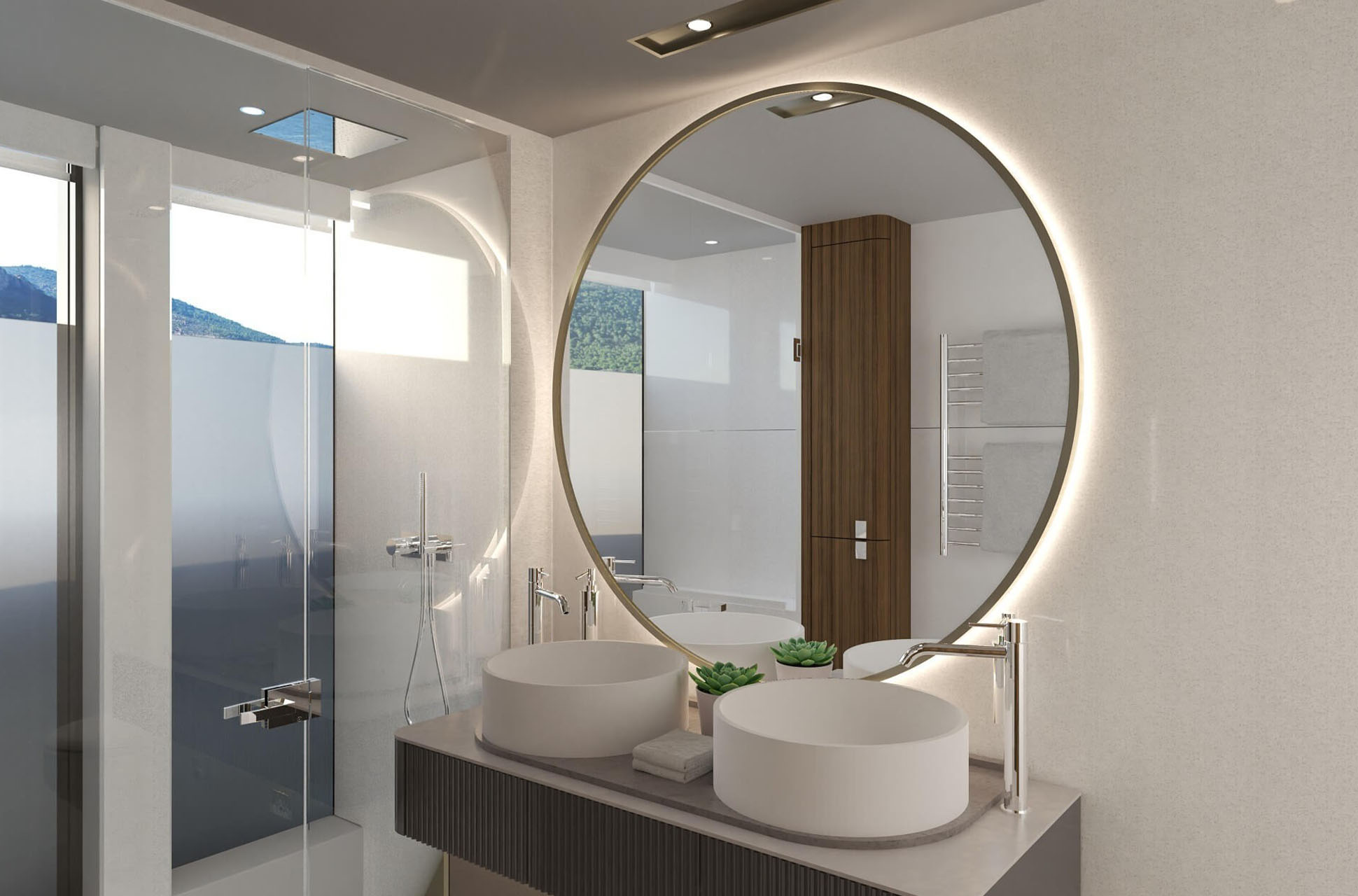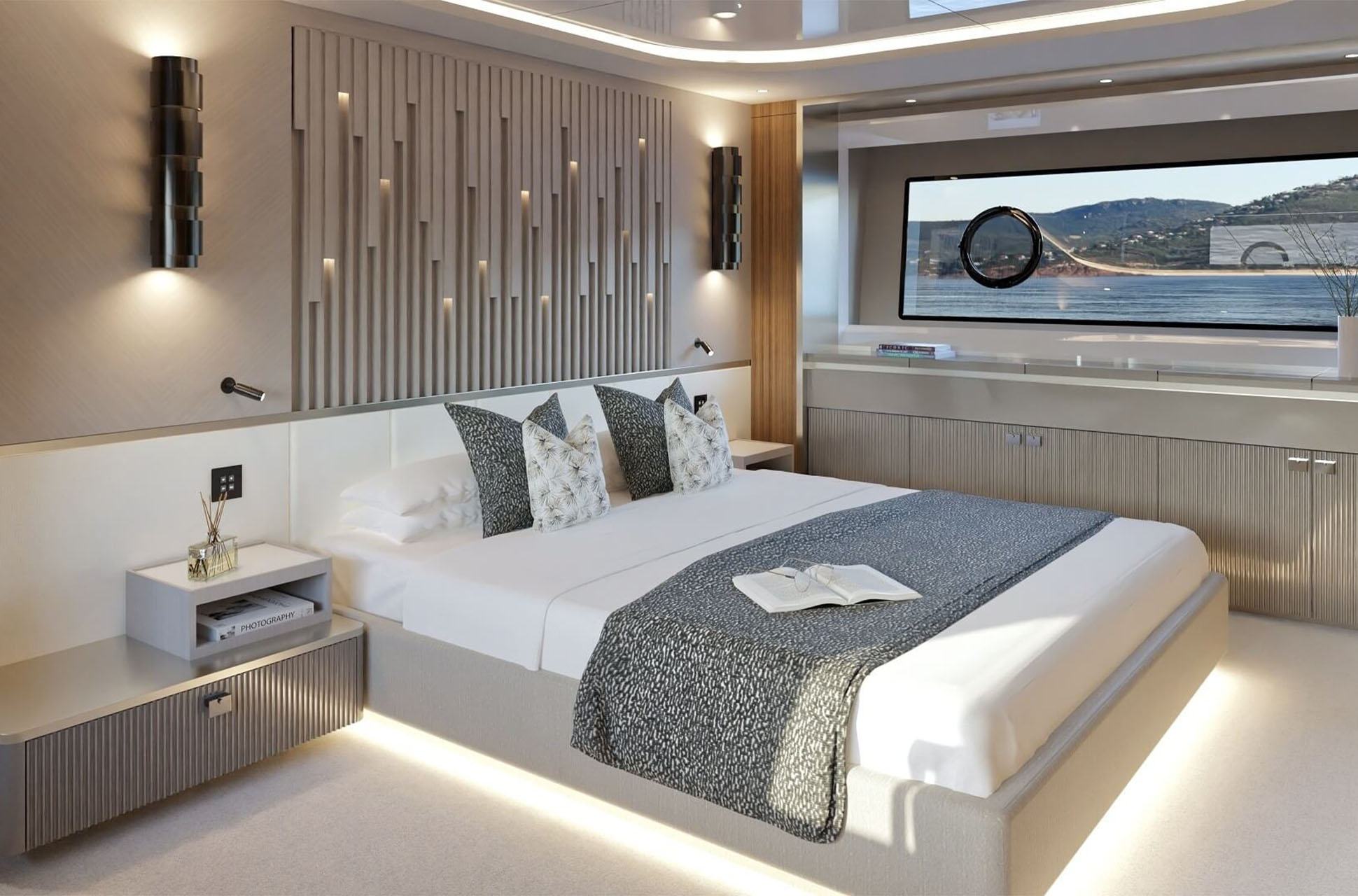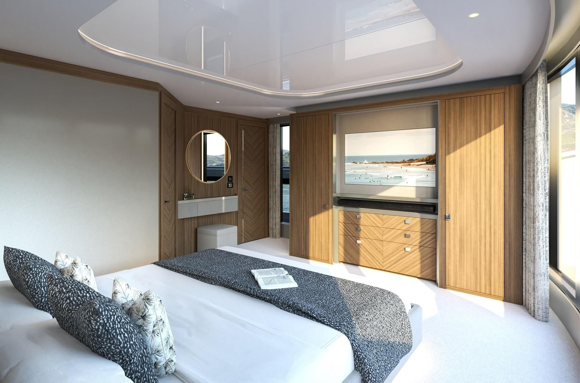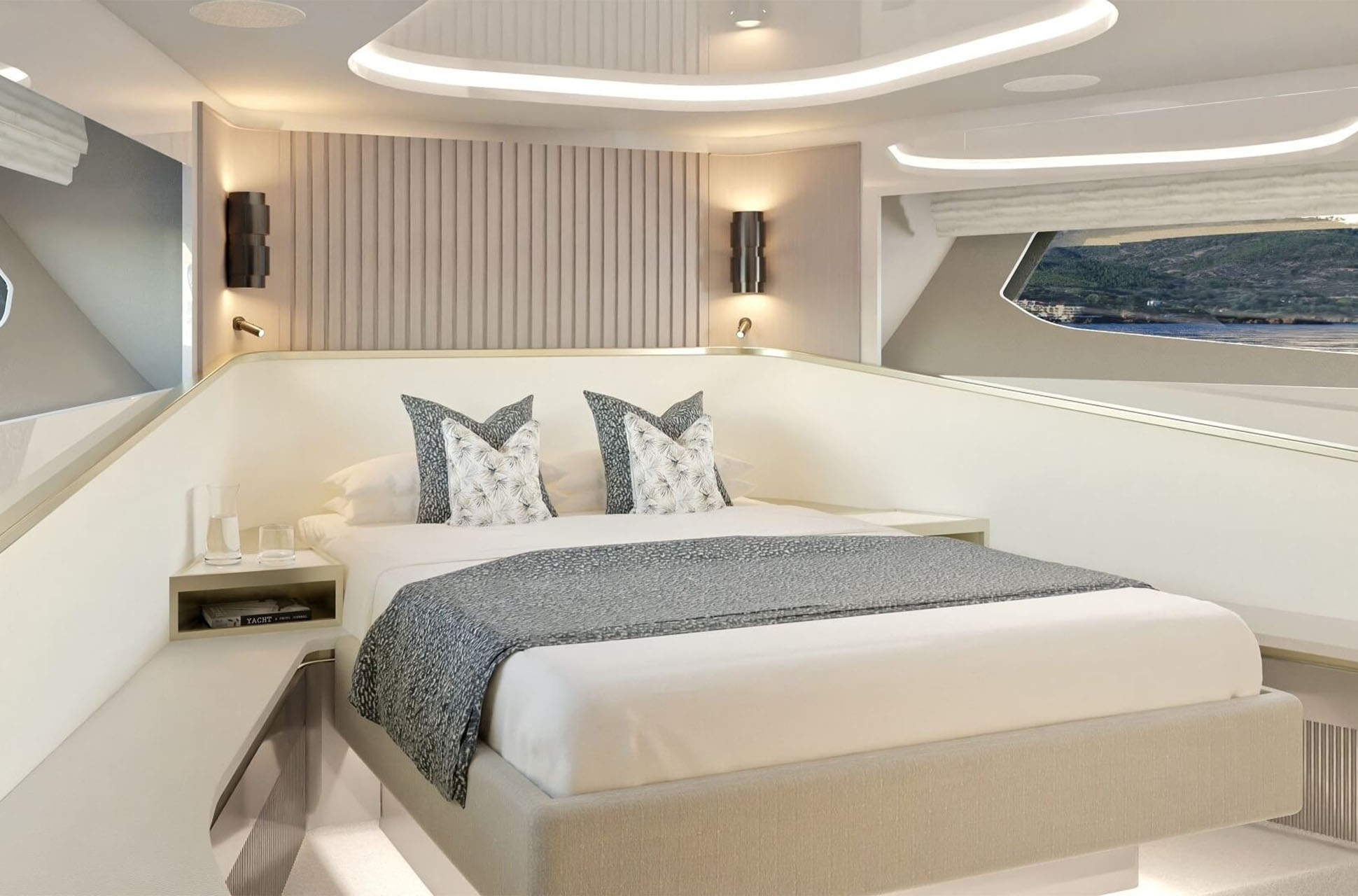 The main deck saloon delivers 360° views through full-height glazing, creating a luxury penthouse feel. Owners can opt for an open-plan setup with aft galley, dining, and a forward bar, or a more private central galley with varying levels of enclosure for separation between guests and crew. Dual patio doors connect the interior to the outside, while a striking floating staircase adds style without disrupting views.