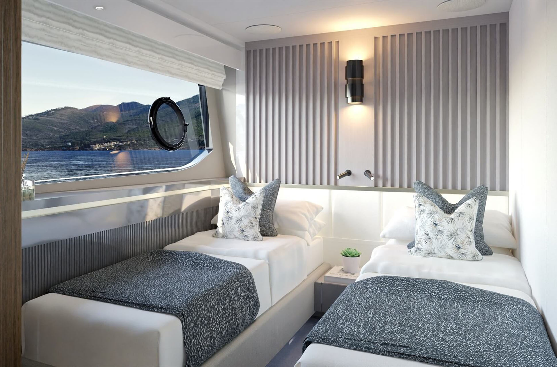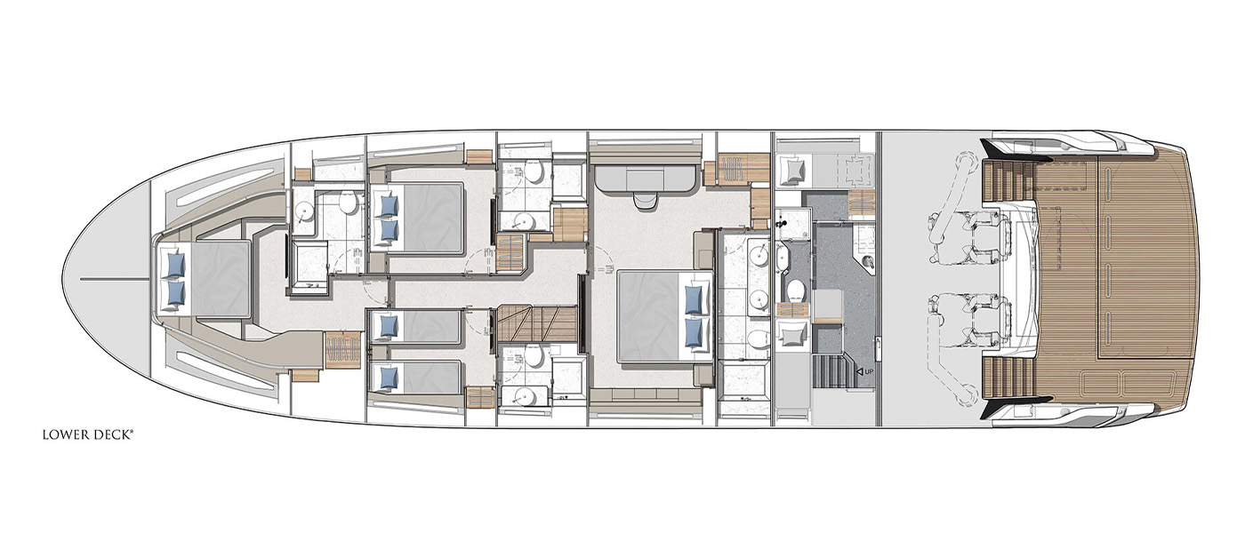 Accommodation options include a forward master on the main deck with direct foredeck access, plus a full-beam aft master below with en suite and twin basins. The standard lower deck layout adds a VIP cabin and two guest cabins, with optional sliding berths for flexibility. Crew quarters forward of the engine room include worktops and appliances for self-sufficiency. A rare benefit in this size range, the lower deck features level flooring between the master and VIP for added comfort.