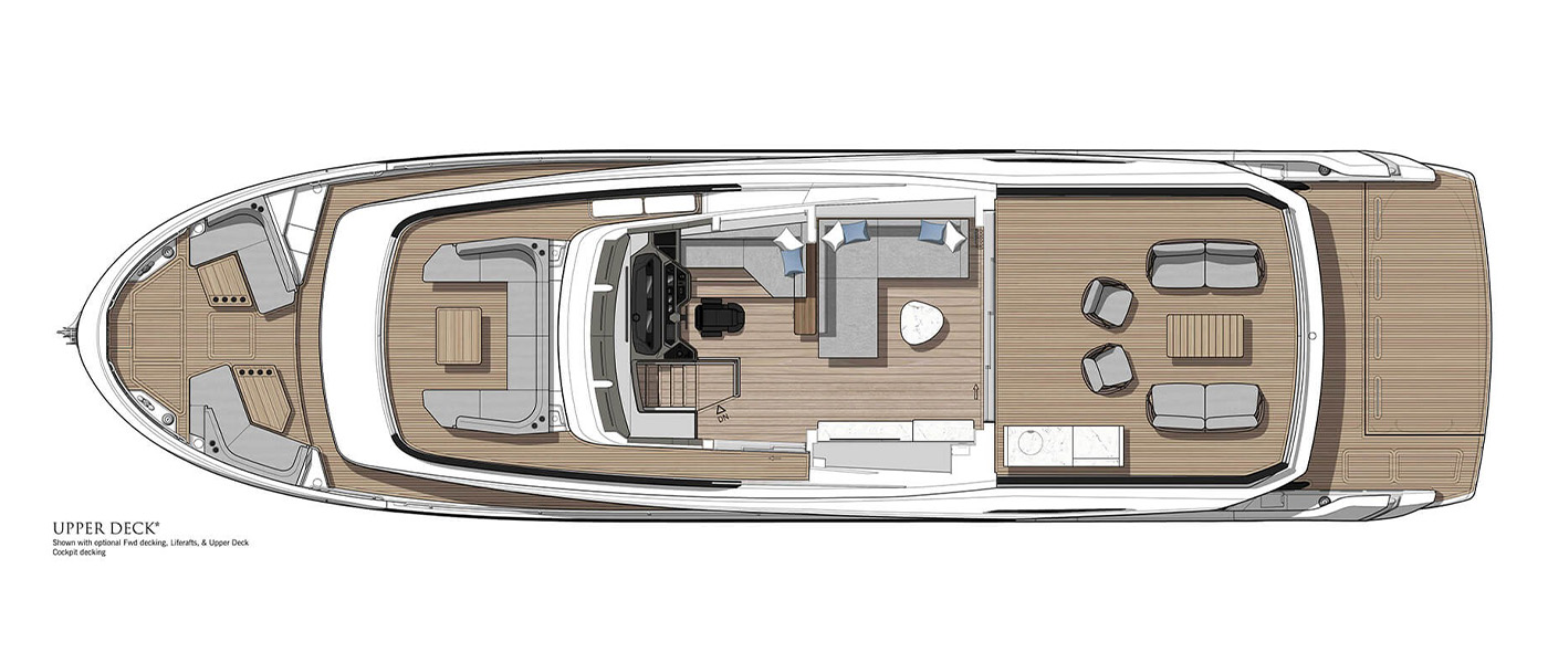 The Sunseeker 82 Ocean Enclosed is the newest model in the Ocean family, offering expansive volume, flexible layouts, and a sense of space well beyond its size. With a fully enclosed upper deck and single helm station, the yacht maximizes internal space for versatile use, especially across the seamless saloon and upper deck. Inspired by Portuguese bridge styling, the upper deck provides generous seating, sunpads, and the option for a spa tub. Owners can fully customize layouts thanks to single-level flooring and minimal fixed furniture.