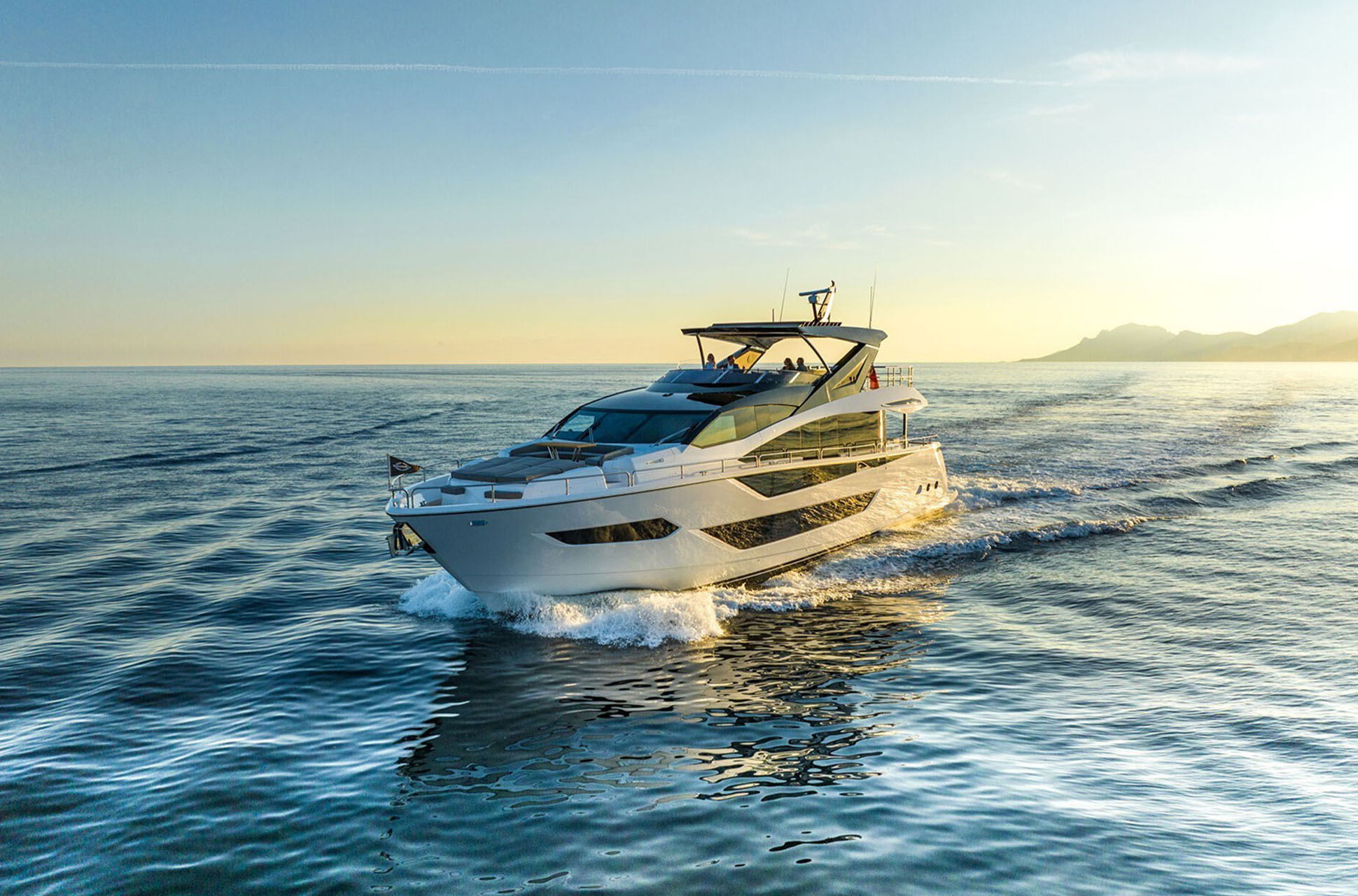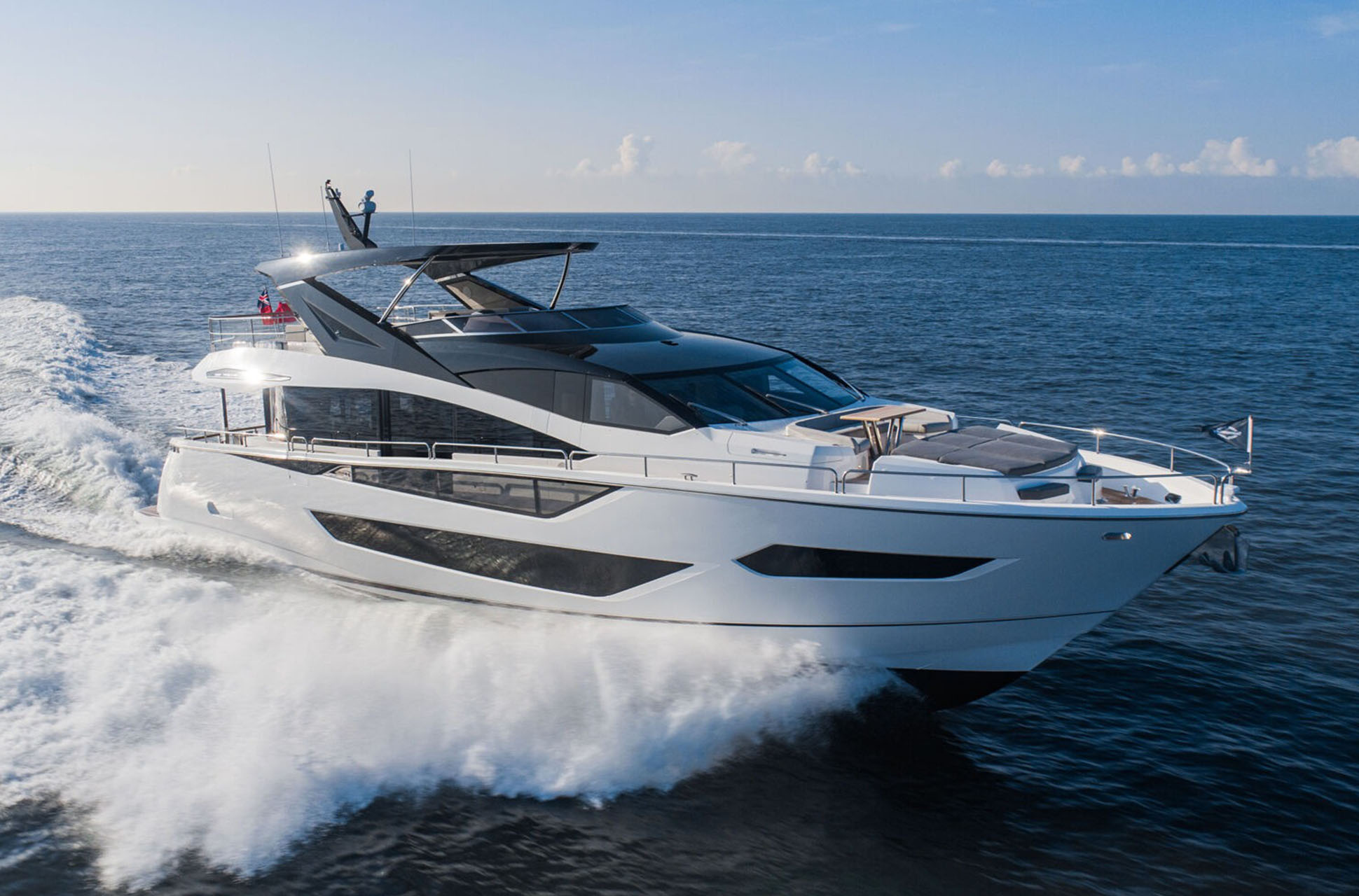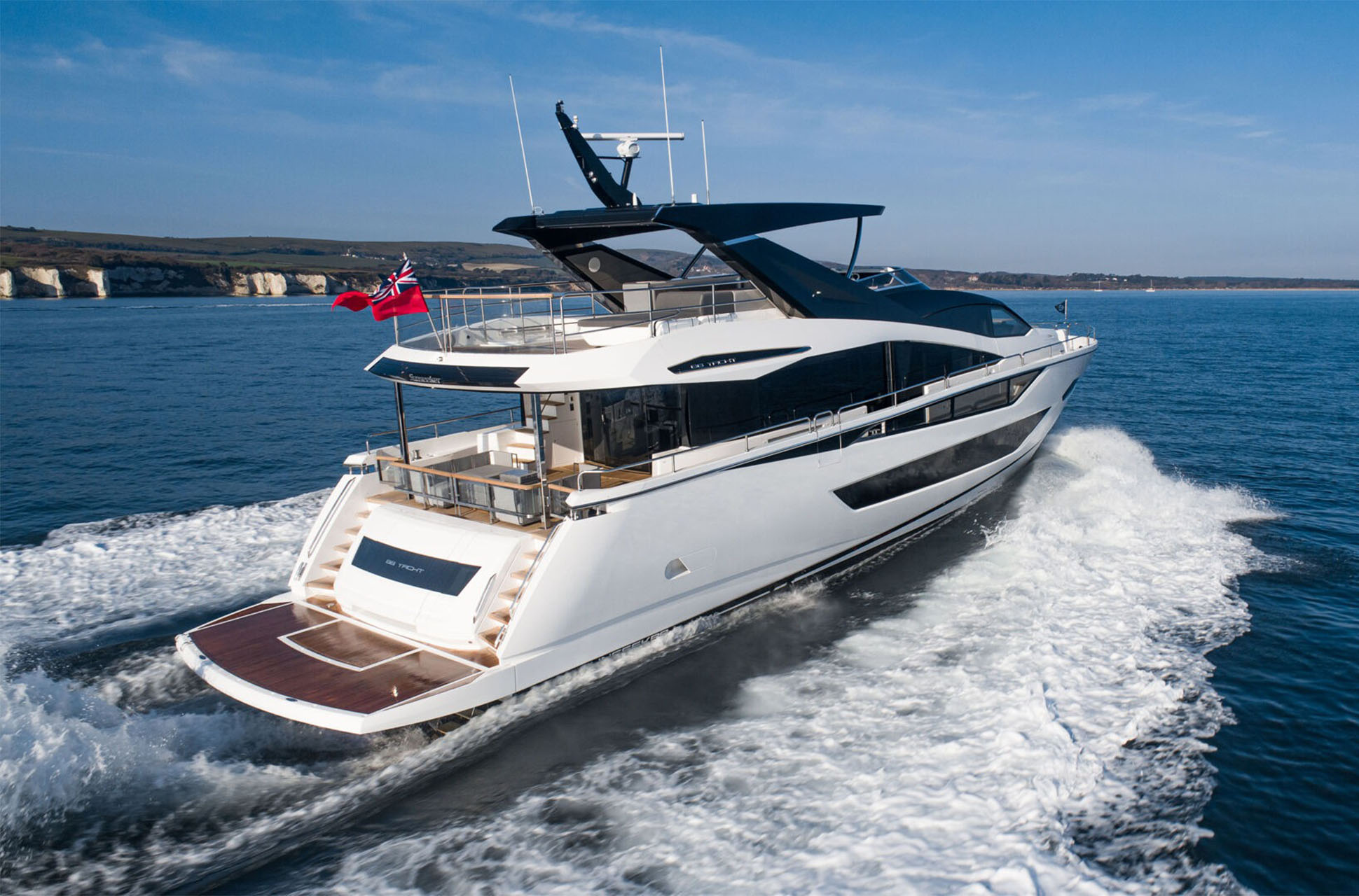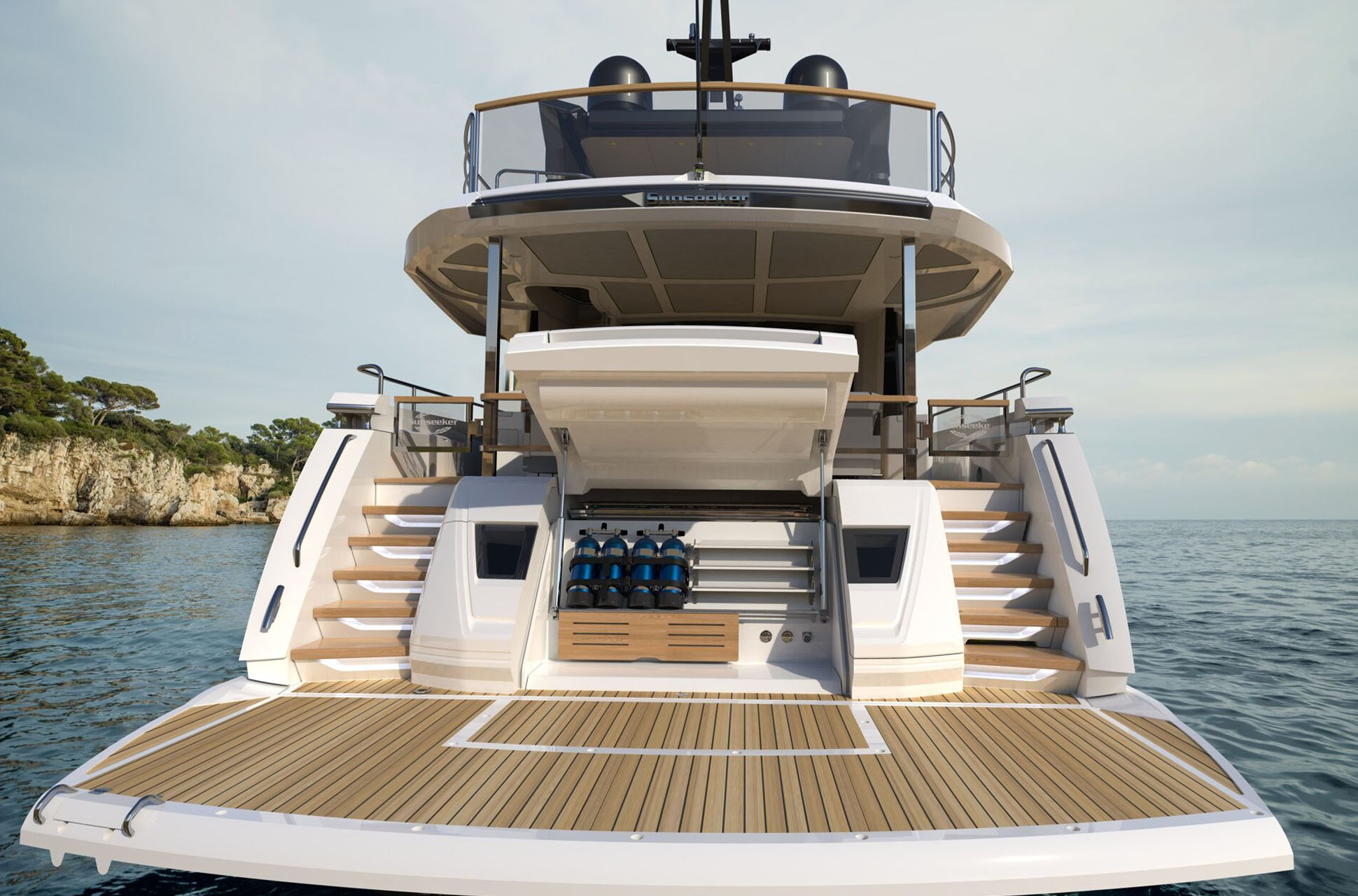 At the stern, Sunseeker’s signature Beach Club is accessed via sweeping dual staircases with recessed LED lighting. This private waterside retreat includes the award-winning X-TEND™ sunbed, which converts to face aft at water level or forward into the cockpit. The area is enhanced by an overhead rain shower, plentiful storage, and dedicated lockers for two SeaBobs. The extended bathing platform carries a tender, with the option of a flybridge crane for a jet ski or similar.