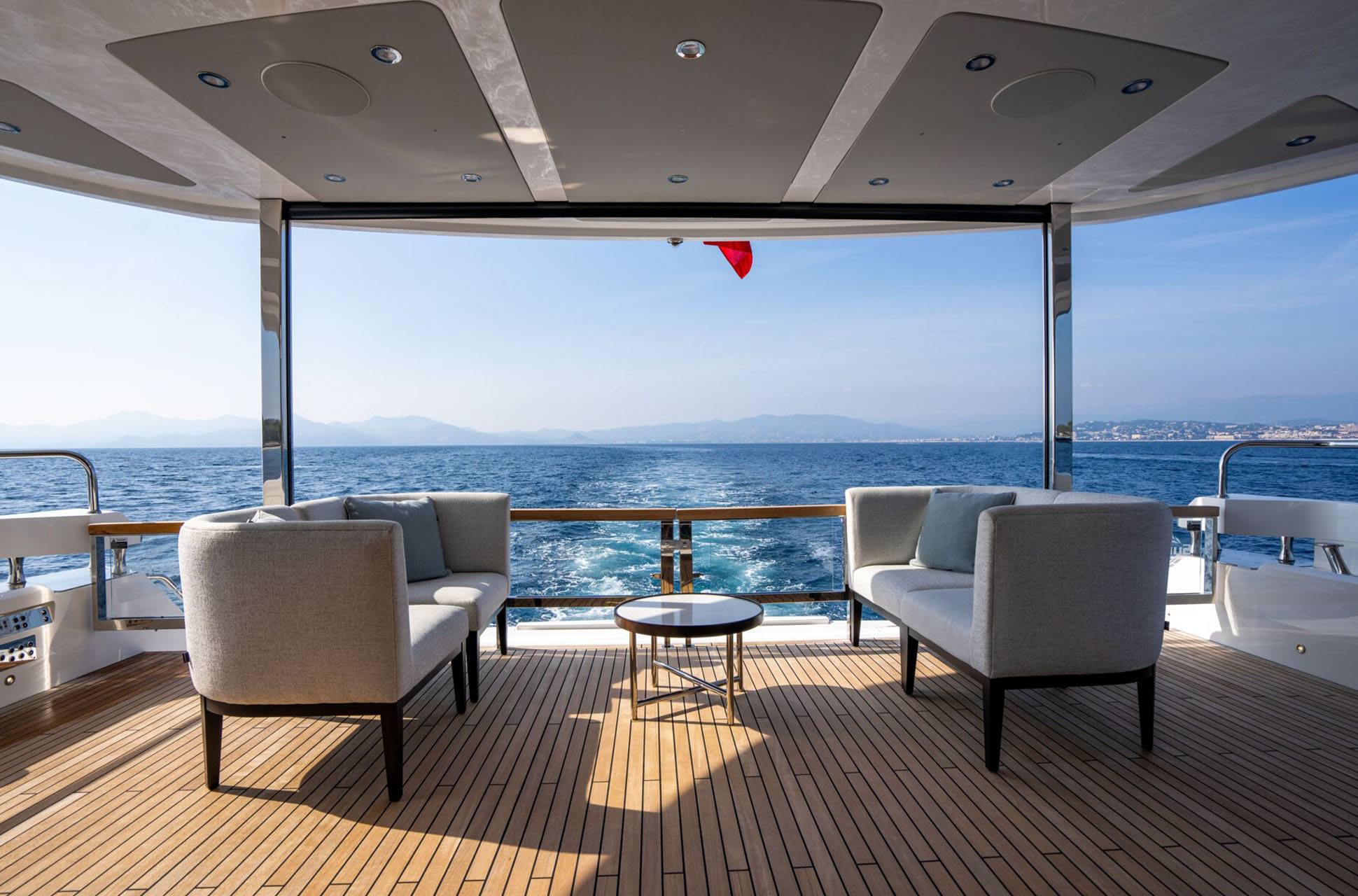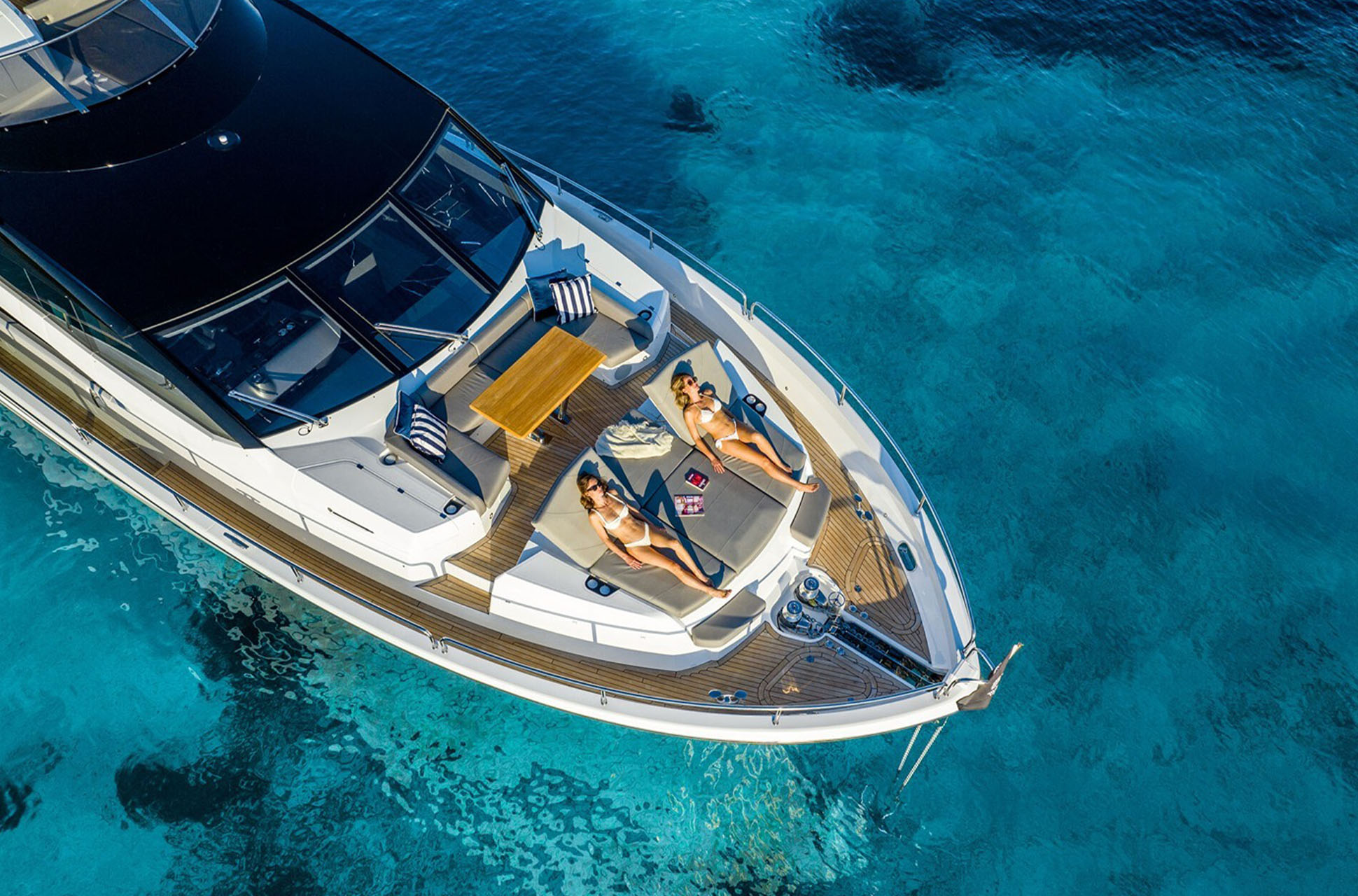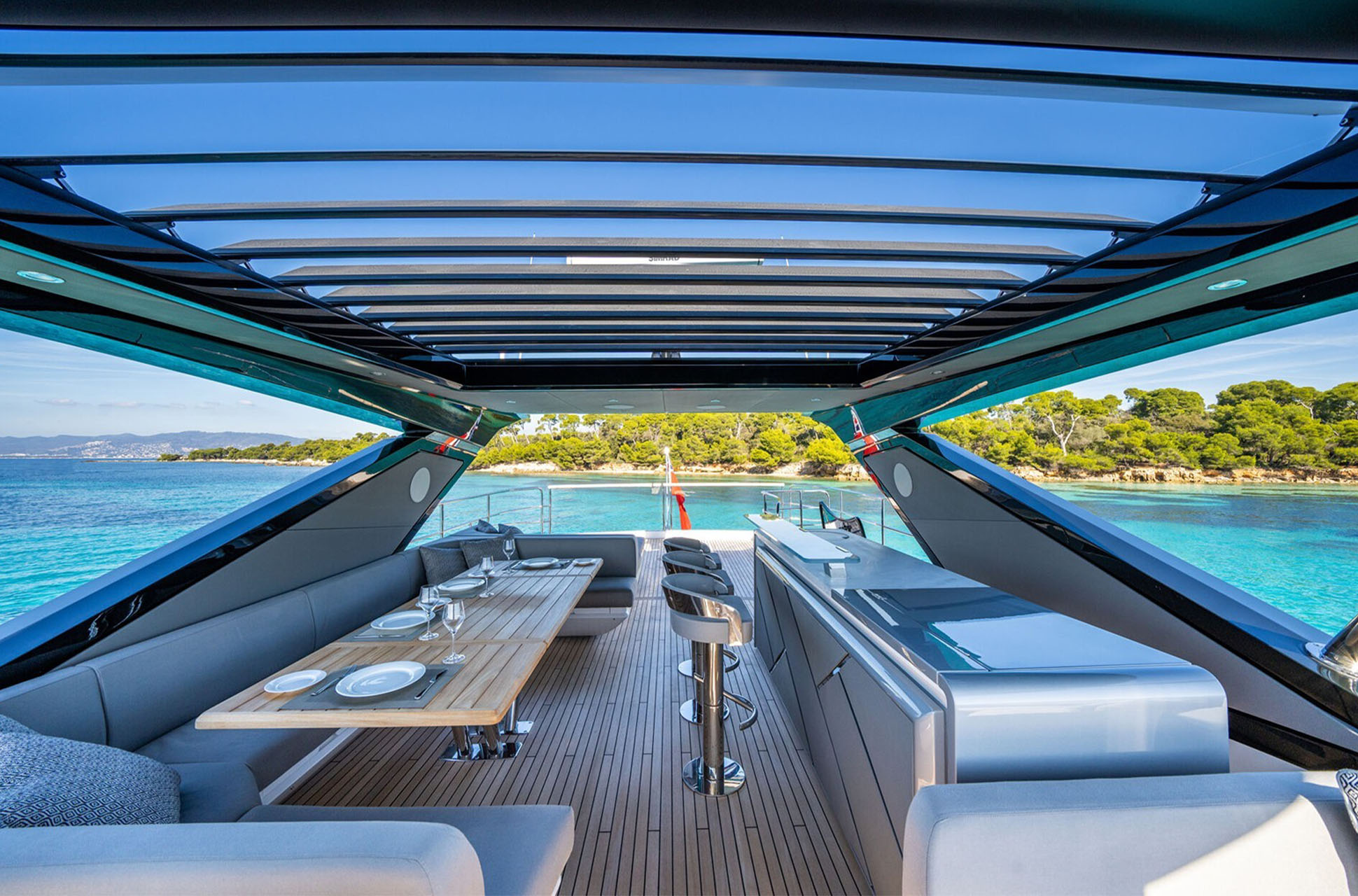 The expansive flybridge offers a brilliant entertaining space with flexible layouts, beautifully appointed furniture, and options such as an infinity spa bath with sun pad. U-shaped seating surrounds a feature wet bar with ice maker, grill, and twin fridges (or optional drawer refrigeration) with the ability to add fixed stools to create a social bar. Forward, companion seating beside the helm ensures everyone shares the view. The foredeck provides another private haven, complete with Portuguese-bridge seating, broad sunpads, and comfortable lounges, all connected by premium side decks.