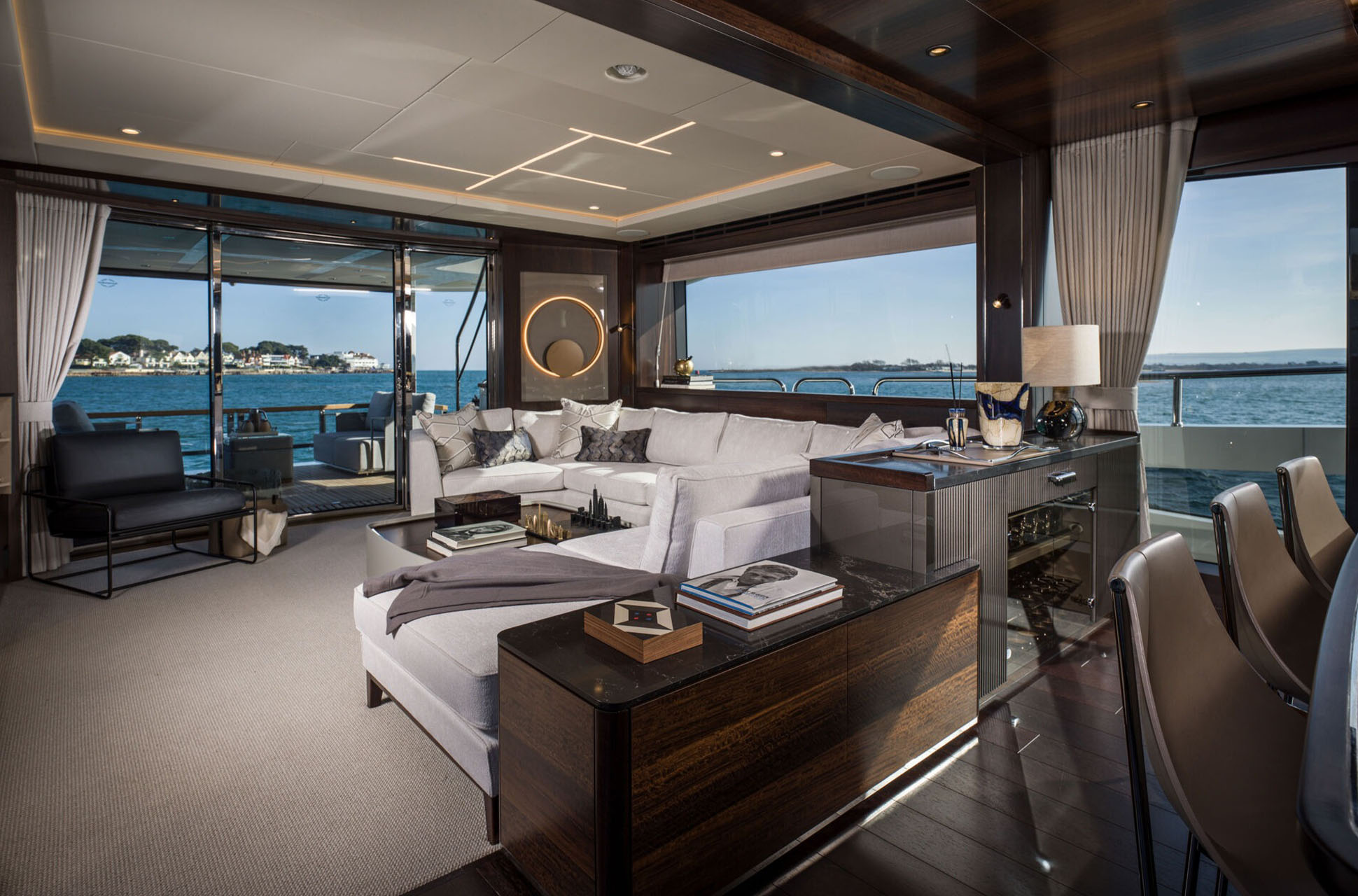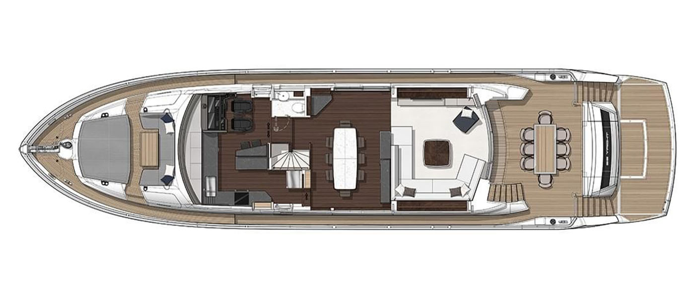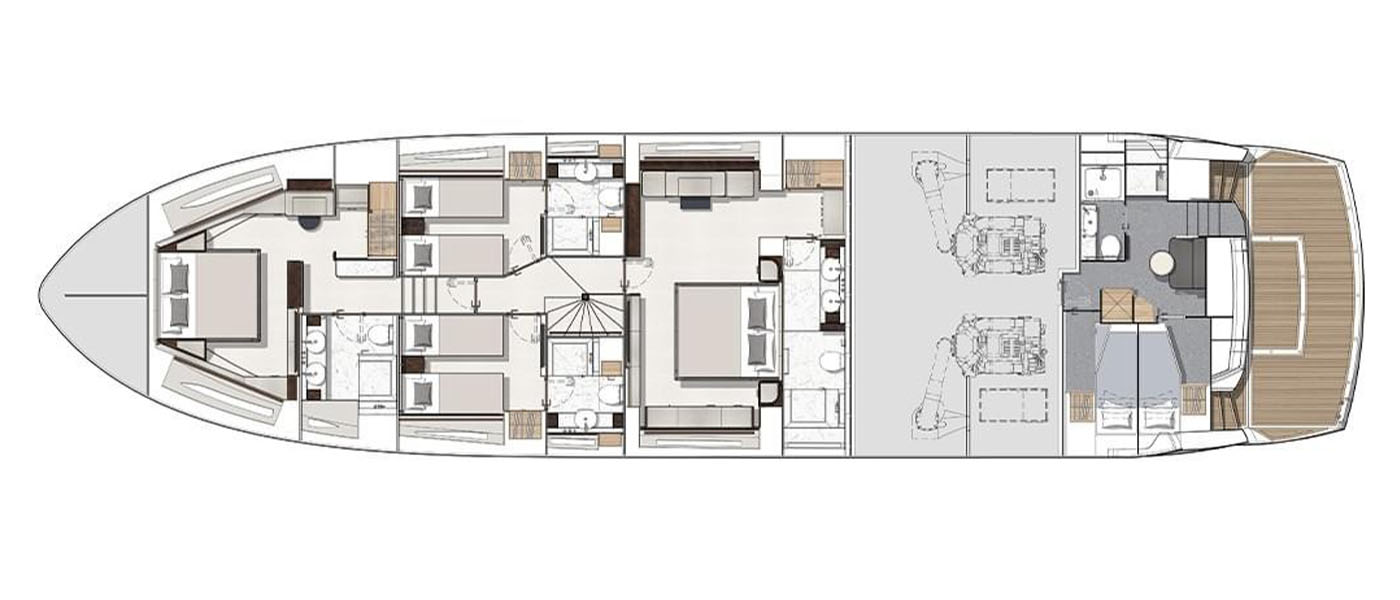 Inside, the main deck is designed for both elegance and function. A large forward galley, with full-height fridge freezer, dishwasher, and space for wine coolers, anchors the open-plan layout and includes a breakfast bar with two stools for casual dining. Owners can choose to close off the galley for complete privacy, allowing crew access via the starboard side and lower helm. Refined interior detailing, such as diagonal stainless inlays, layered textures, and a mix of premium furnishings, creates a timeless yet modern aesthetic, with a variety of finishes available.