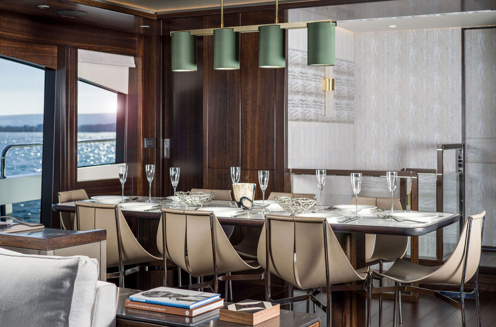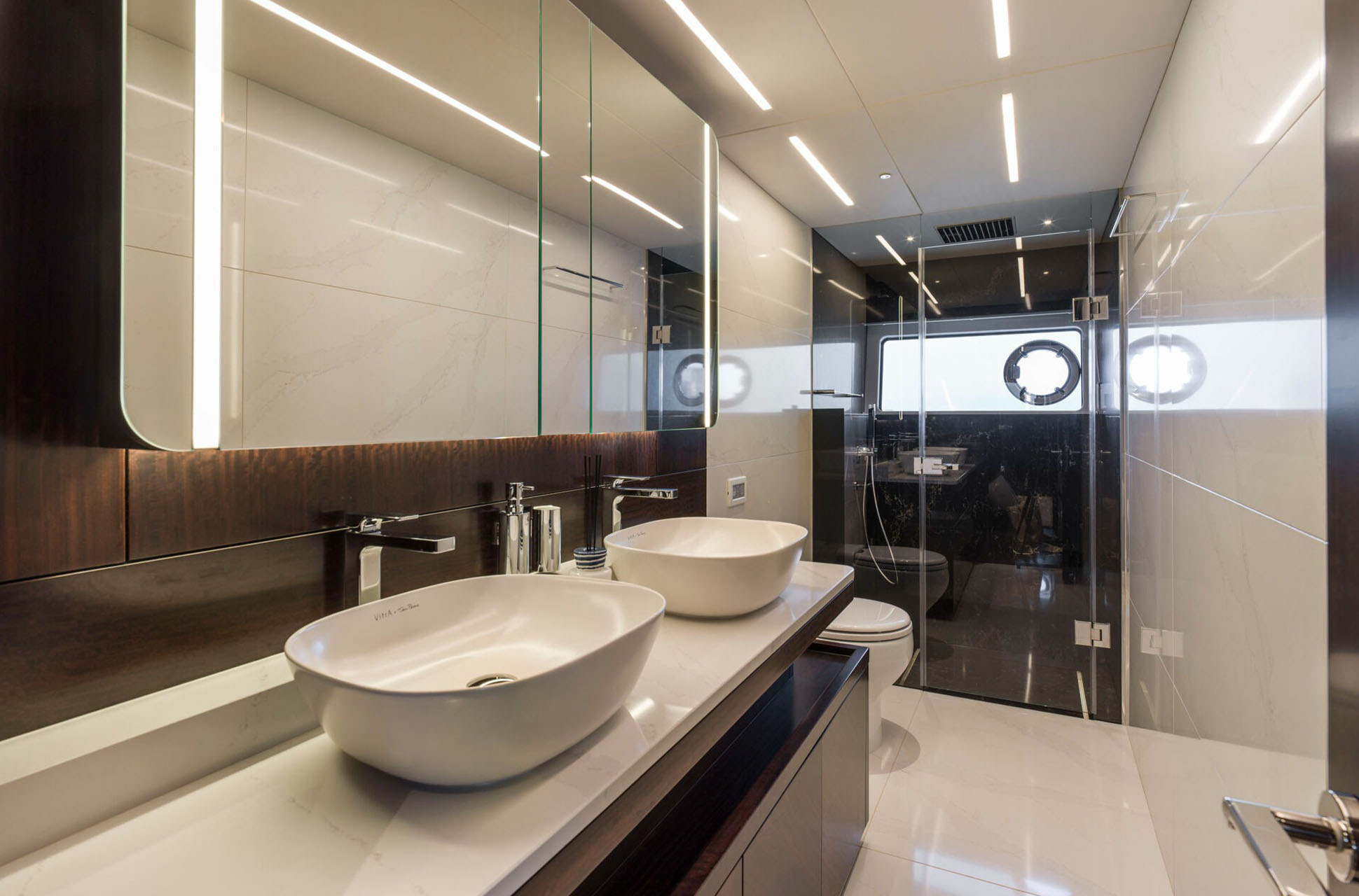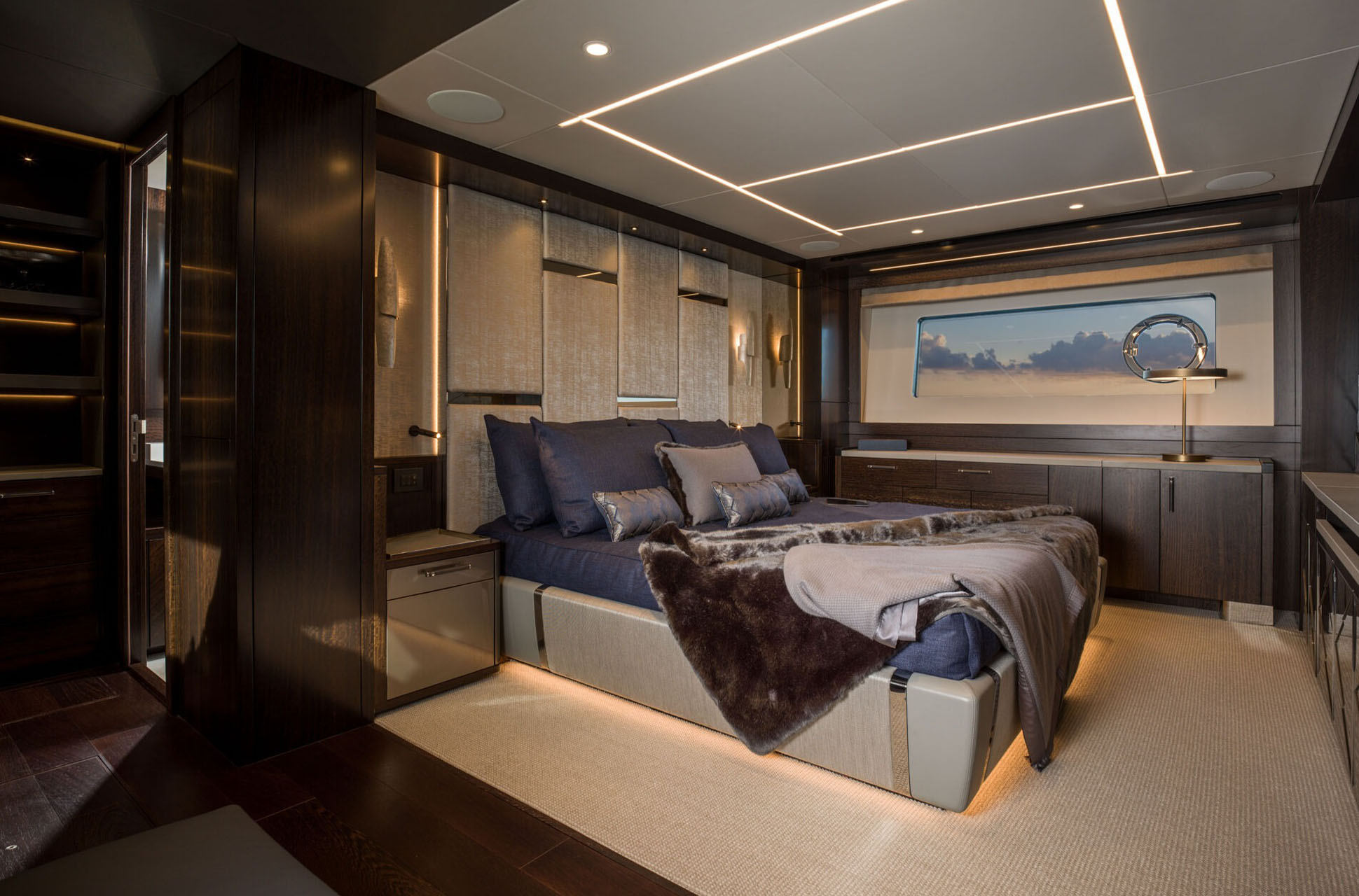 Inside, the main deck is designed for both elegance and function. A large forward galley, with full-height fridge freezer, dishwasher, and space for wine coolers, anchors the open-plan layout and includes a breakfast bar with two stools for casual dining. Owners can choose to close off the galley for complete privacy, allowing crew access via the starboard side and lower helm. Refined interior detailing, such as diagonal stainless inlays, layered textures, and a mix of premium furnishings, creates a timeless yet modern aesthetic, with a variety of finishes available.