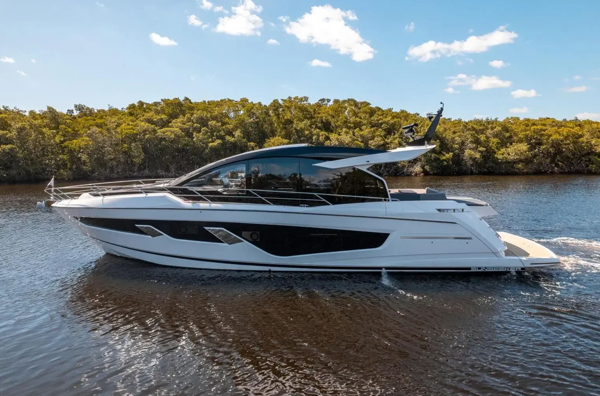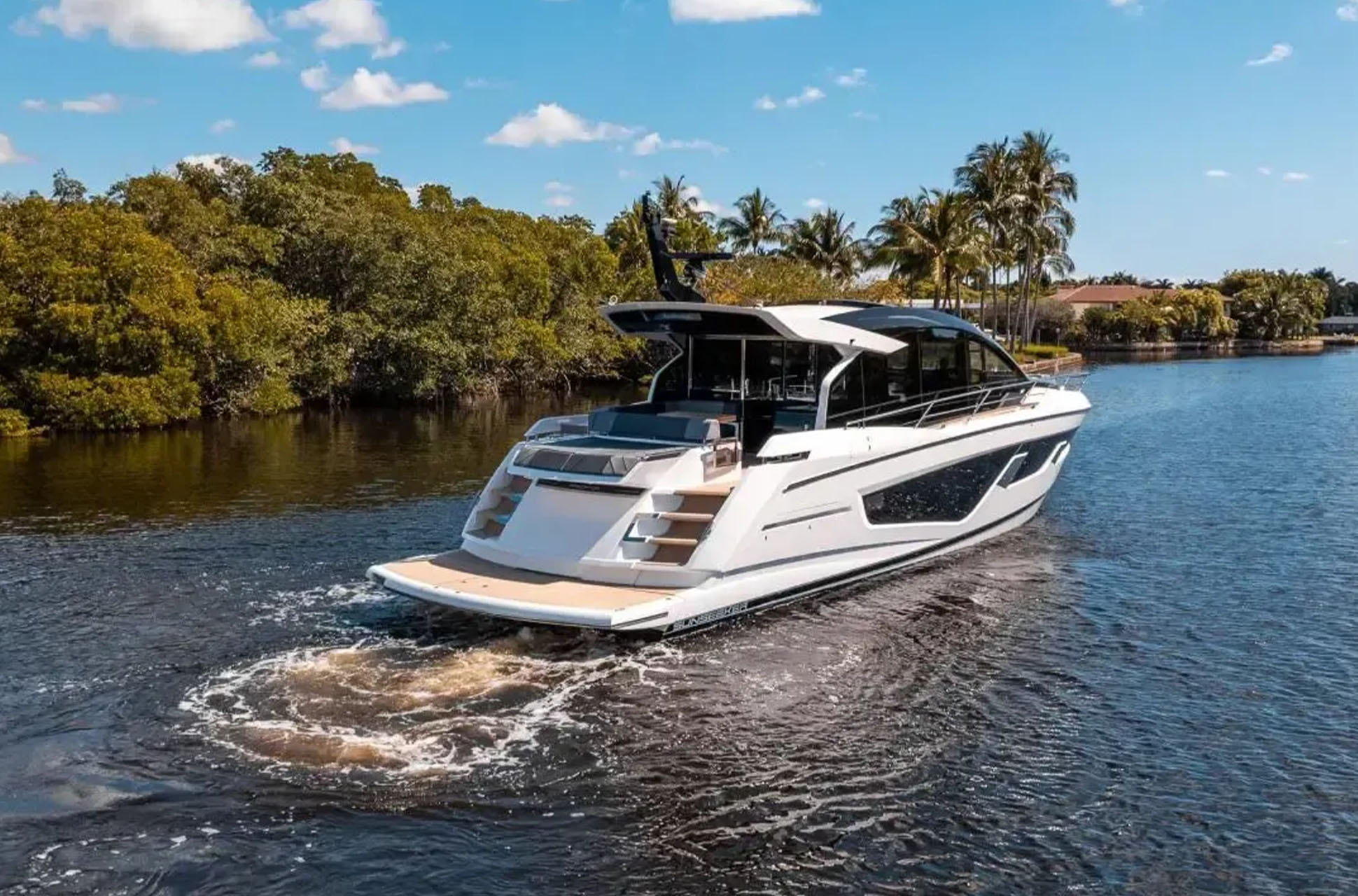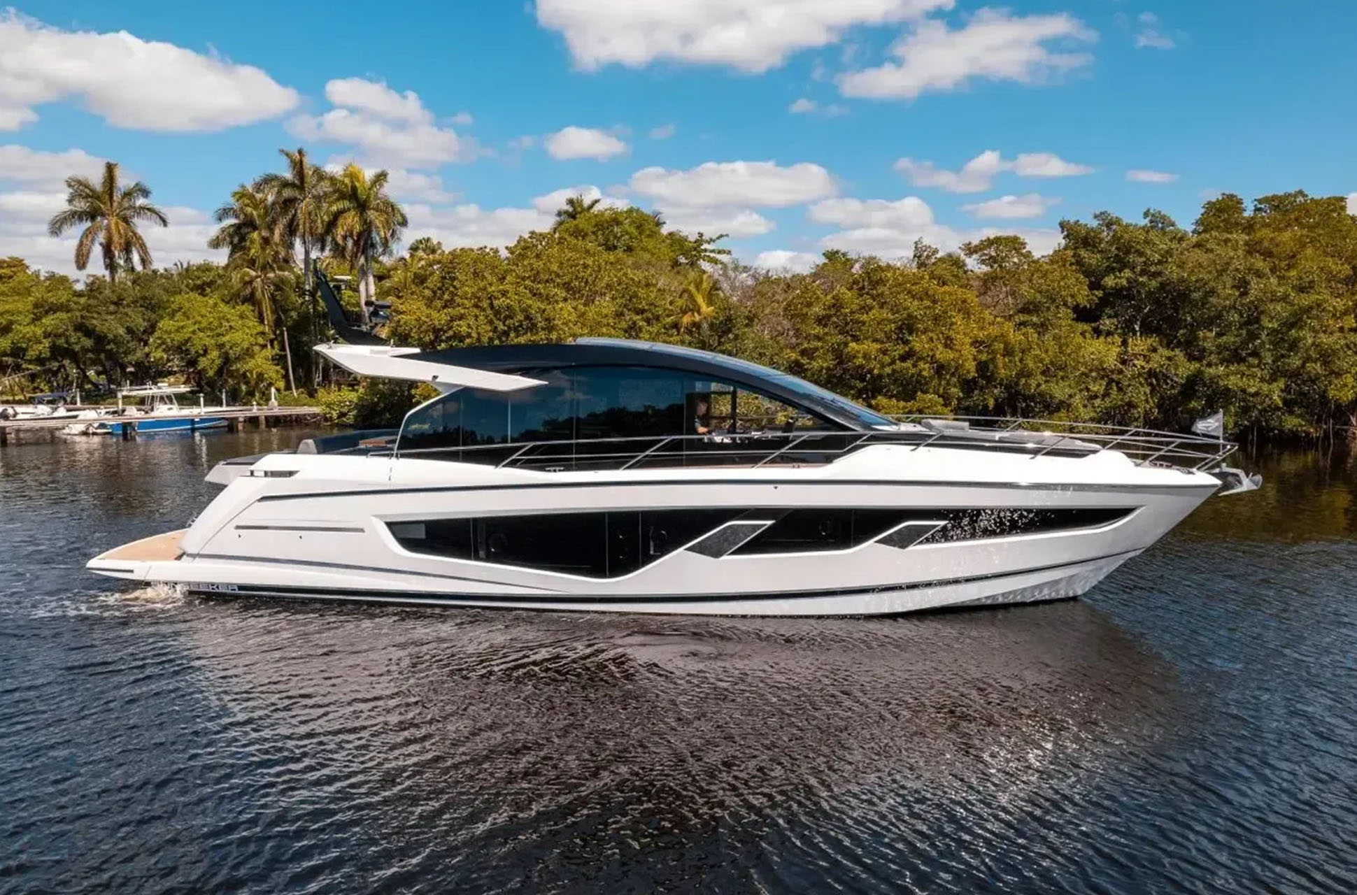 Below deck, the three-cabin layout accommodates up to six guests. The full-beam master stateroom includes a generous en suite, while the forward VIP cabin provides equally refined accommodations. Each guest cabin has its own en suite, and a separate day head adds convenience. Owners can also opt for an office connected to the master, a single-berth cabin, or a lower-deck galley or saloon to tailor the layout even further.