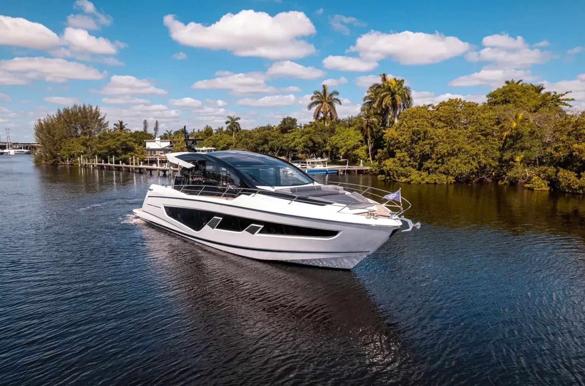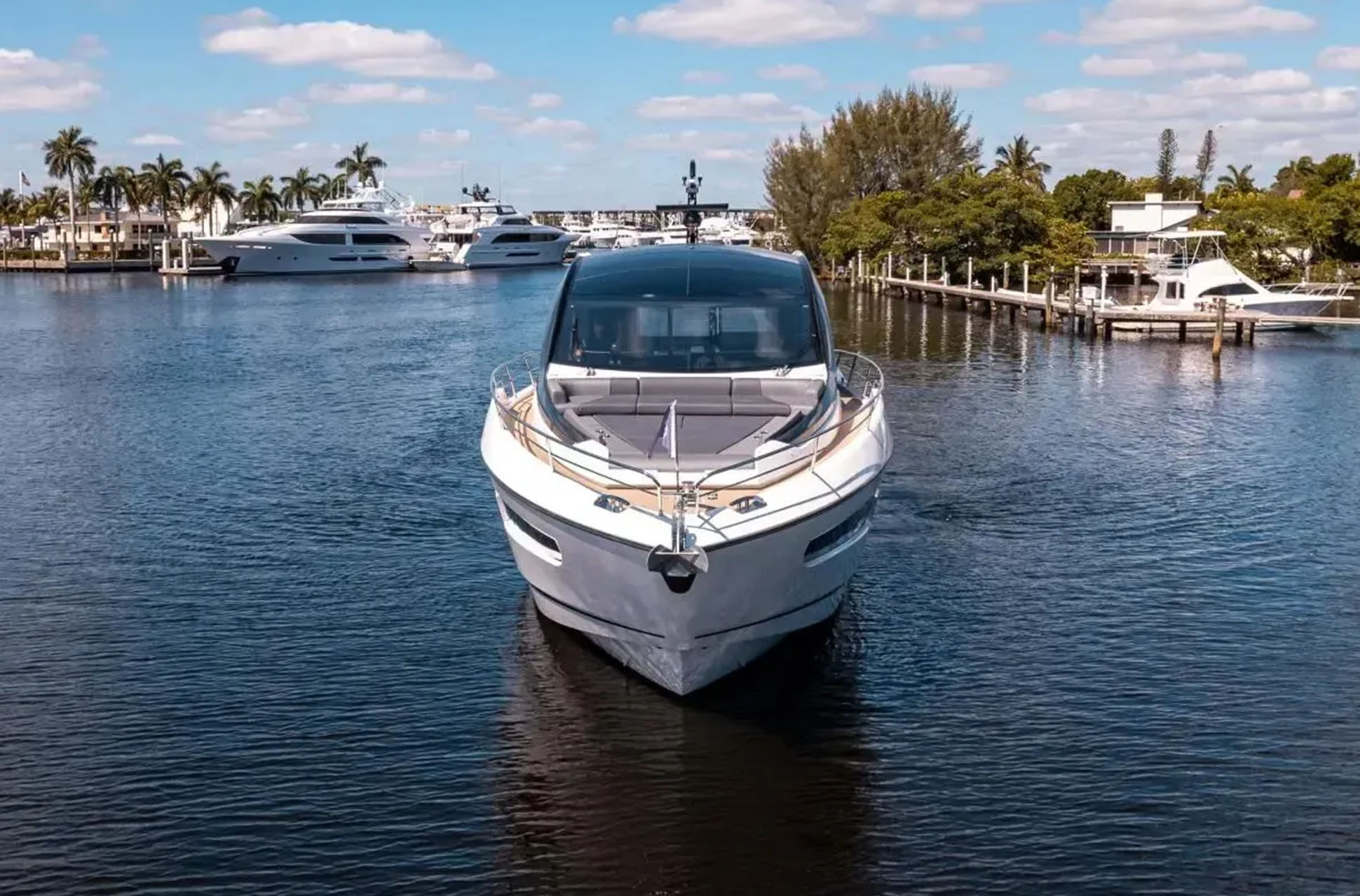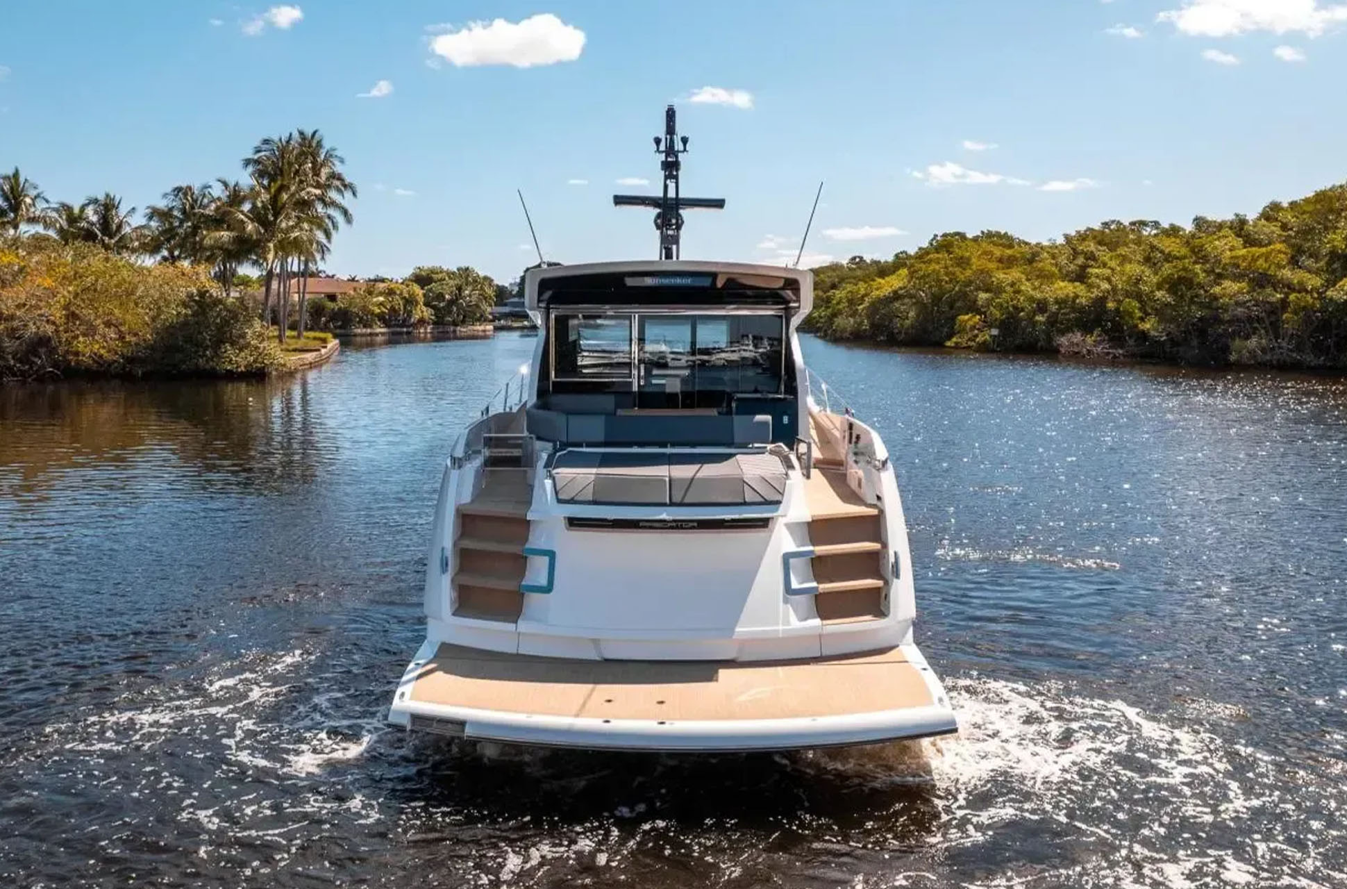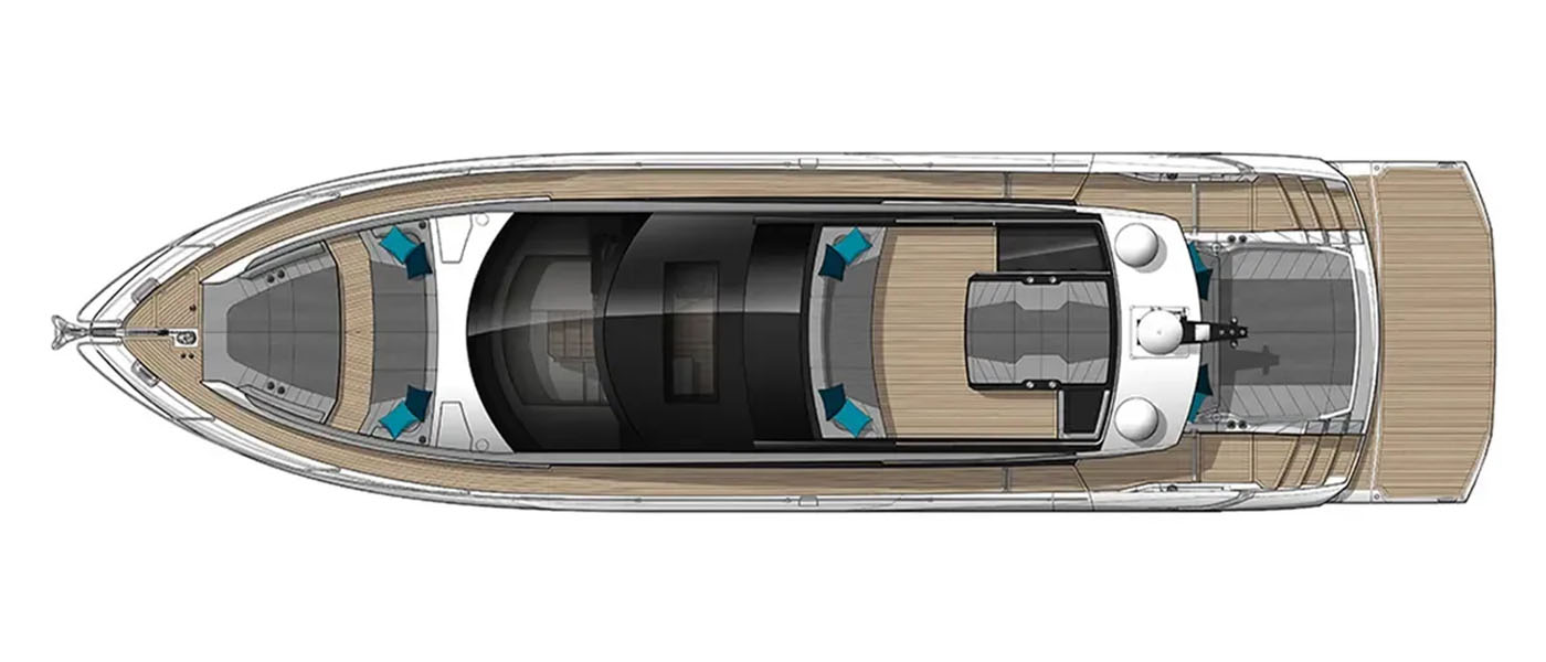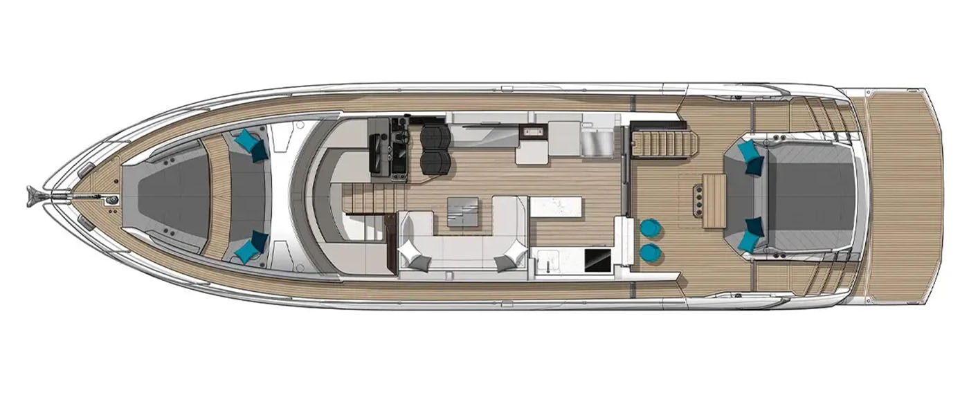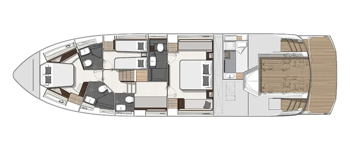 On deck, there are two distinct entertaining areas: a bow lounge with a large sunpad and a spacious cockpit with versatile dining arrangements. Aft, the open-plan layout can be customized to an owner’s preferences, with options such as seating paired with a large sunpad over the garage, a social bar with stools, a fully integrated wet bar, or extended J-shaped lounge seating across the cockpit. These flexible arrangements make the Predator 65 ideal for both families and groups of friends.