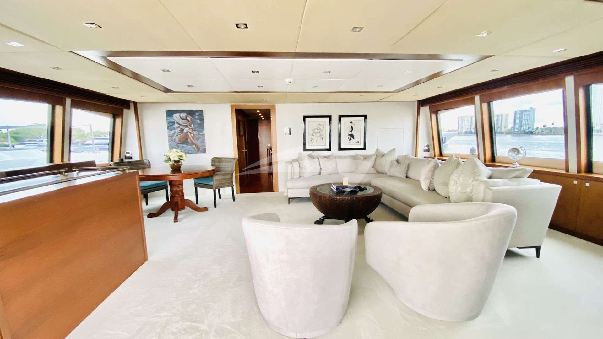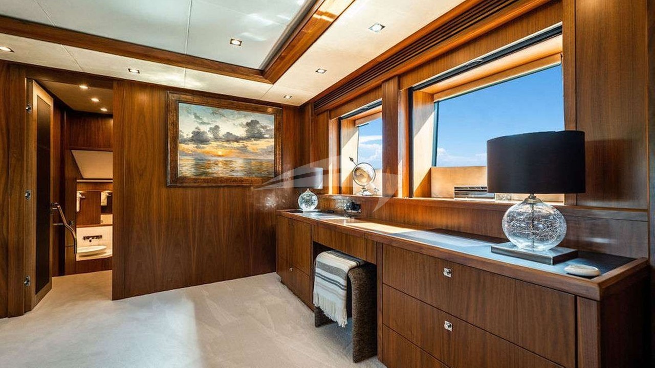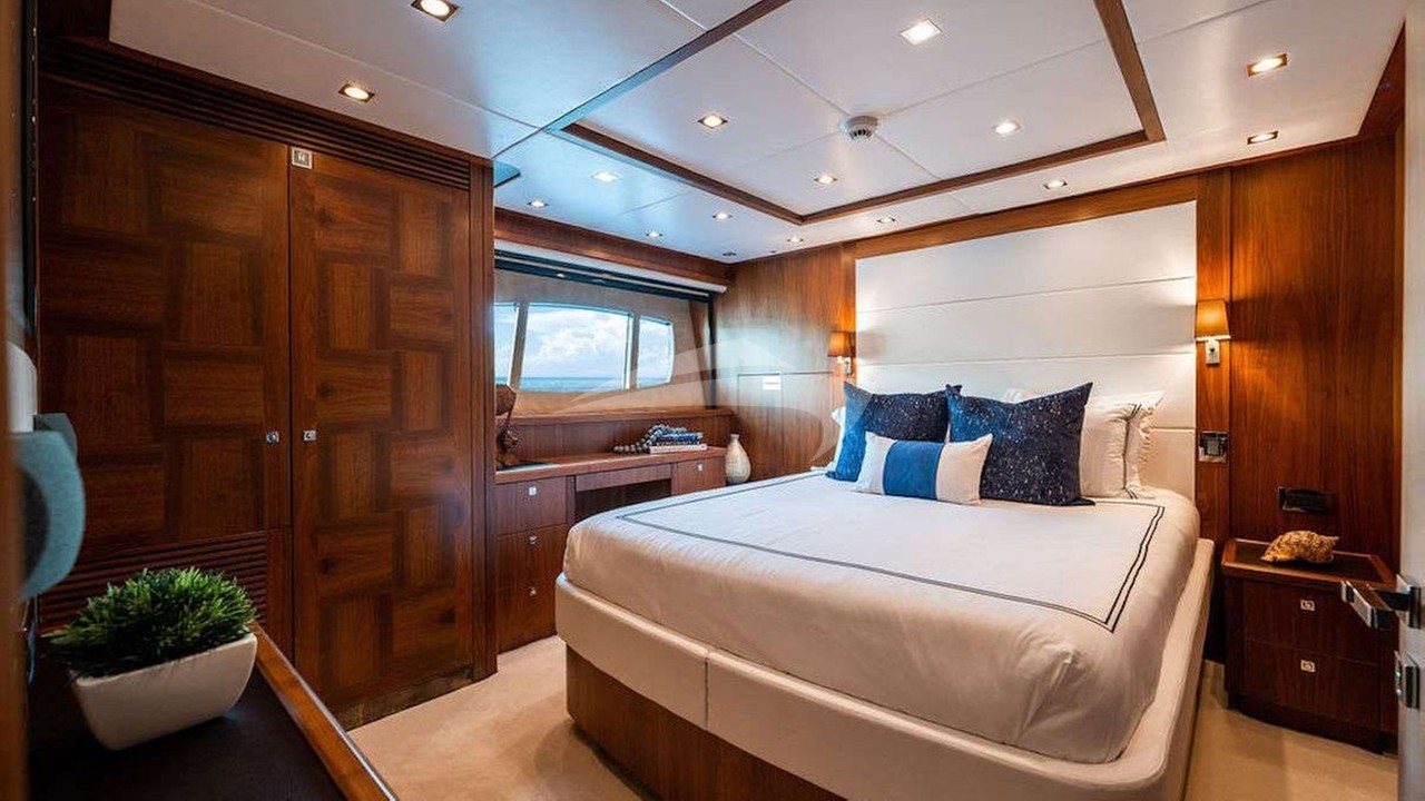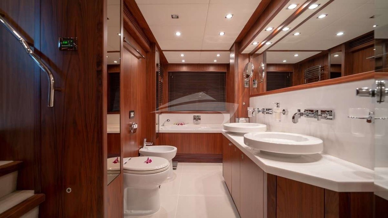 The yacht features six beautifully appointed suites, including a lavish primary suite with a king-size bed and en-suite facilities. Four additional queen-size cabins and a twin cabin, all with en-suite bathrooms, ensure ultimate comfort for every guest. A professional crew of 8, including a dedicated captain, caters to your every need while maintaining utmost privacy in their separate quarters.