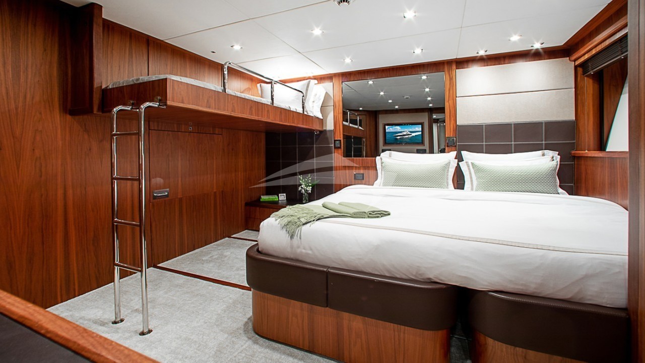 The Master Suite is located on the Main Deck with a bi-level en suite bathroom that includes his and hers sinks and a beautiful walk-in shower.