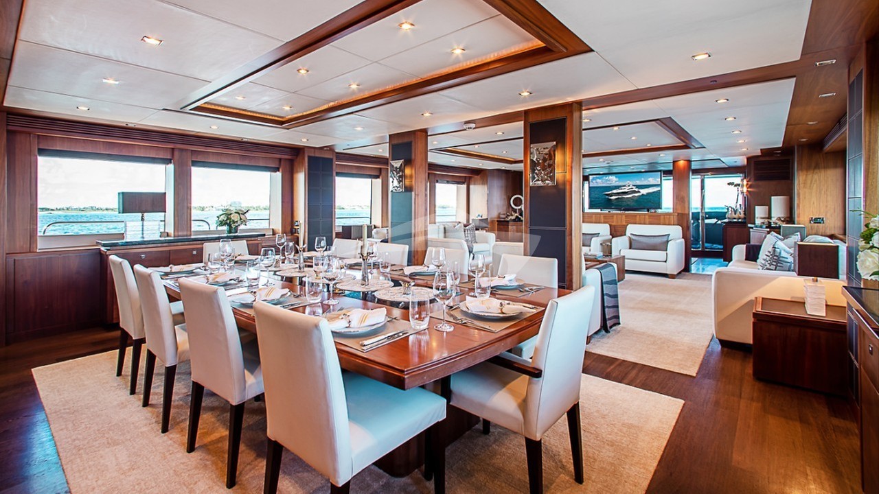 The full-beam primary suite is on the main deck with a bi-level en-suite bathroom that includes his and her sinks and a beautiful walk-in shower. The remaining four en-suite guest cabins are on the lower deck: two VIP suites and two twin cabins (each twin cabin can be converted to a double and have an additional Pullman berth). The sky deck comes furnished with exercise and yoga equipment but shines when entertaining guests with a Jacuzzi, sit-up bar, sun pads, and cooling water misting systems to keep guests relaxed and refreshed. Two folding dining tables provide an al fresco dining option and can seat up to 10 guests when extended. The upper deck aft has a second al fresco dining table that can seat 10 guests that leads into the upper salon with a wet bar, breakfast table, and entertainment area featuring a 55-inch television (one of eight onboard). Entertainment onboard features multiple wireless access points, DirecTV, all major streaming services, Kaleidescape, and video games. ACACIA's main deck includes a formal dining area with walnut wenge wood flooring underfoot that runs the entire deck from the lounge to the master stateroom. Just behind the dining area is a large formal salon that leads out to the aft deck, where you can find couches for relaxing above the swim platform.