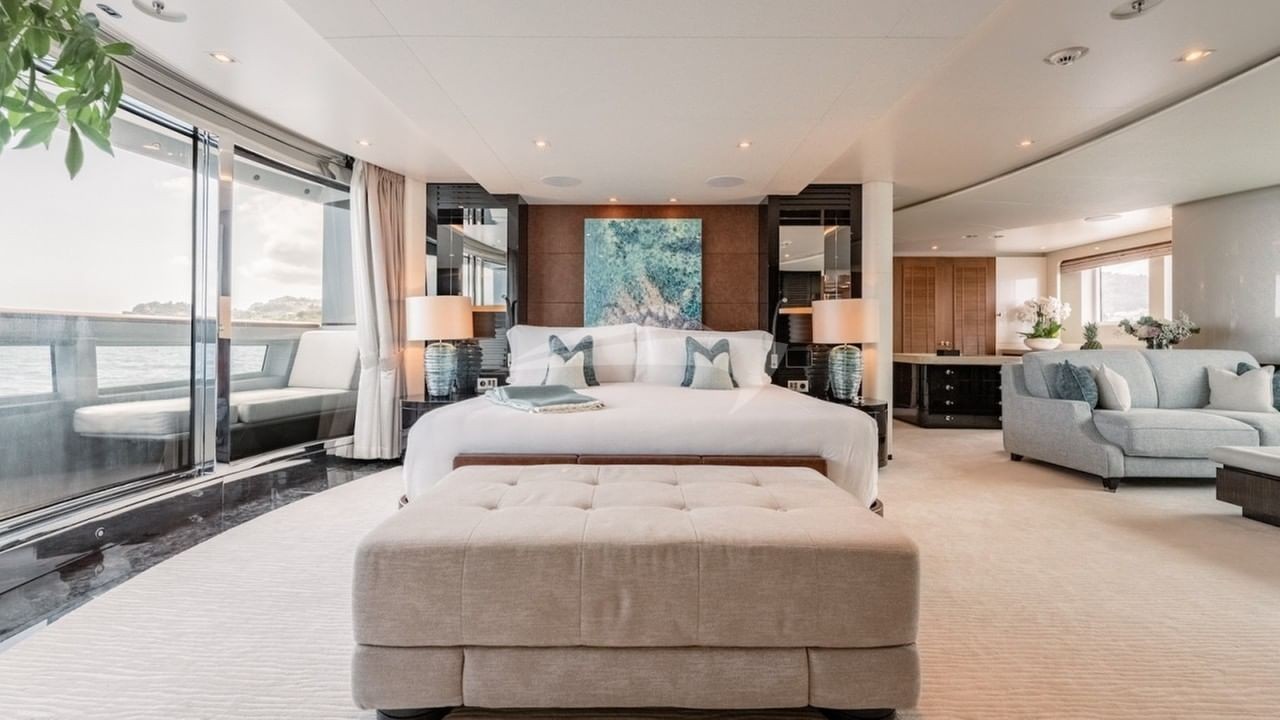 1 x full-beam Master suite with a king size bed on main deck. Two private balconies off master stateroom with sunbeds - cannot be seen from any part of the yacht.