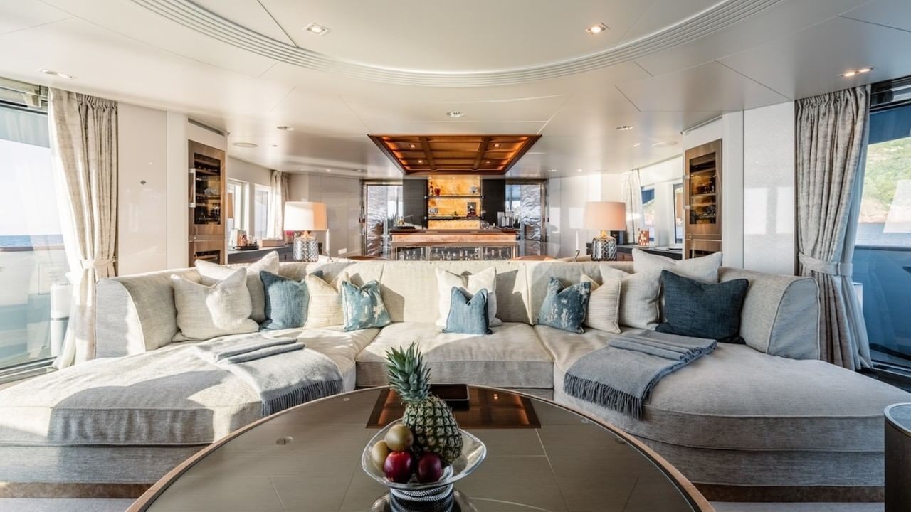 Large windows and glass balustrades ensure an abundance of natural light, creating a bright and airy atmosphere throughout. The main saloon and elegant sky lounge, complete with a bar, cinema screen, and self-playing piano, are designed for comfort and style. For those seeking wellness, there is a fully equipped gym on the sundeck with panoramic views, as well as a luxurious spa with a sauna, hammam, Jacuzzi, and massage room. For more energetic pursuits, AFTER YOU offers an impressive selection of toys and is an RYA Approved Centre, with crew support available for windsurfing and diving.