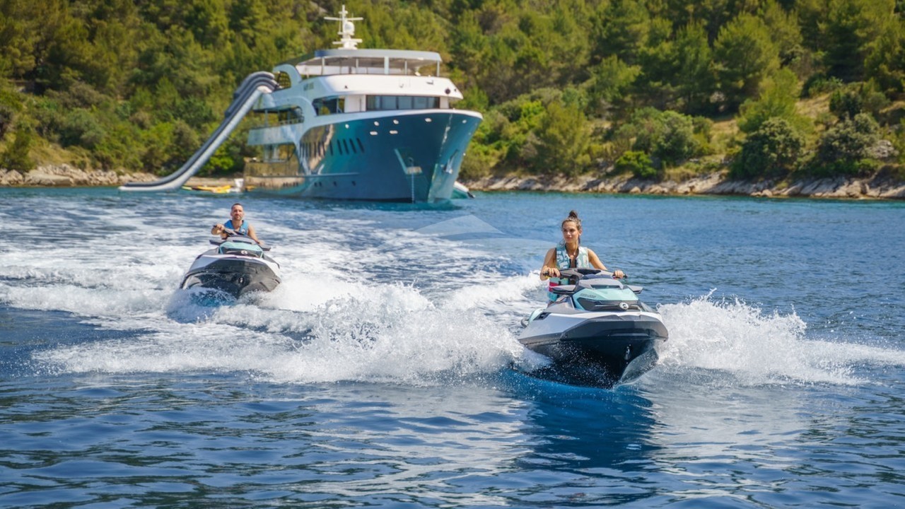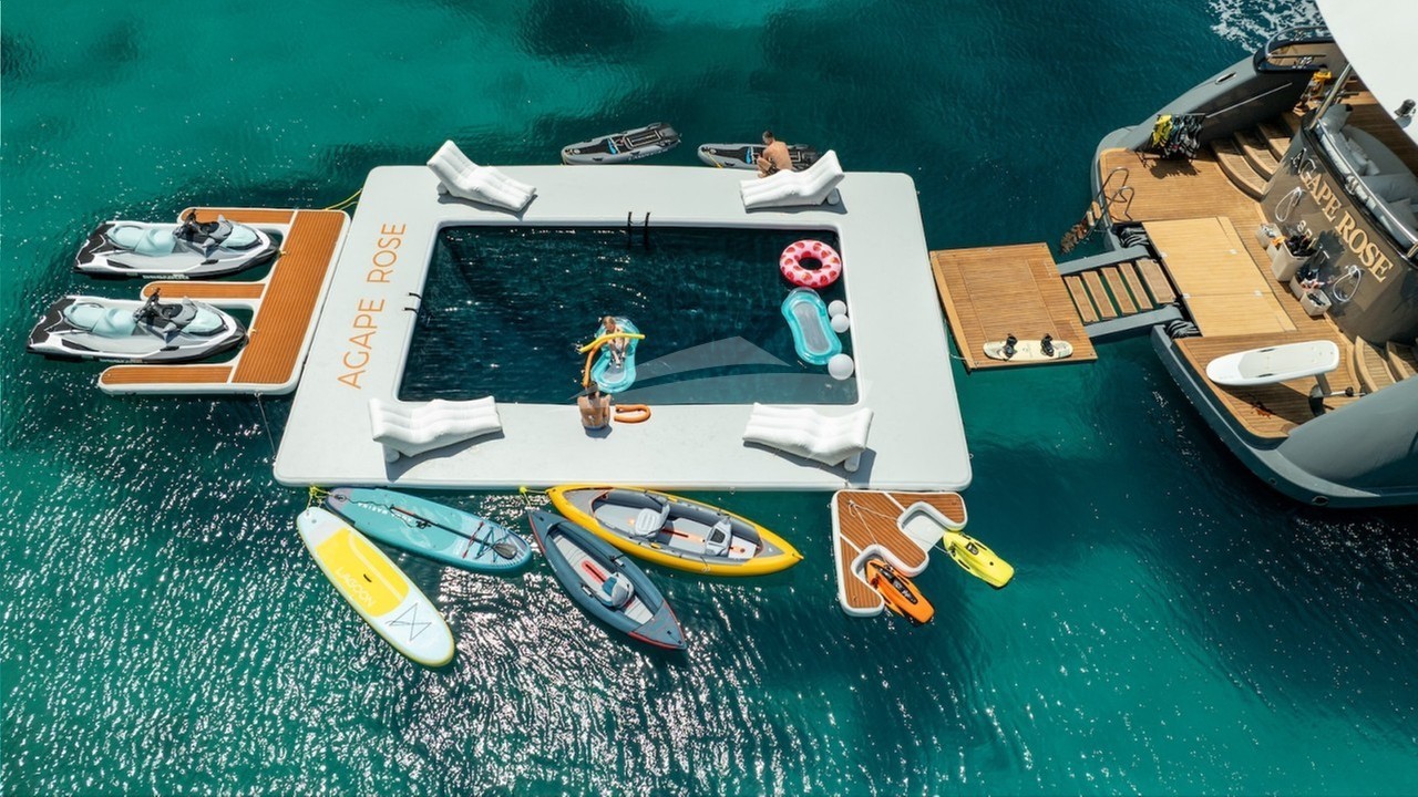 The features don’t stop there, AGAPE ROSE is packed with all the crucial water toys charterers might want including; 2 x Sea-Doo jetskis, 2 x Seabobs, 1 x Fliteboard eFoil, 4 x SUPs, 2 x kayaks, an inflatable slide and an inflatable jellyfish pool / swim platform to enhance the water toy experience further. You can also find adult and junior water skis, wakeboards and inflatables all towed behind one of her two 6.5m 150hp tenders designated solely for towing toys and transferring guests in style.