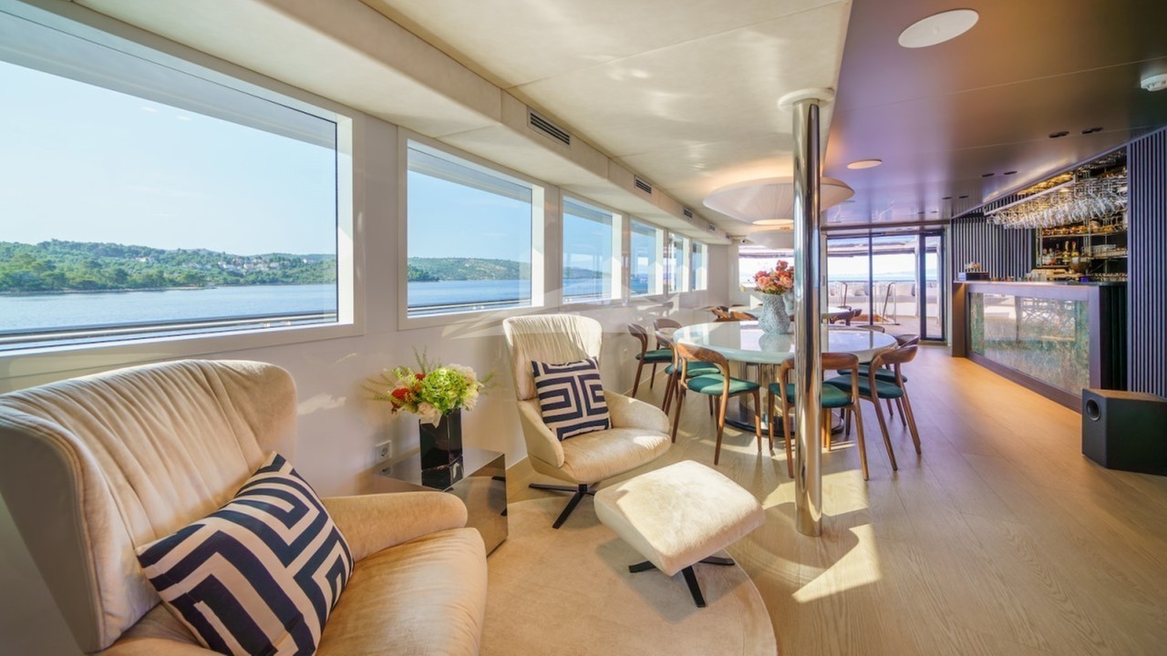 An invitingly large main saloon on the upper deck creates a space for guests to dine at either of the two large round tables, relax on sofas and enjoy the bar whilst socialising altogether in one fantastic saloon space. Dining options extend on deck with two large dining tables comfortably seating 12 each. This flexibility offers indoor or on deck dining for up to 24 guests comfortably.