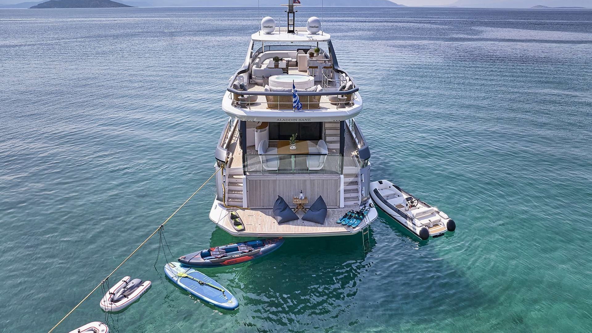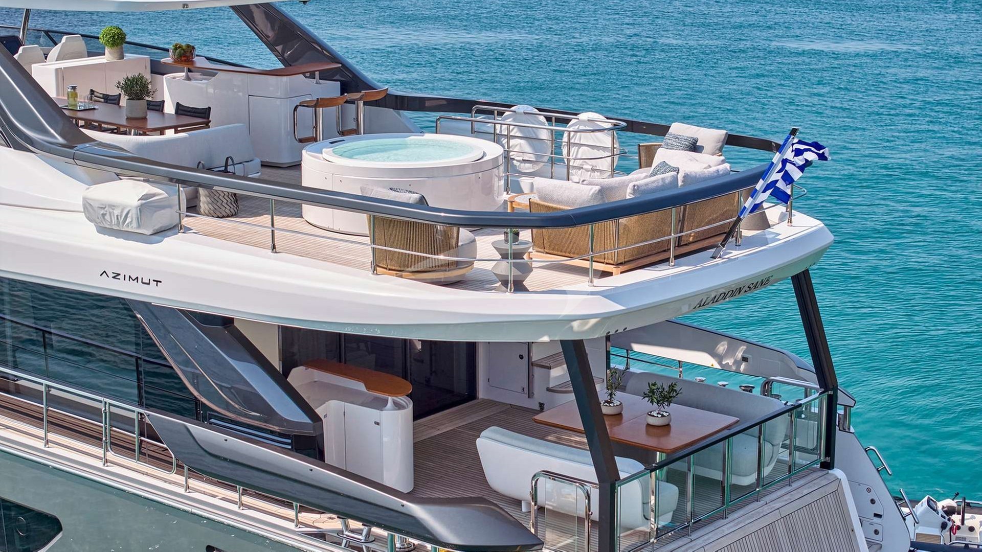 Aladdin Sane Yacht Charter is a 85' superyacht built by Azimut in 2024. She sleeps 8 and holds 4 crew and is located in East Mediterranean and East Mediterranean. She can be booked for a private luxury charter at a rate of $81,543 per week. Please check with your Denison Charter Specialist for more info.