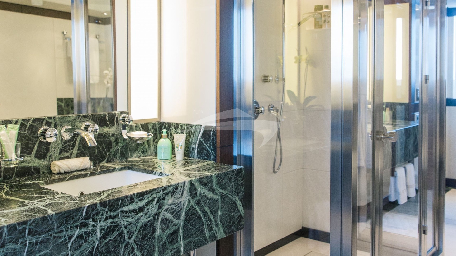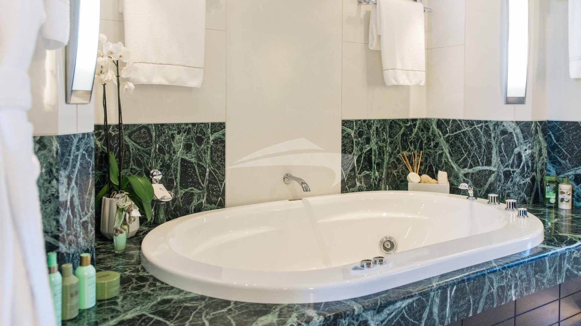 1 x Master stateroom full beam with large bathroom including tub, separate shower and his/hers water bassins.