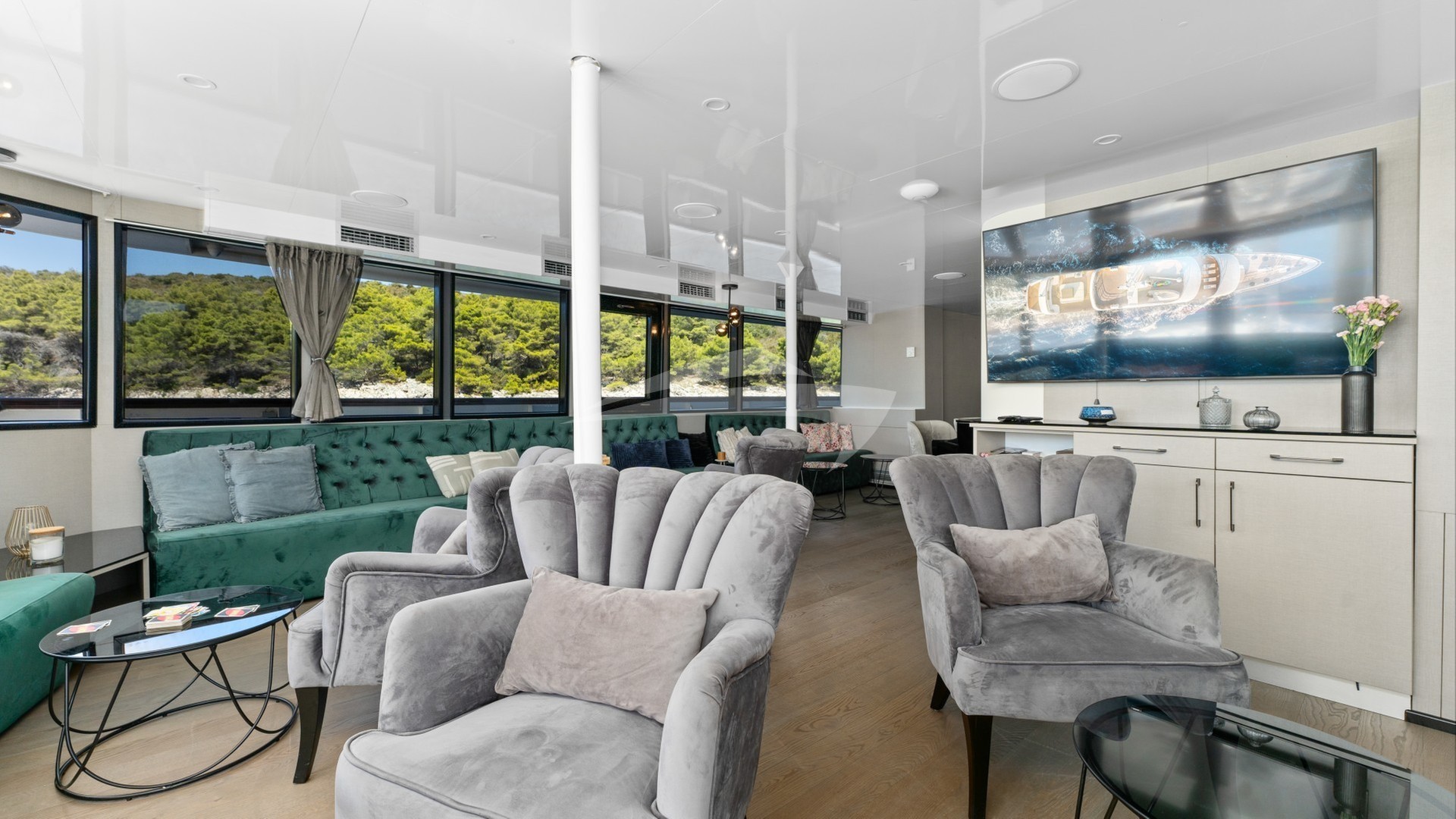 At 52 meters, Alfa Mario is one of the largest Croatian yachts of its type. This 16 cabin yacht can accommodate up to 32 people, hosted by 11 crew. You can enjoy the jacuzzi, sauna, and gym on deck. To enjoy a relaxed vibe, there is a big lounge bar with a piano and a well-stocked bar in the salon.
