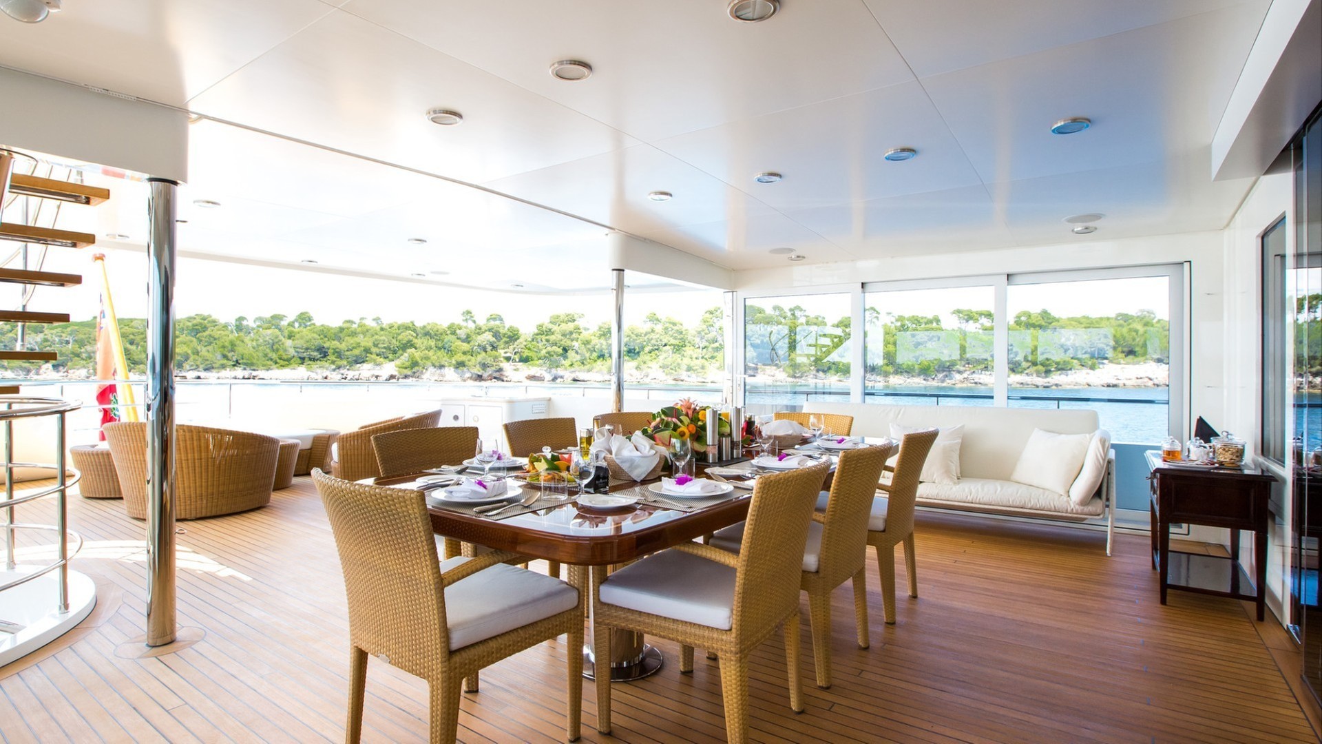 She boasts an array of sumptuous living areas laid out invitingly to create a warm and welcoming atmosphere onboard. Multiple lounge and dining areas are spread across her open decks. On the main deck aft, full-length windows connect the salon with a large covered seating area in the stern.