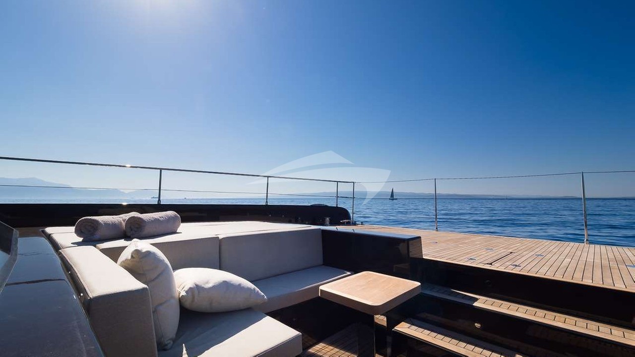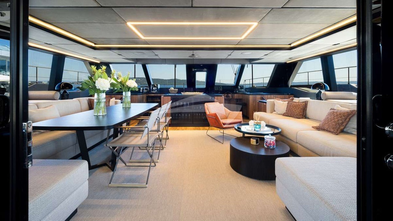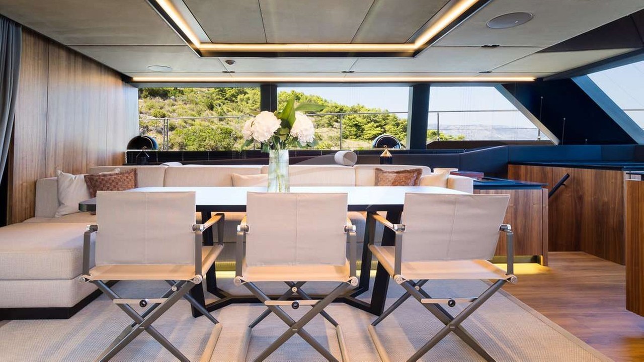 Her open-plan interior creates a seamless transition between indoor and outdoor, creating a spacious dining and socialising area flooded with natural light. A foredeck terrace and flybridge offer unrivalled comfort and additional relaxation spots. With ample outdoor space, guests can enjoy alfresco dining and water sports with ease.