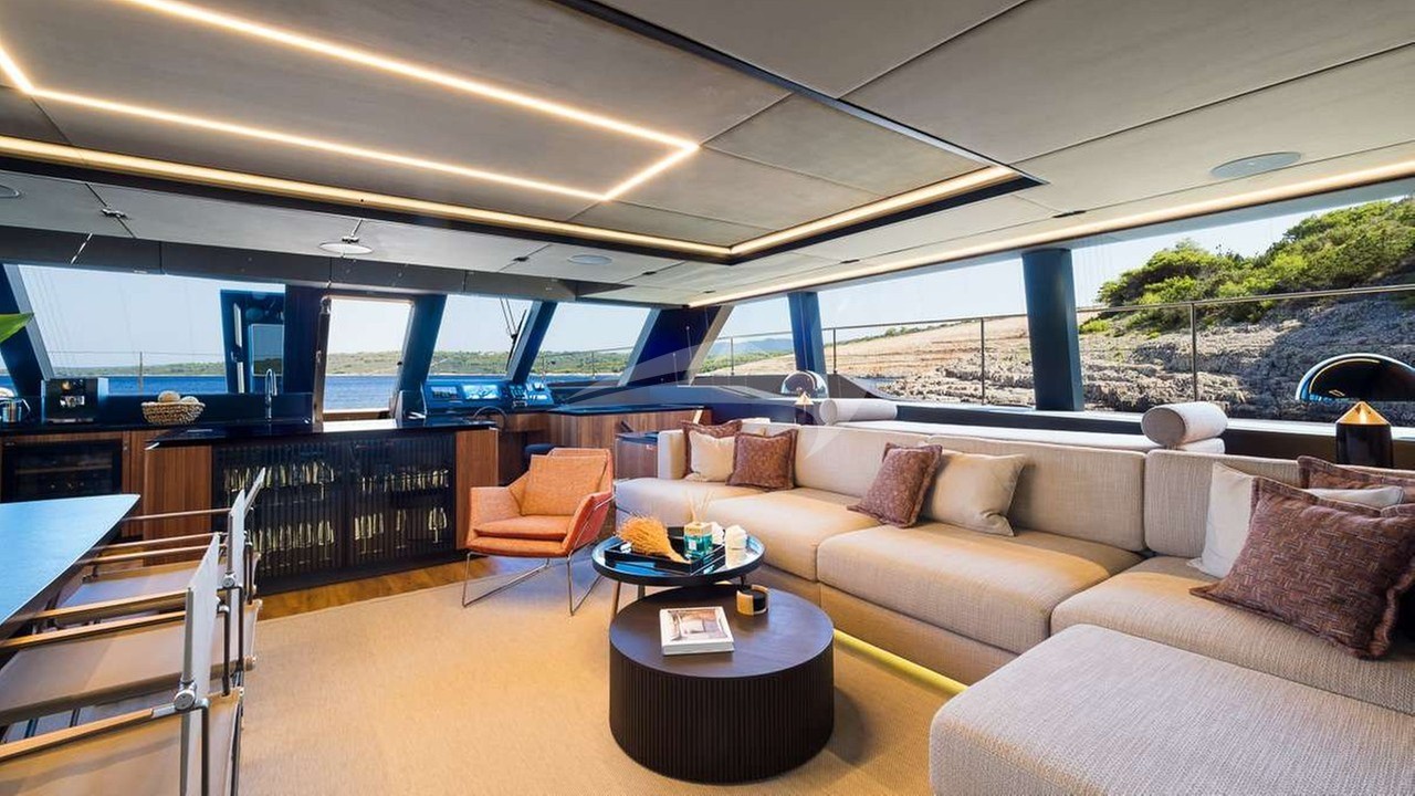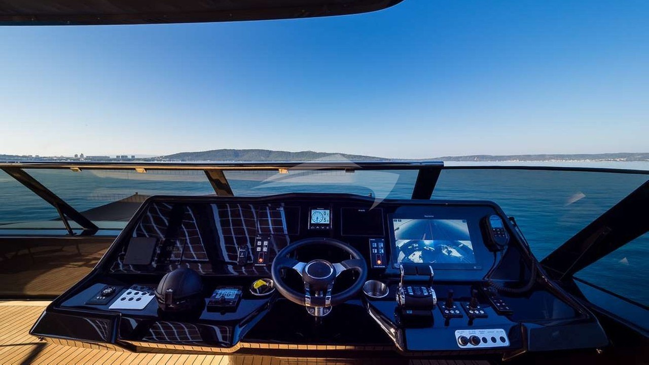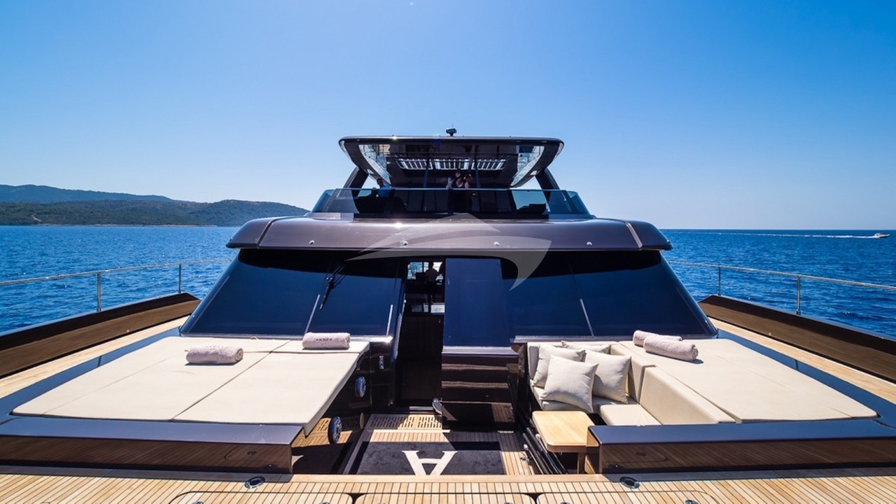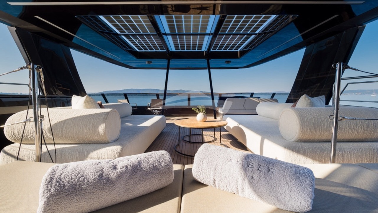 Her open-plan interior creates a seamless transition between indoor and outdoor, creating a spacious dining and socialising area flooded with natural light. A foredeck terrace and flybridge offer unrivalled comfort and additional relaxation spots. With ample outdoor space, guests can enjoy alfresco dining and water sports with ease.