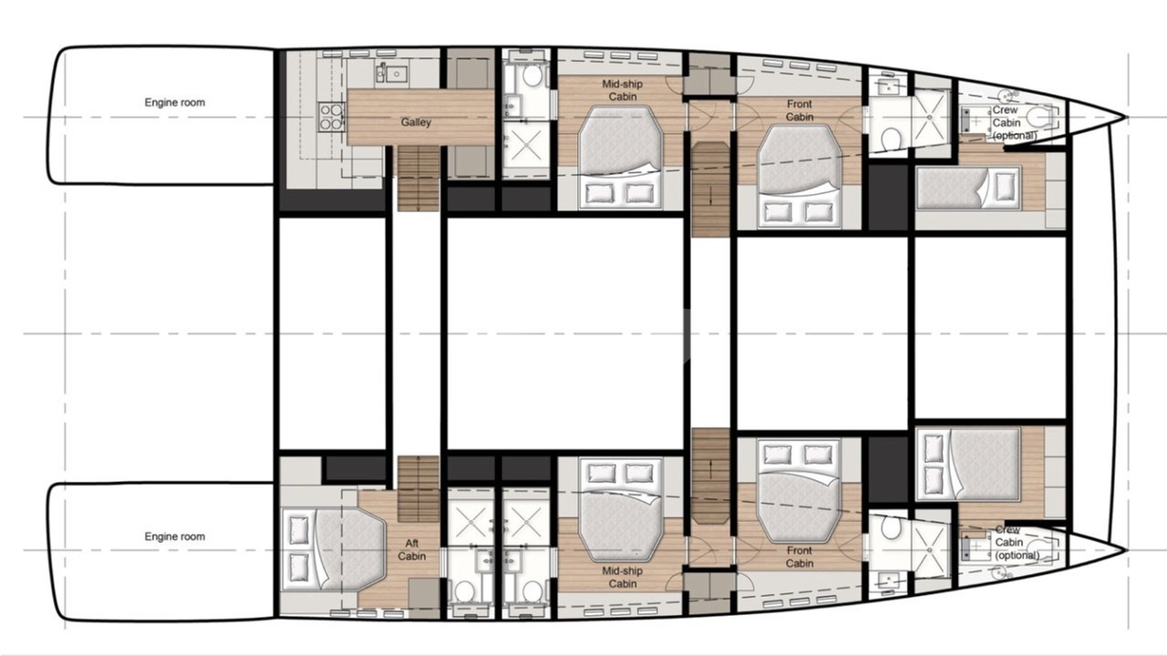 The 70 Sunreef Power boasts exceptional living spaces, combining comfort, performance, and advanced technology. As the most successful model in the yard's lineup, its elegant design, expansive interior and exterior, stability, safety, and fuel efficiency make it perfect for charters. AMBER ONE can accommodate up to 8 guests in 4 luxurious ensuite cabins, with crew quarters for added privacy.