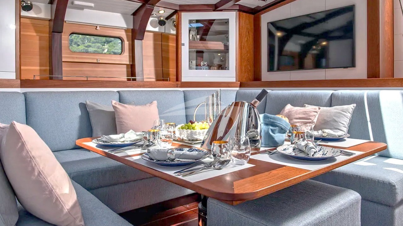 Every detail of her is custom built, hand made with a beautiful and stylish mahogany finish, combined with white satin finish and lots of light. She offers three superb staterooms, with dedicated bathrooms, for six guests including a forward master suite comprising a king-sized bed and en suite bathroom. The salon provides a spacious and comfortable seating area.