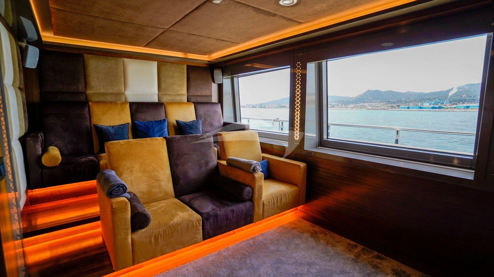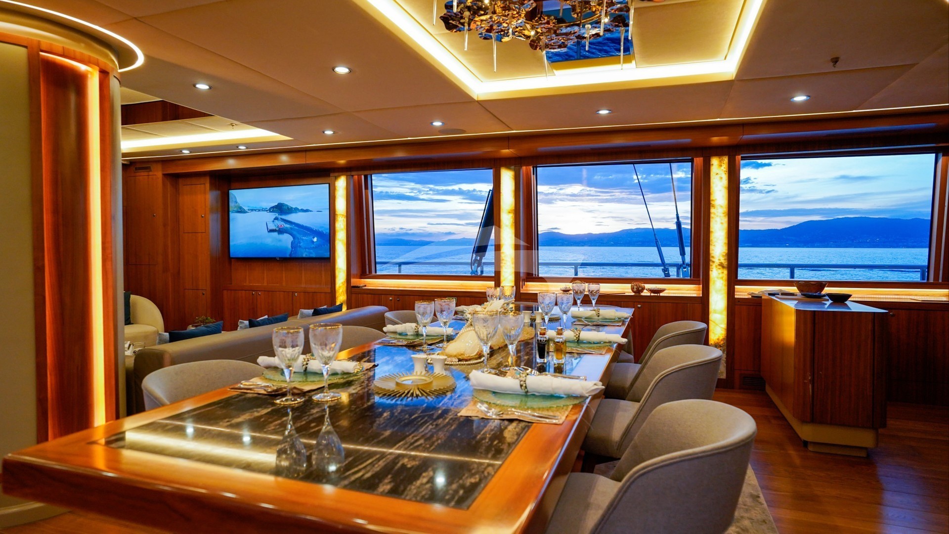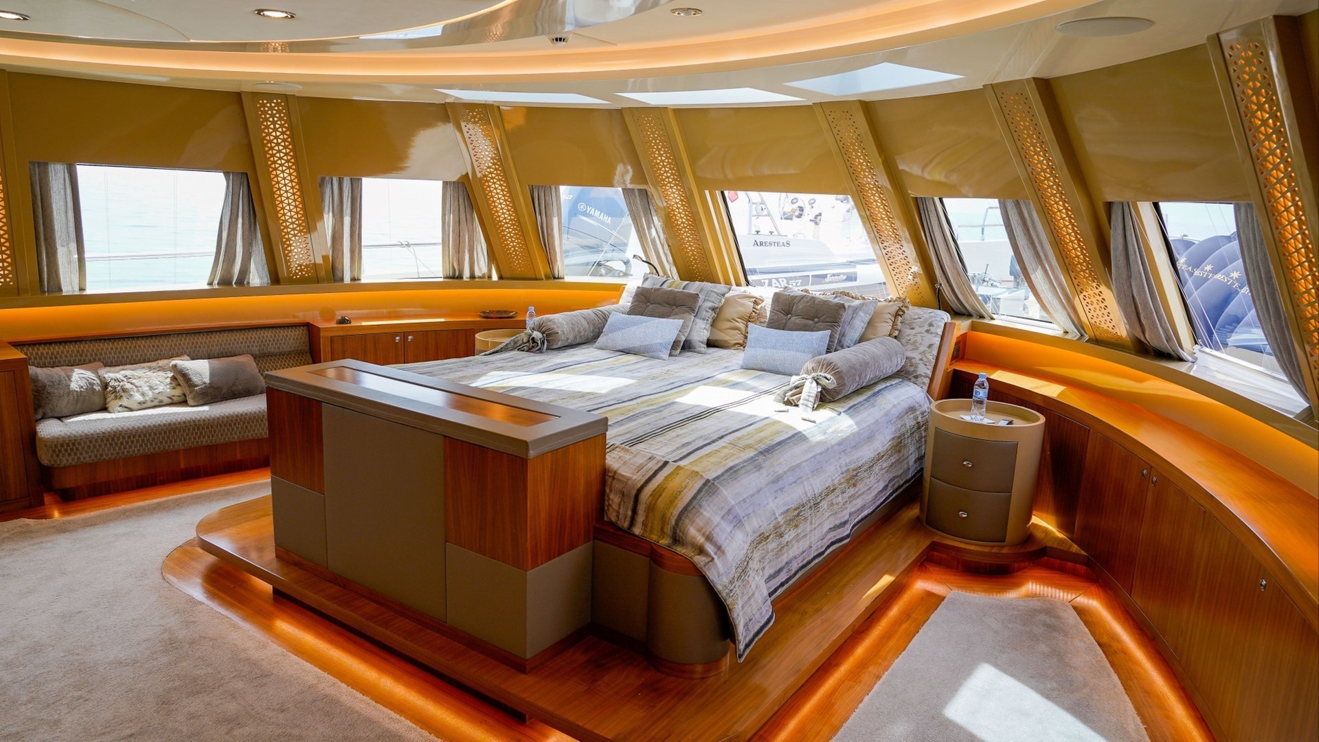 Decorated in the style of an opulent villa, combining earthy tones and natural materials such as leather, treated woods and marble, ARESTEAS provides every amenity for her guests, including a cinema room, fitness center with gym, infrared Himalayan salt sauna, and massage room. The upper salon features a bar, games table, and TV, while the main salon has an expansive lounge, bar, and separate formal dining space, surrounded by large windows for views day and night.
