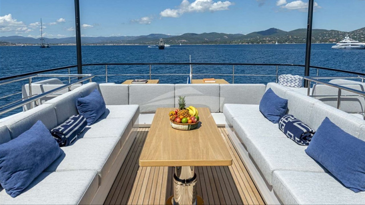 The aft deck houses generous dining and sunbathing areas. The hydraulic swim platform allows easy access to the sea.