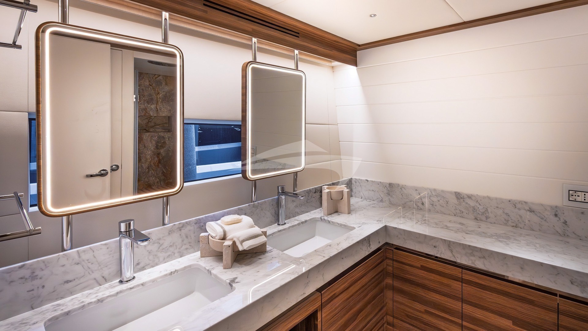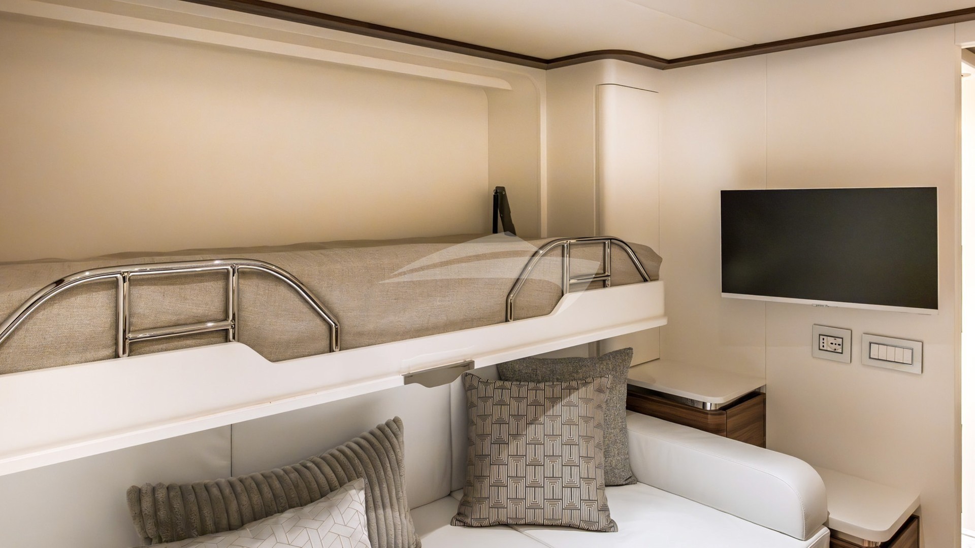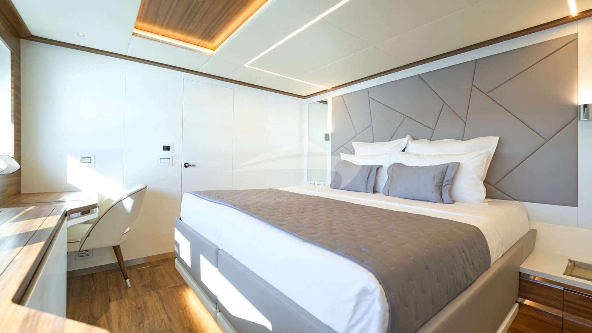 Up to 9 Guests in 4 en-suite stateroomsGuest Cabin Configuration:Large port hull Master cabin with convertible beds (King-size or 2 Twins), walk-in dressing room, en-suite bathroom with shower and double designer sinksStudio to port hull, convertible to Double cabin with additional Pullman bed, office desk, closet and en-suite bathroom (Studio can be connected to Master cabin as an extended adjacent living room/office or a Guest cabin for Starboard hull VIP cabin with convertible beds (King-size or 2 Twins), walk-in dressing room, en-suite bathroomStarboard hull Guest cabin with convertible beds (King-size or 2 Twins), closets, en-suite bathroomMain deck central platform with fully equipped galley to port, forward interior dining area for 9, central entertainment center with large 65” LED TV, large panoramic saloon to port with lounging sofa, wheelhouse with chart table, stairwells to both hullsDay head and utility room to port side in front of the saloon
