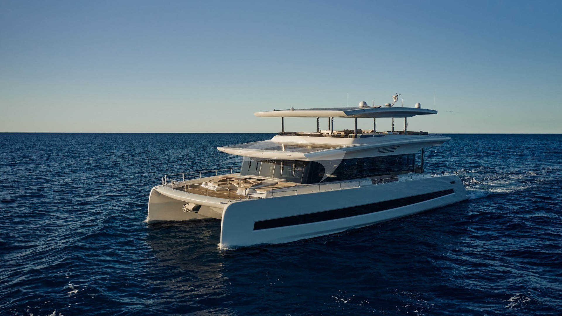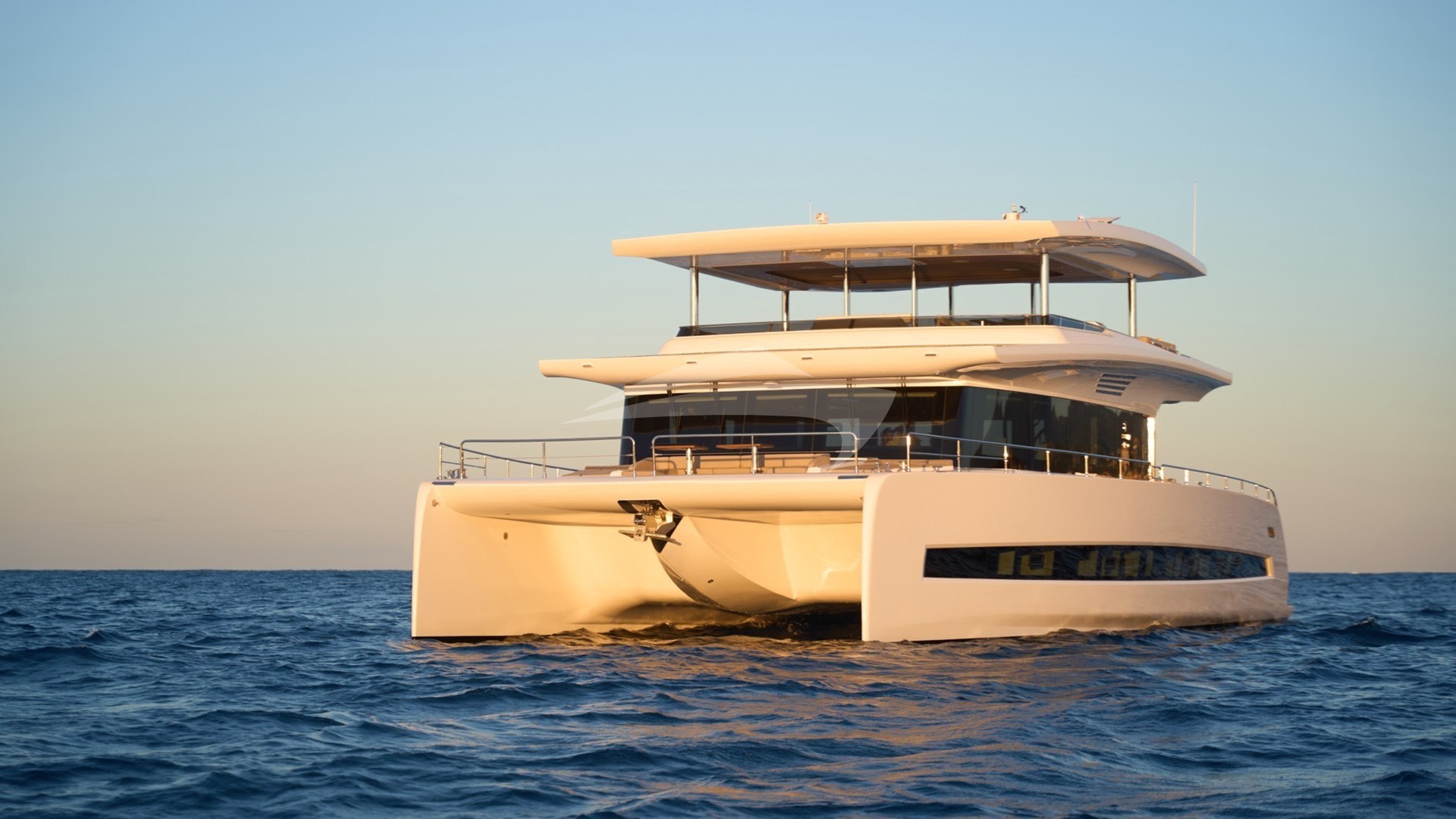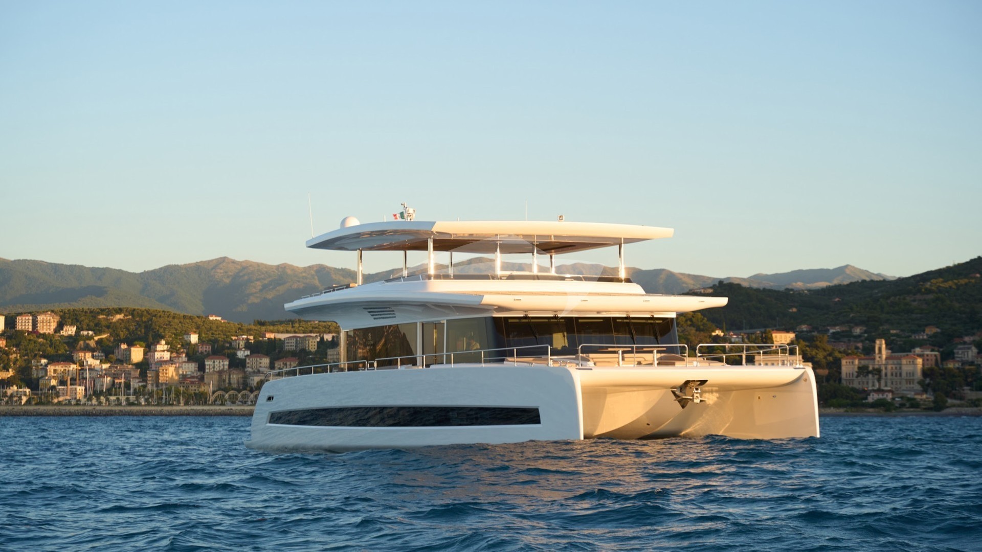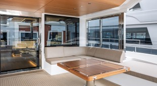 Up to 9 Guests in 4 en-suite stateroomsGuest Cabin Configuration:Large port hull Master cabin with convertible beds (King-size or 2 Twins), walk-in dressing room, en-suite bathroom with shower and double designer sinksStudio to port hull, convertible to Double cabin with additional Pullman bed, office desk, closet and en-suite bathroom (Studio can be connected to Master cabin as an extended adjacent living room/office or a Guest cabin for Starboard hull VIP cabin with convertible beds (King-size or 2 Twins), walk-in dressing room, en-suite bathroomStarboard hull Guest cabin with convertible beds (King-size or 2 Twins), closets, en-suite bathroomMain deck central platform with fully equipped galley to port, forward interior dining area for 9, central entertainment center with large 65” LED TV, large panoramic saloon to port with lounging sofa, wheelhouse with chart table, stairwells to both hullsDay head and utility room to port side in front of the saloon