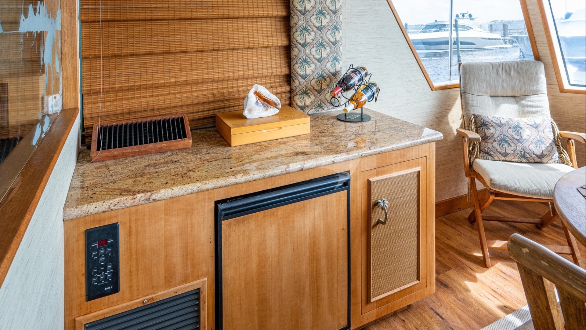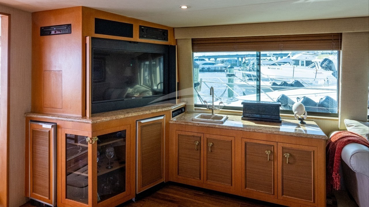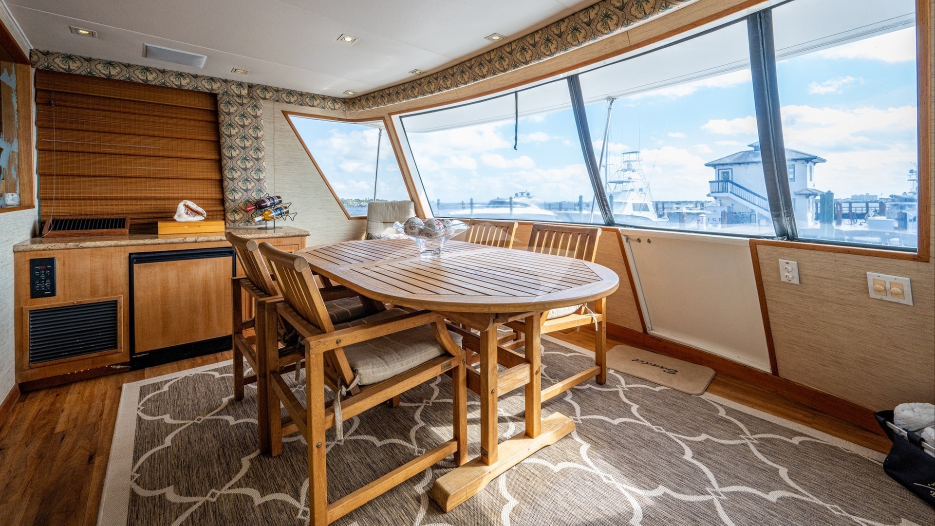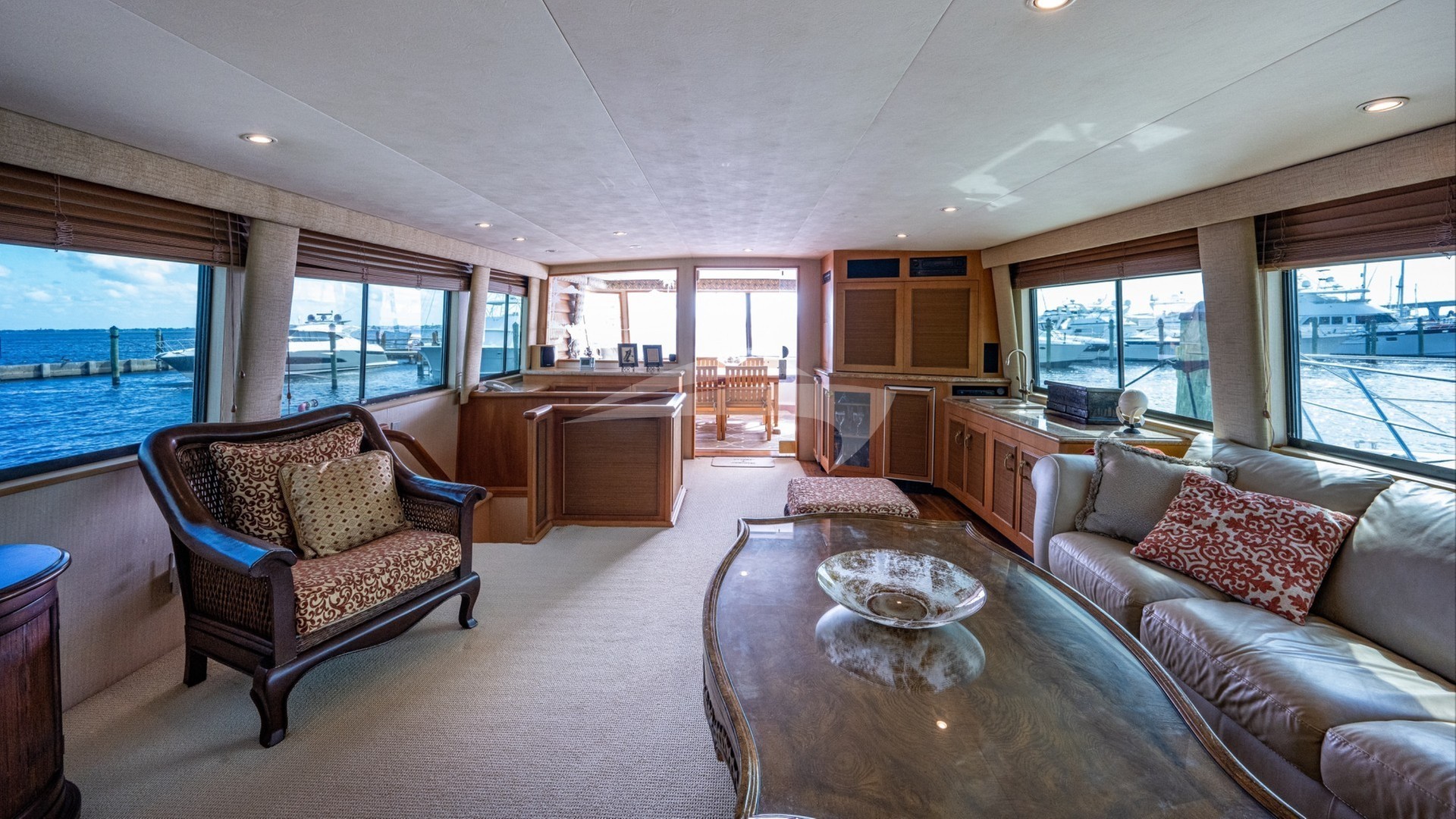 This area is separated by two bulkheads creating privacy while entertaining. The galley has been updated with granite countertops and updated appliances. The dinette is located on the starboard side on a raised platform with extra storage and wrap around seating. Moving further aft the galley opens to a full beam salon that runs all the aft to the enclosed cockpit area. A large sofa and love seat are located to port with a beautiful oak coffee table. The entertainment area is located to the port side as well as the custom bar area with teak sole. On the starboard side is a separate entrance to the master stateroom and two guest suites and moving just aft of the master stateroom entrance is an additional area for storage. Continuing aft through the sliding door is the fully enclosed aft cockpit with a large teak table with seating for up to six, an additional wet bar is located to starboard with additional appliances.