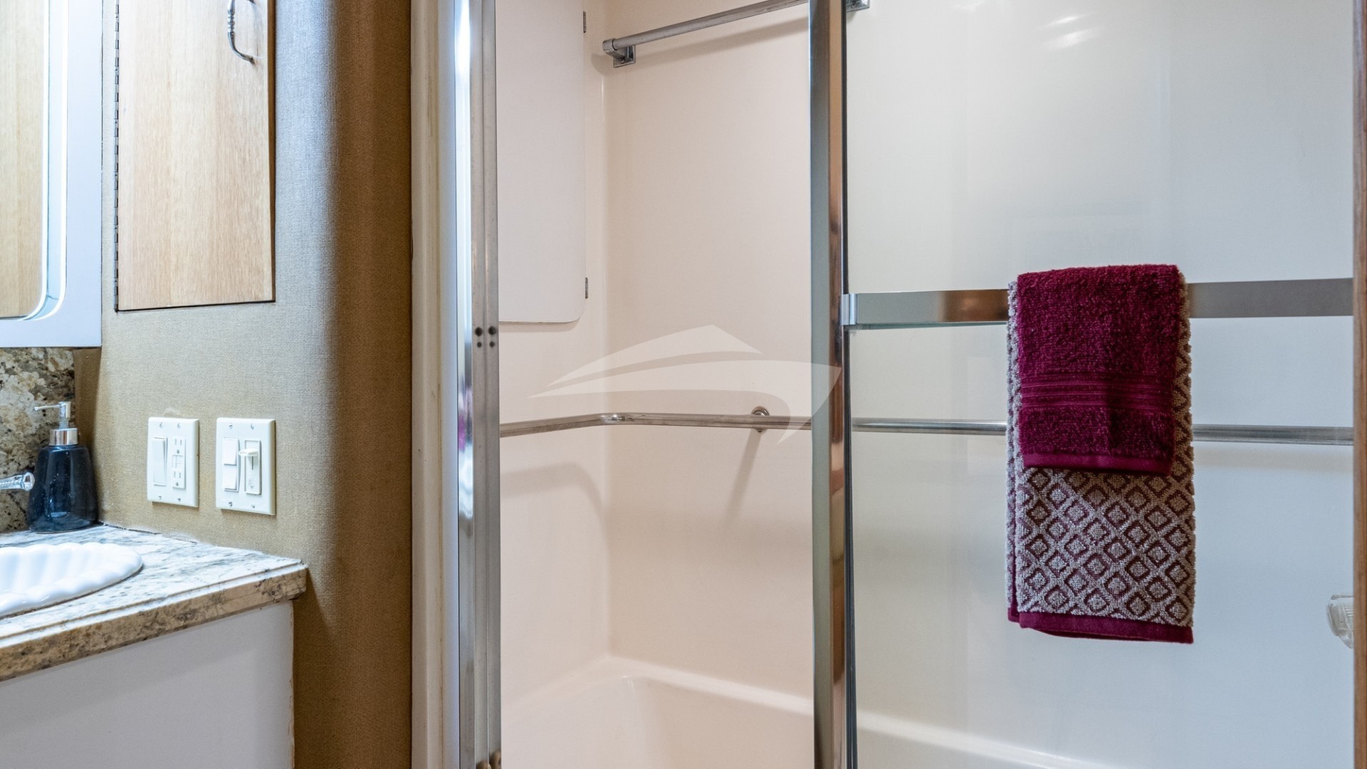 All the way to the bow via a semi-spiral stairwell is where you find your access to the engine room, office and two guest/crew quarter berths with a shared en-suite head and shower.