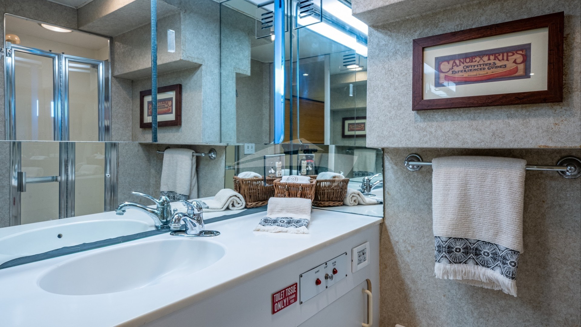 Moving back through the salon and down the spiral staircase the Master Stateroom is completely aft and encompasses the full nearly 19' beam. A large centerline king size berth is the focal point and just to the port side is a well placed love seat. A custom closet was added earlier in "Bandit's" life that is a full walk-in cedar lined closet and just to port is the en-suite master head and shower. Just ahead moving forward to port is one of two guest suites featuring a double berth with an optional pullman berth. There is also an en-suite head and shower and large hanging closet. To the starboard side is the second guest suite stateroom arranged with two side by side single berths, a large hanging closet and an en-suite head and shower.