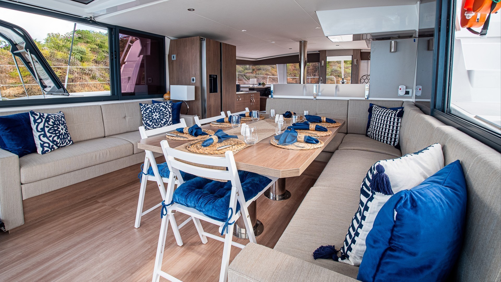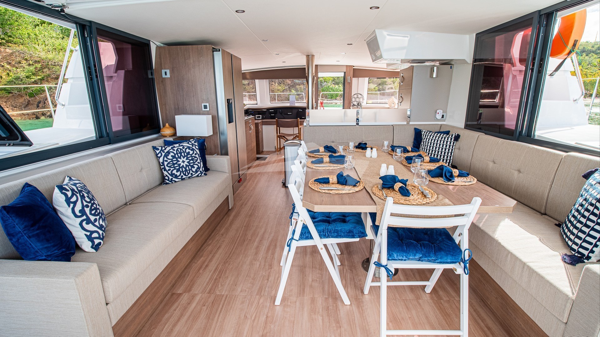 Forward cockpit and lounge and dining area.