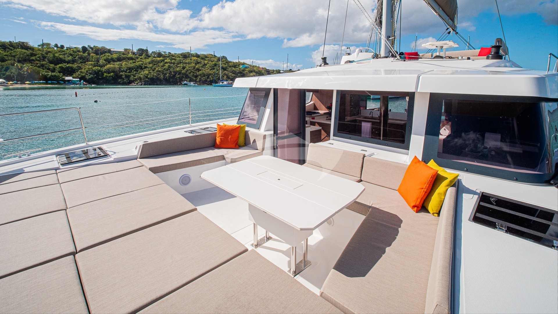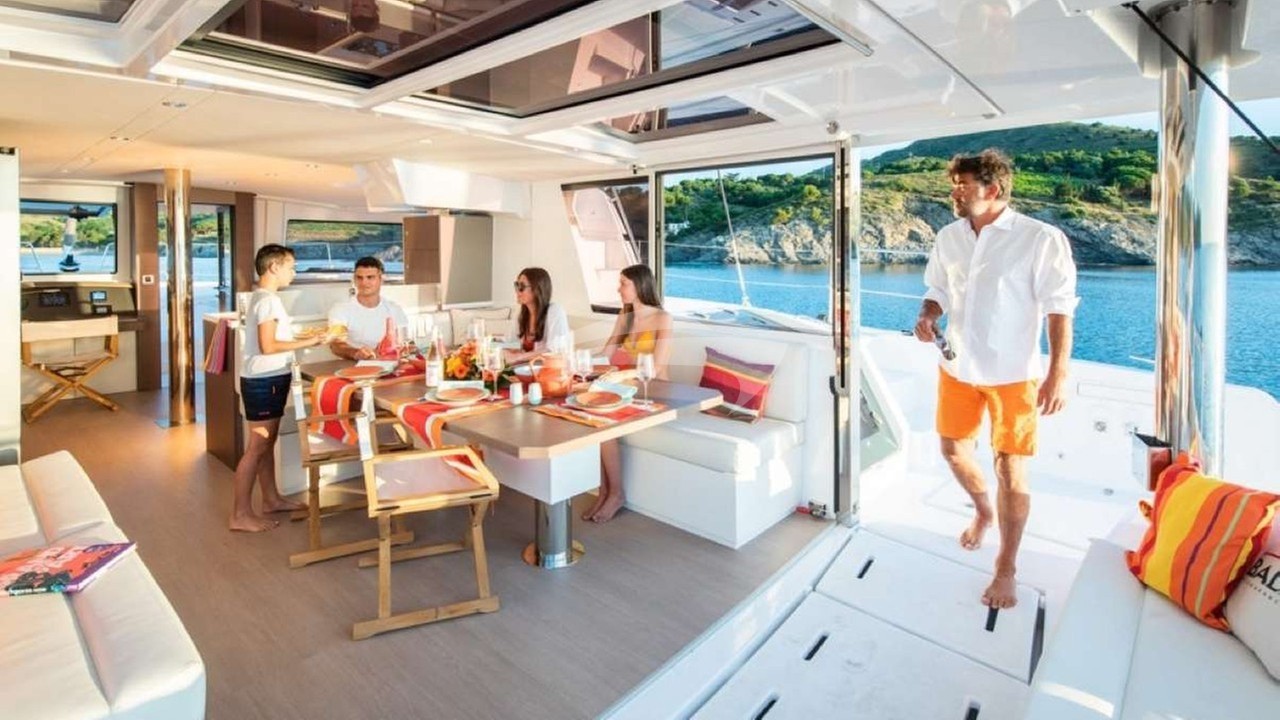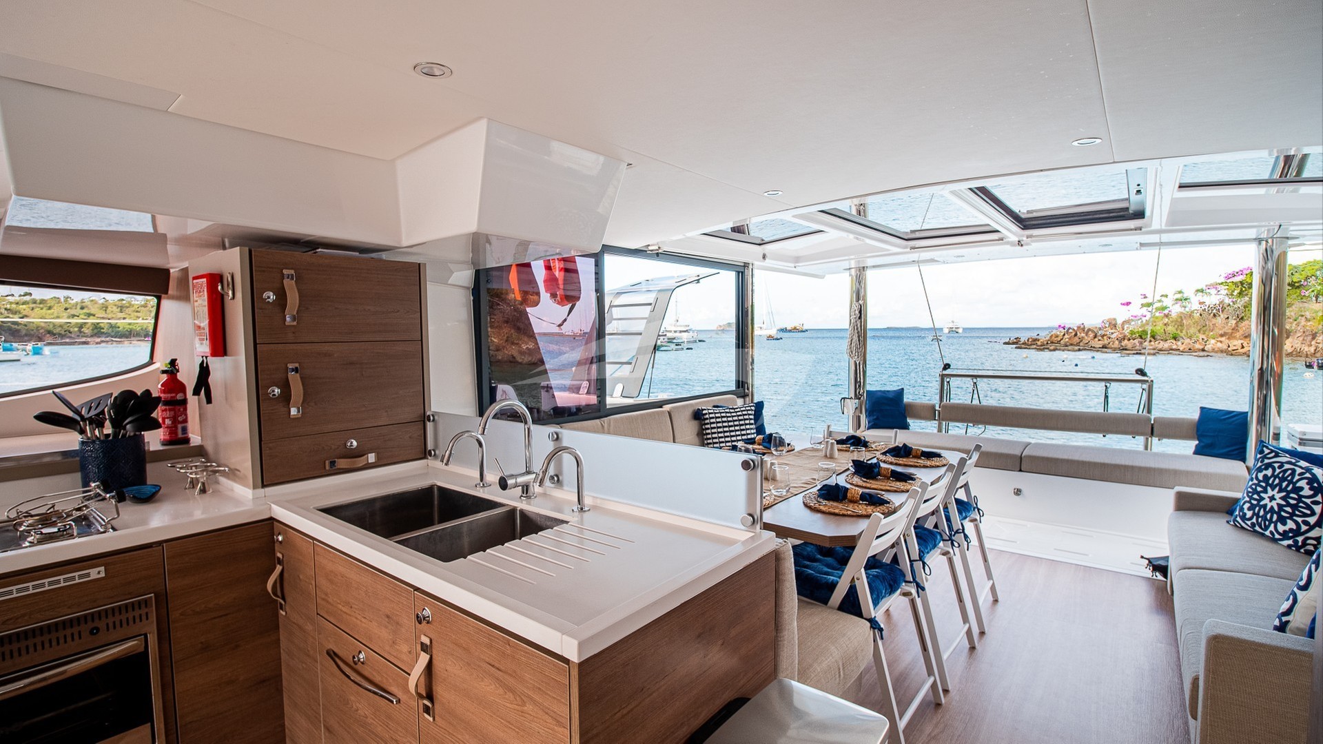 The galley is fully equipped with modern appliances—including a full-sized refrigerator—ready to support everything from casual snacks to gourmet meals. Outside, the solid foredeck provides an expansive lounge area and spacious seating—perfect for morning coffee, sunset cocktails, or simply soaking in the surroundings.