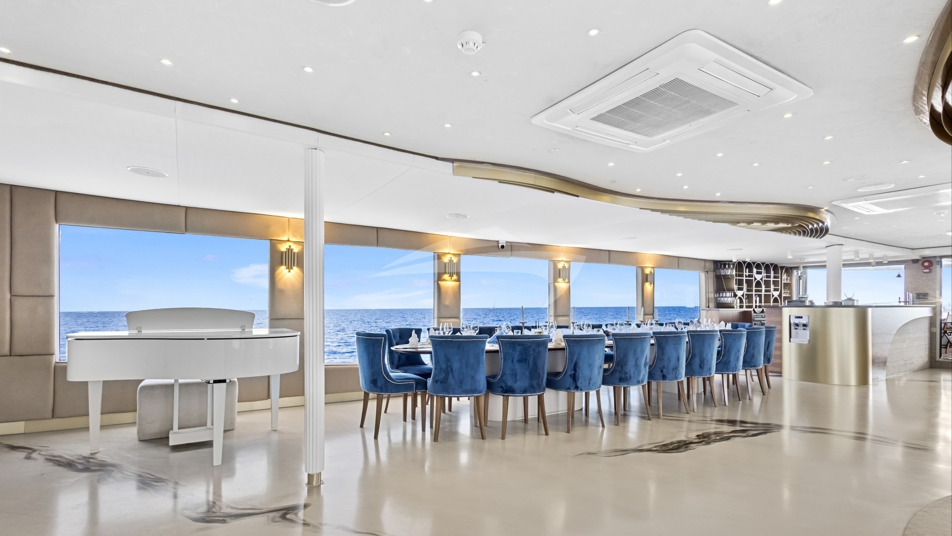 Step inside to discover a world of refined elegance, where every detail has been carefully curated for your comfort. The yacht boasts a state-of-the-art cinema, a fully-equipped gym, and a rejuvenating spa complete with a sauna, steam room, and Turkish bath. For music enthusiasts, a piano awaits your melodies in the stylish salon.