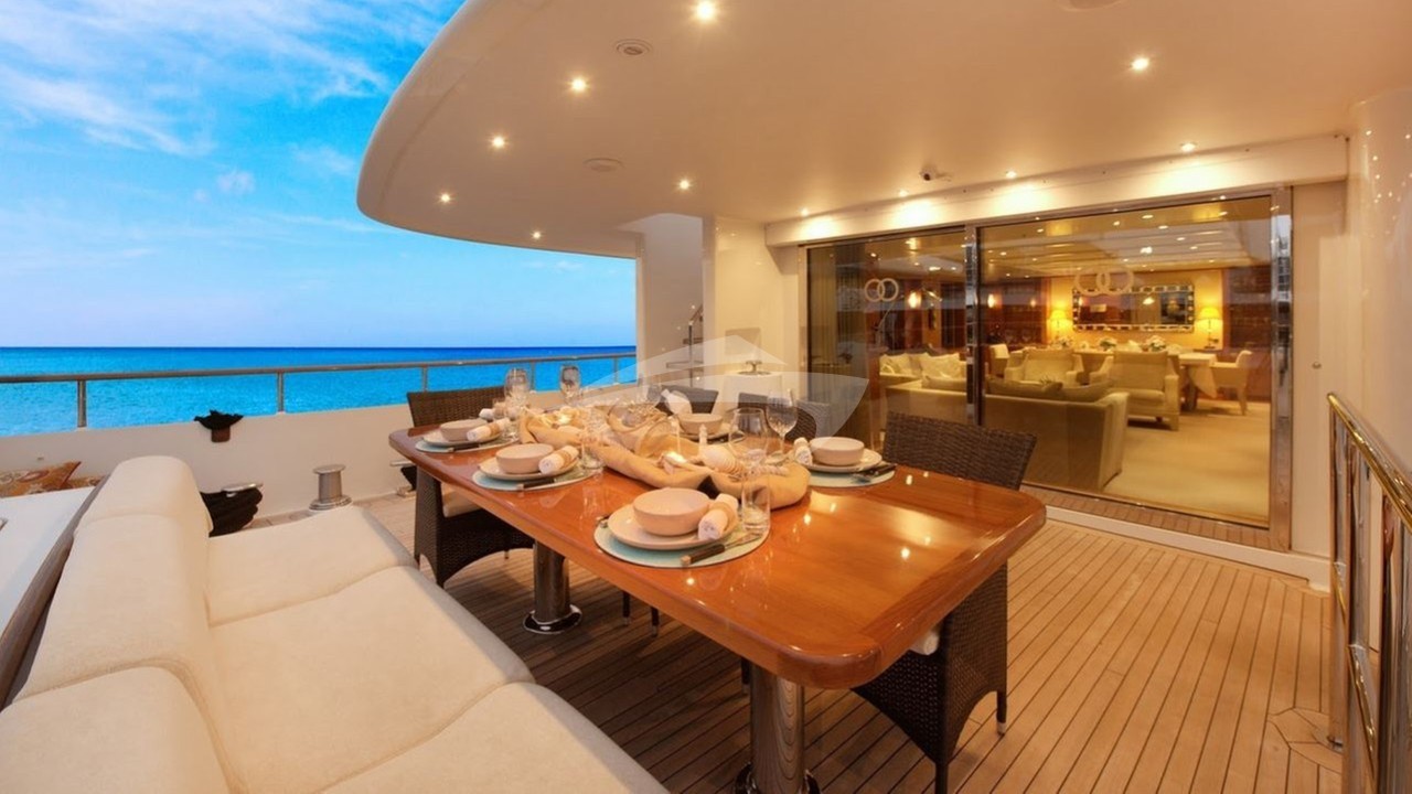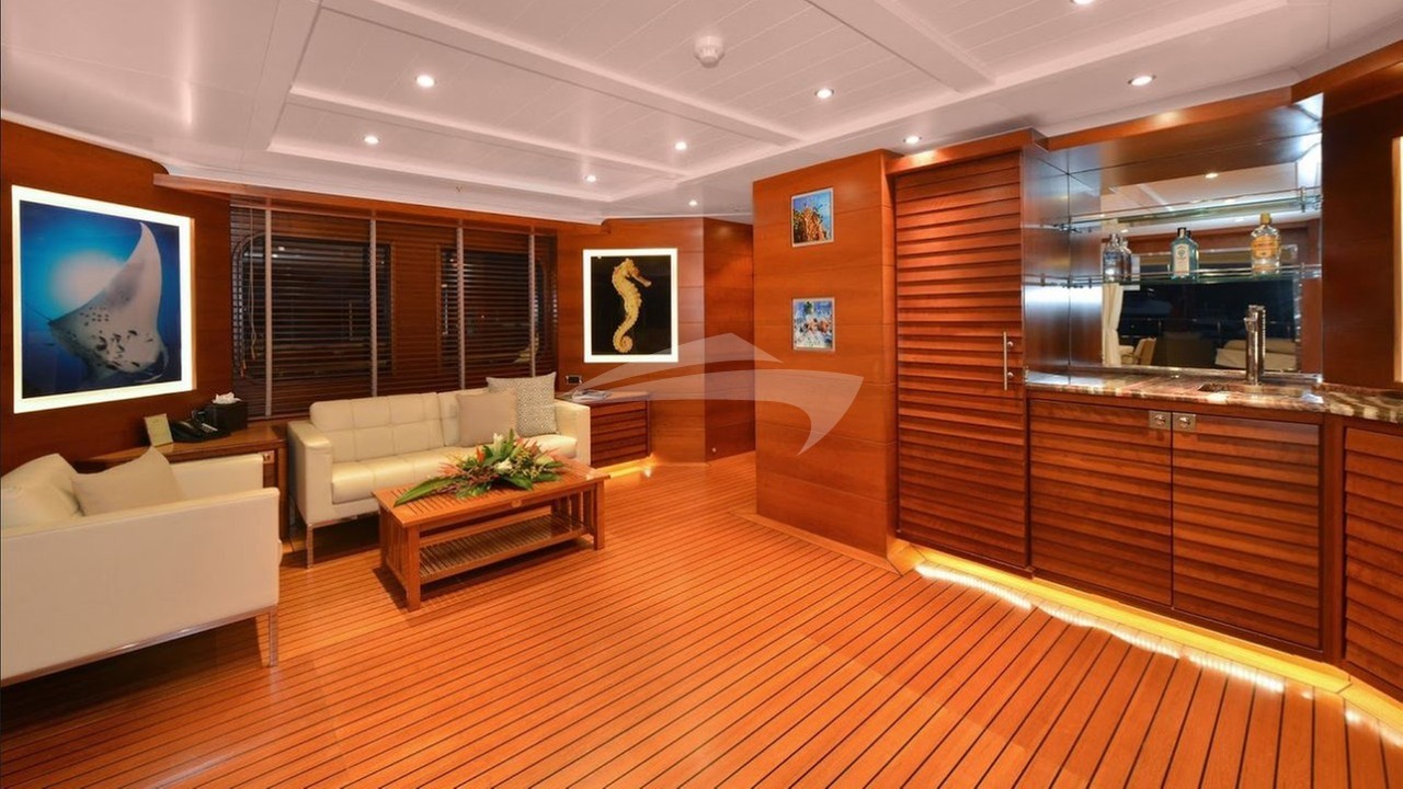 • The full beam Master Cabin includes a private office, whilst 4 cabins on the lower deck accommodate up to 10 guests