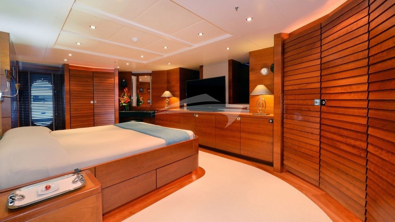 Forward on the main deck is the master suite with private office. The suite spreads full beam to ensure privacy. There is plentiful wardrobe space and a large bathroom with bathtub, double shower and underfloor heating.