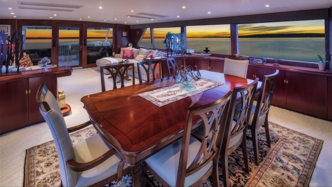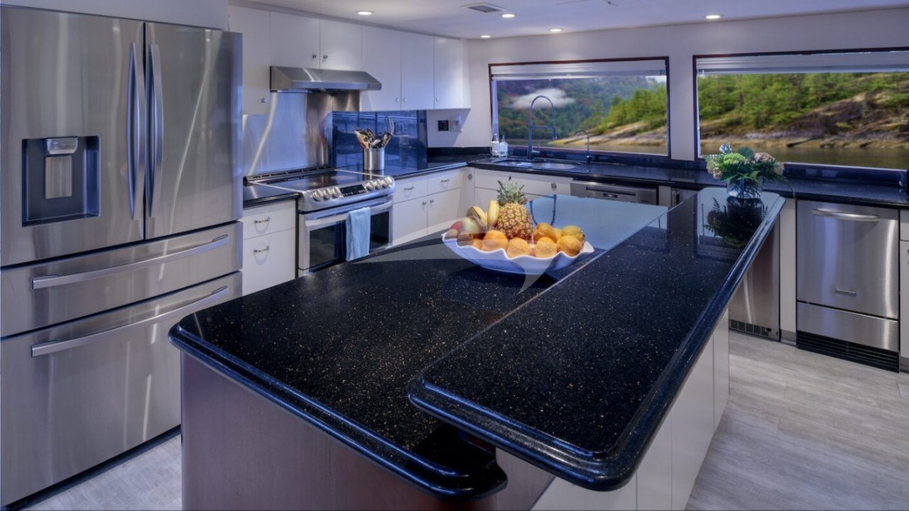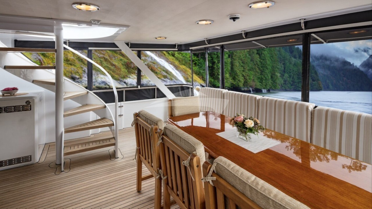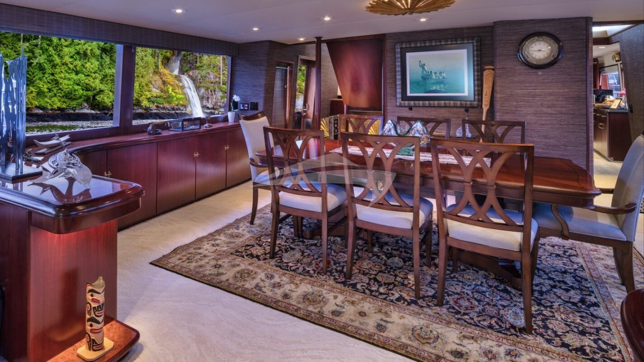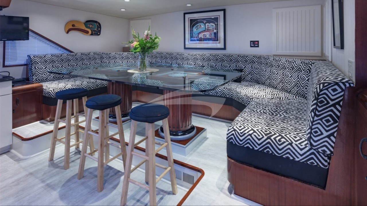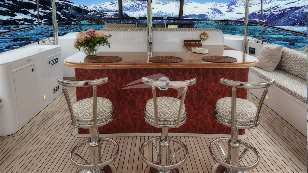 Highlights include a cozy enclosed aft deck for all-weather dining, a flybridge with lounge seating and a fireplace/Bluetooth speaker combo, and a saloon adorned with Alaskan artifacts and indigenous art. BLACKWOOD also features air conditioning and heating throughout, Starlink Wi-Fi, and stabilizers for smooth cruising. Ideal for exploring Alaska in style and comfort.