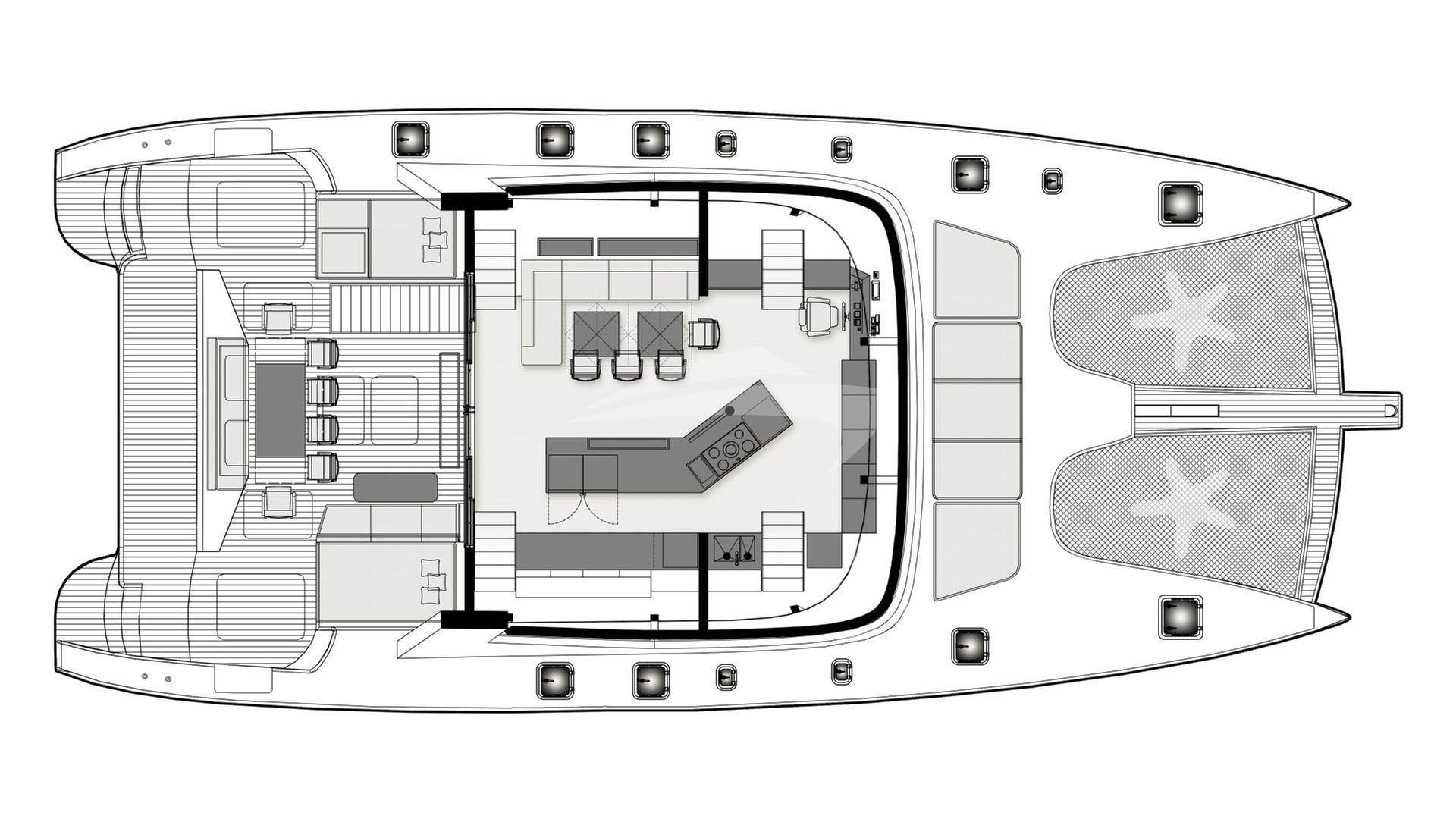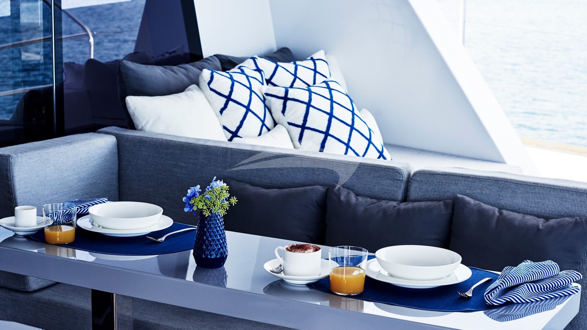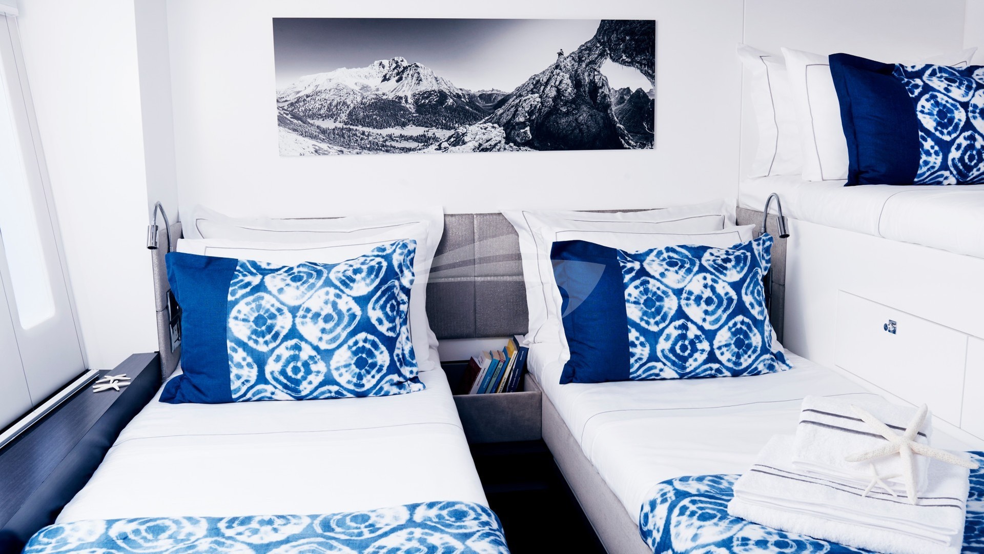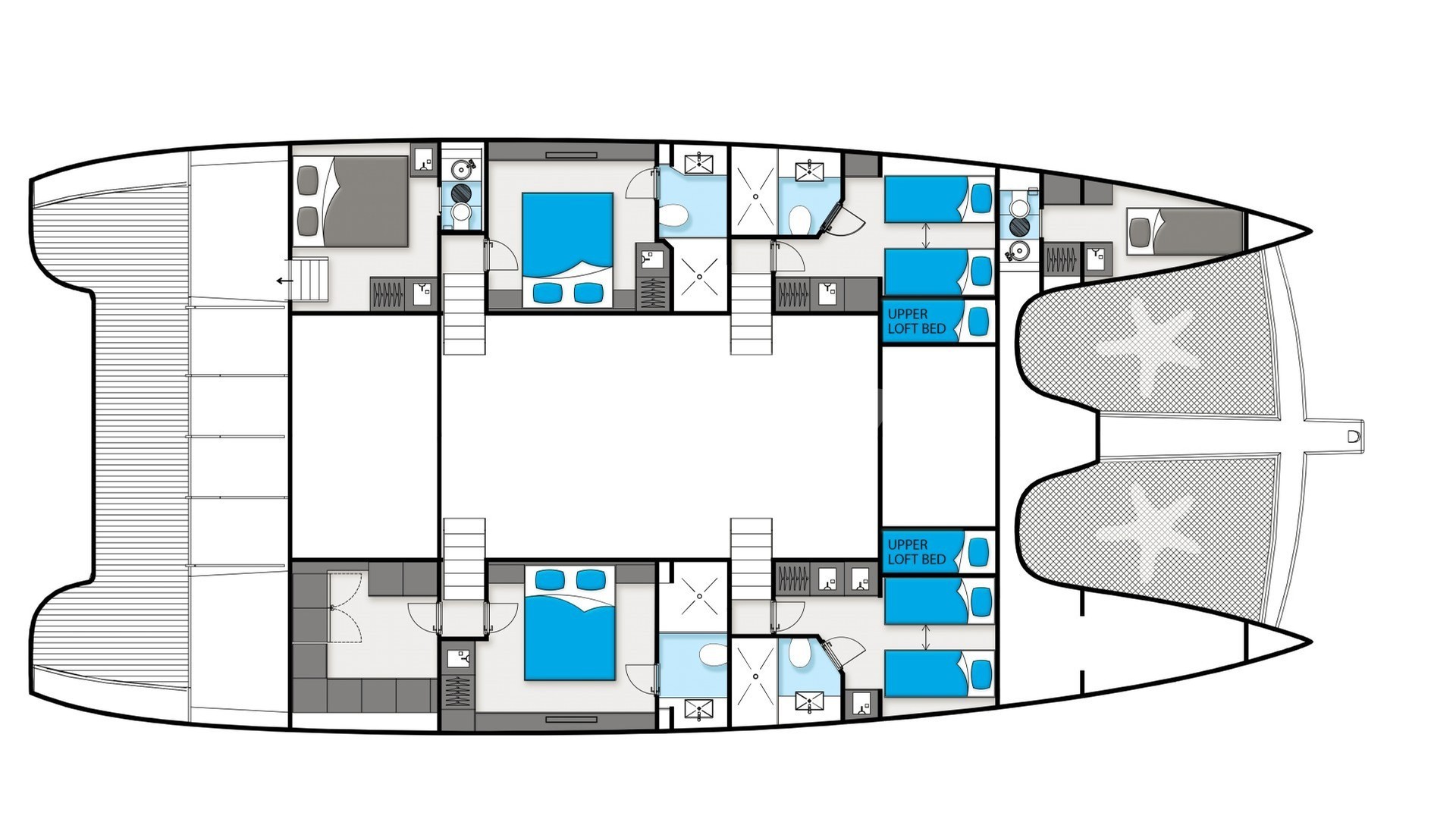 The catamaran can accommodate up to 8+2 guests in four separate spaces in the hulls including 2 deluxe cabins and 2 VIP cabins. Each of them designed to the smallest detail to bring comfort and pleasure. All decorative elements in the VIP cabins are 100% pure Italian linen, strongly desired by the owners, like pillows and a bottom quilt. Their inspiration were the colors from the Mediterranean and the Caribbean Sea as well as the blue sky. The result: the perfect high quality fabric shades of blue, aquamarine and white. A superior level of luxuriousness is also achieved thanks to shimmering silver headboards. The cabins are equipped with comfortable king-size beds, wardrobes and retractable TV’s.Thanks to spacious windows guests can wake up in the morning sun and go to sleep in the star light. The two deluxe guest cabins comprise two single (convertible) beds and a bunk bed to the wall that is ideal for children.Their designs have a common thread with the fabric of the VIP cabins incorporating shades of blue and aquamarine and noble shades of grays and silver colors for the headboards. Each room has its own ensuite spacious bathroom in gray Lava Rock.