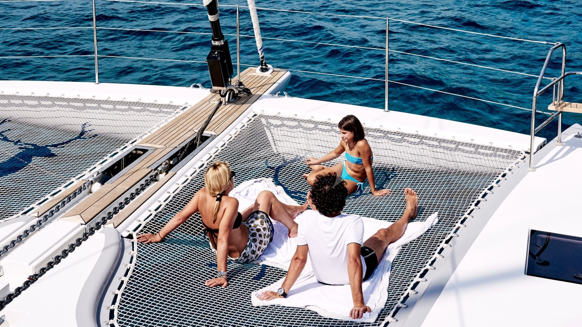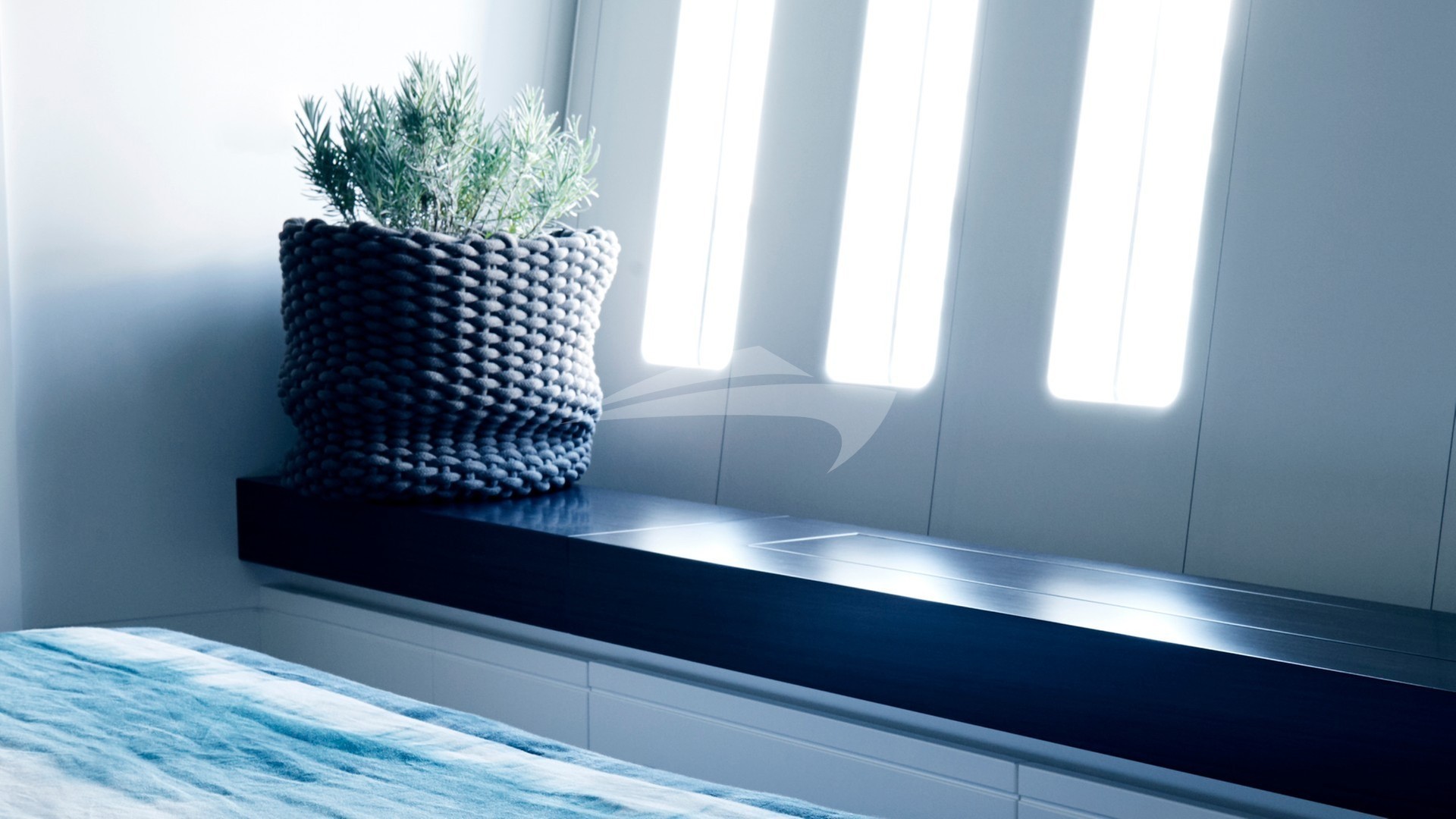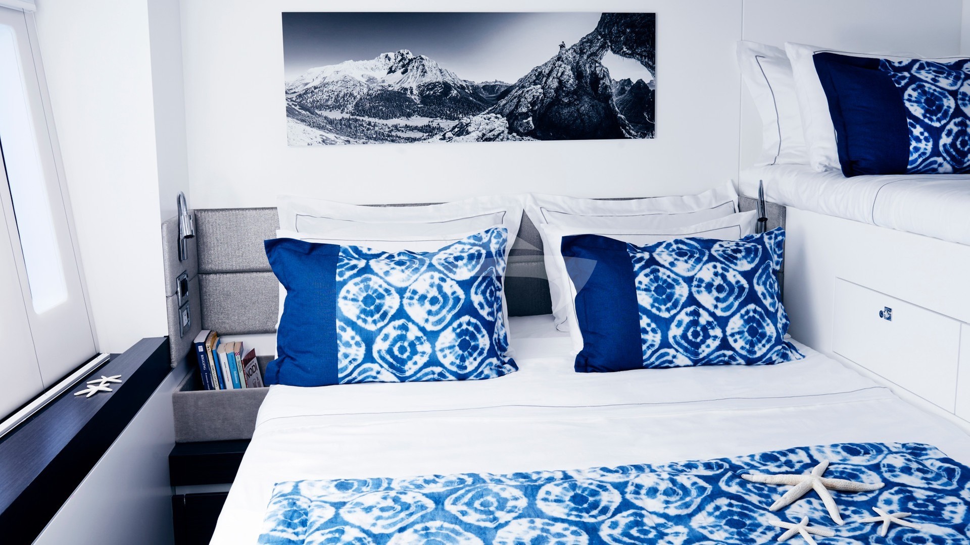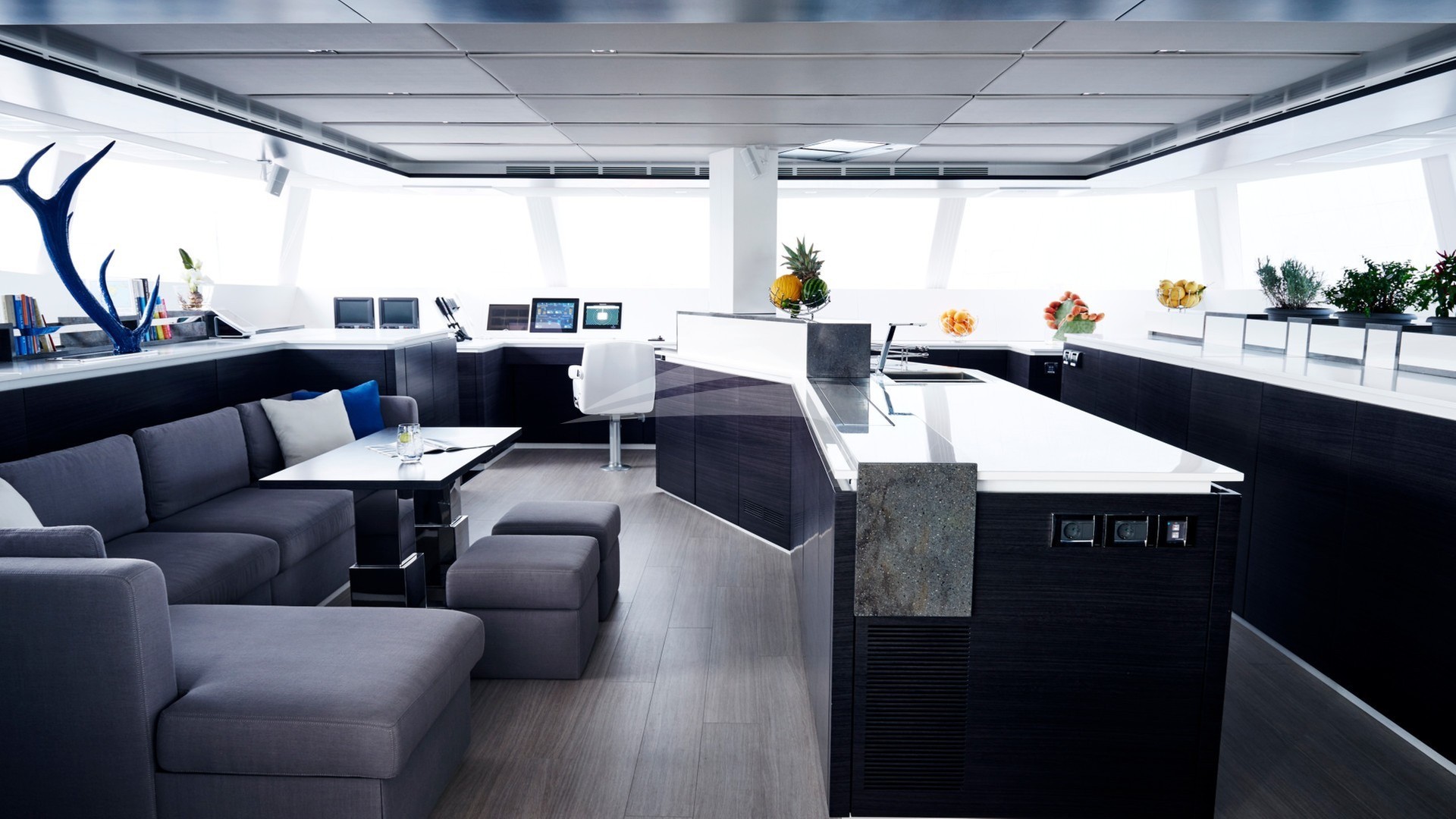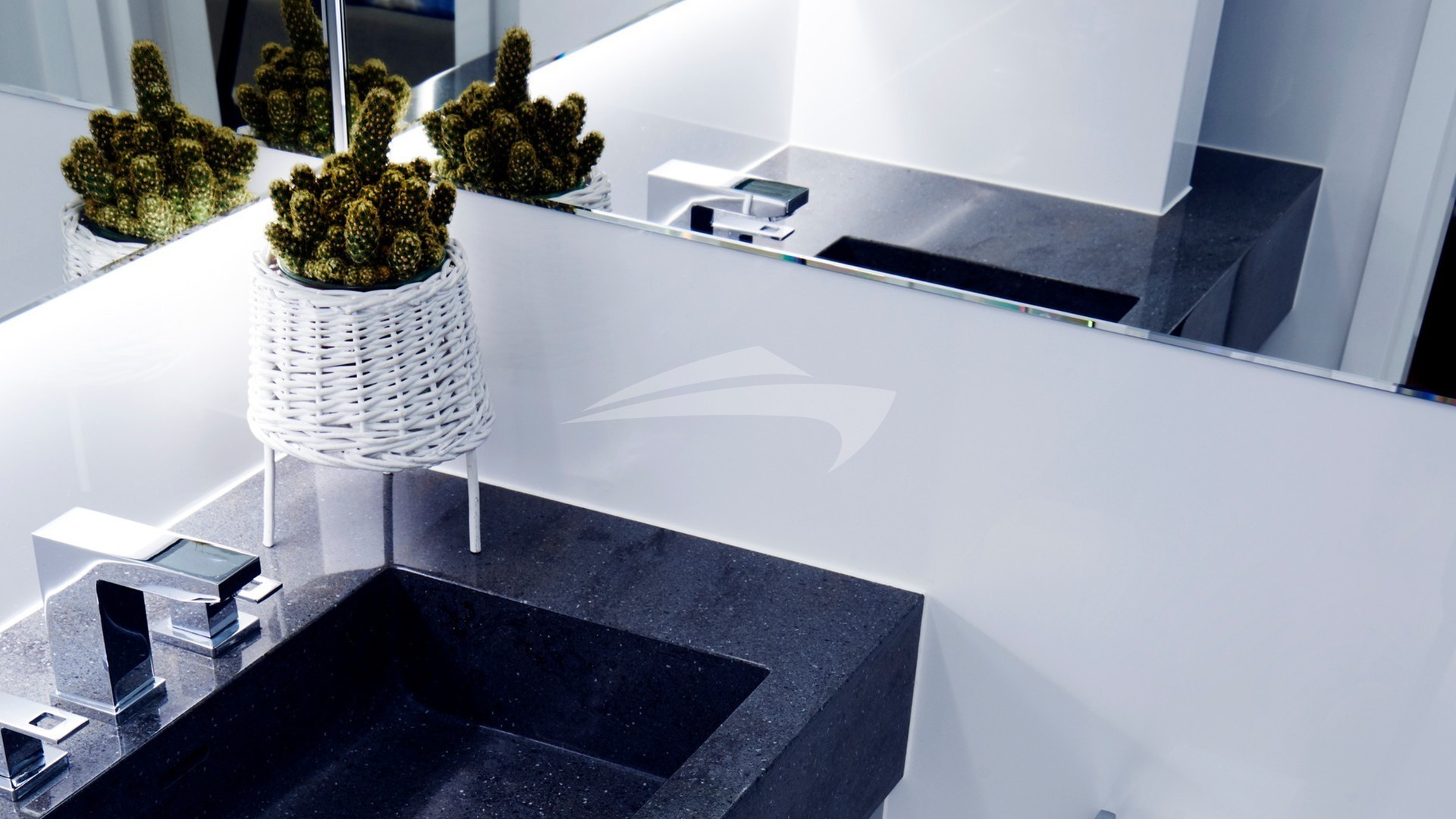 The catamaran can accommodate up to 8+2 guests in four separate spaces in the hulls including 2 deluxe cabins and 2 VIP cabins. Each of them designed to the smallest detail to bring comfort and pleasure. All decorative elements in the VIP cabins are 100% pure Italian linen, strongly desired by the owners, like pillows and a bottom quilt. Their inspiration were the colors from the Mediterranean and the Caribbean Sea as well as the blue sky. The result: the perfect high quality fabric shades of blue, aquamarine and white. A superior level of luxuriousness is also achieved thanks to shimmering silver headboards. The cabins are equipped with comfortable king-size beds, wardrobes and retractable TV’s.Thanks to spacious windows guests can wake up in the morning sun and go to sleep in the star light. The two deluxe guest cabins comprise two single (convertible) beds and a bunk bed to the wall that is ideal for children.Their designs have a common thread with the fabric of the VIP cabins incorporating shades of blue and aquamarine and noble shades of grays and silver colors for the headboards. Each room has its own ensuite spacious bathroom in gray Lava Rock.