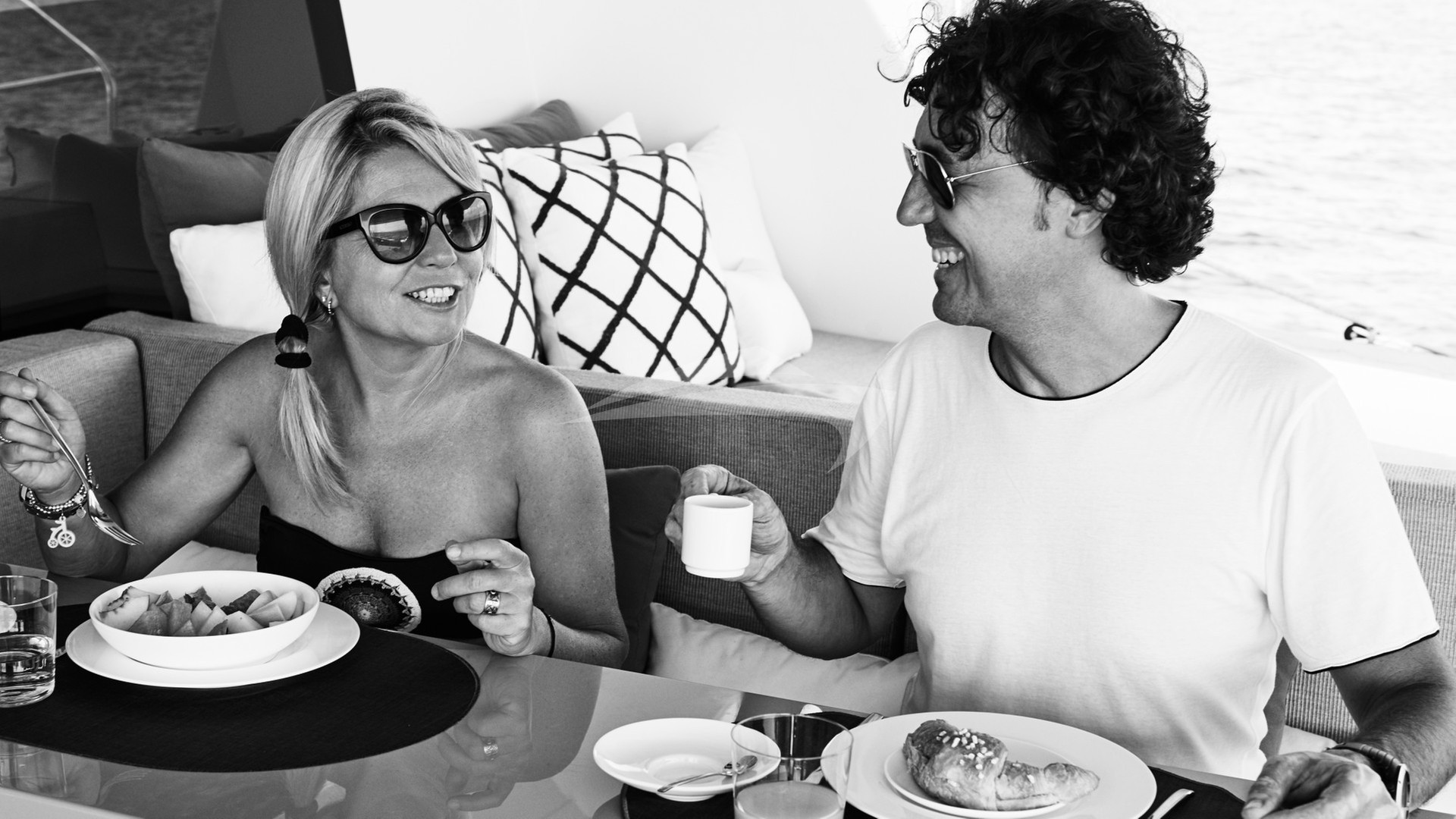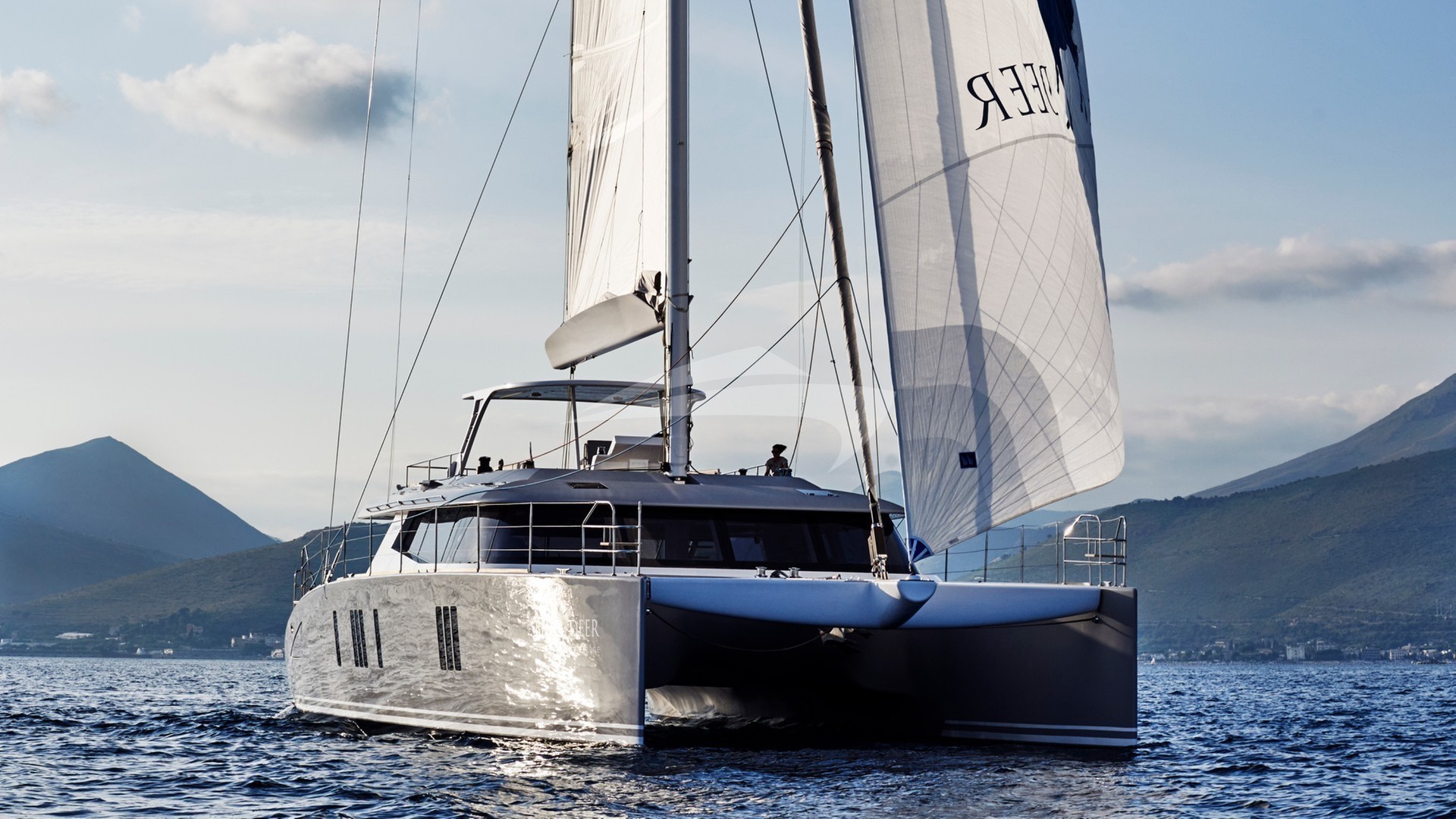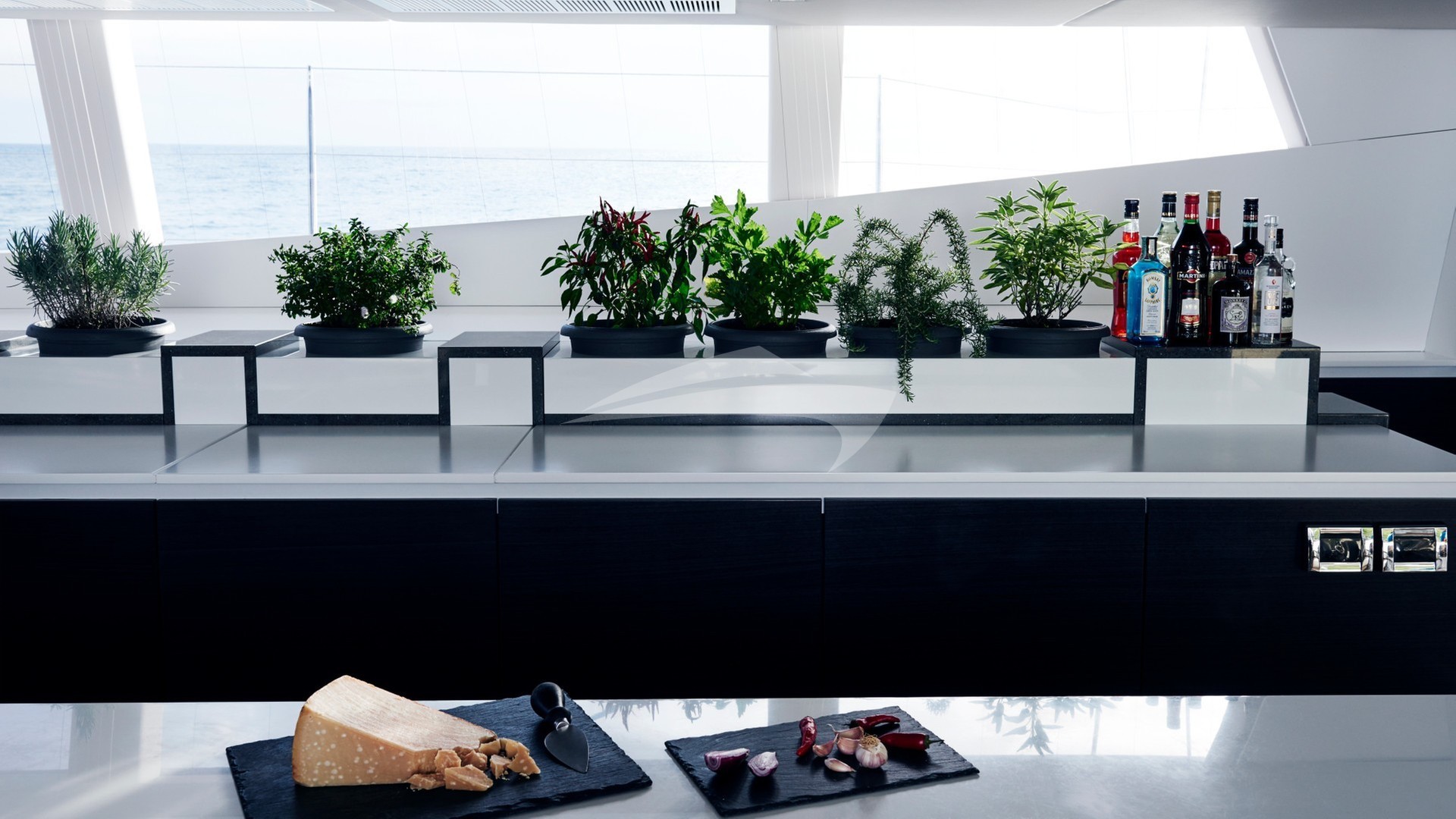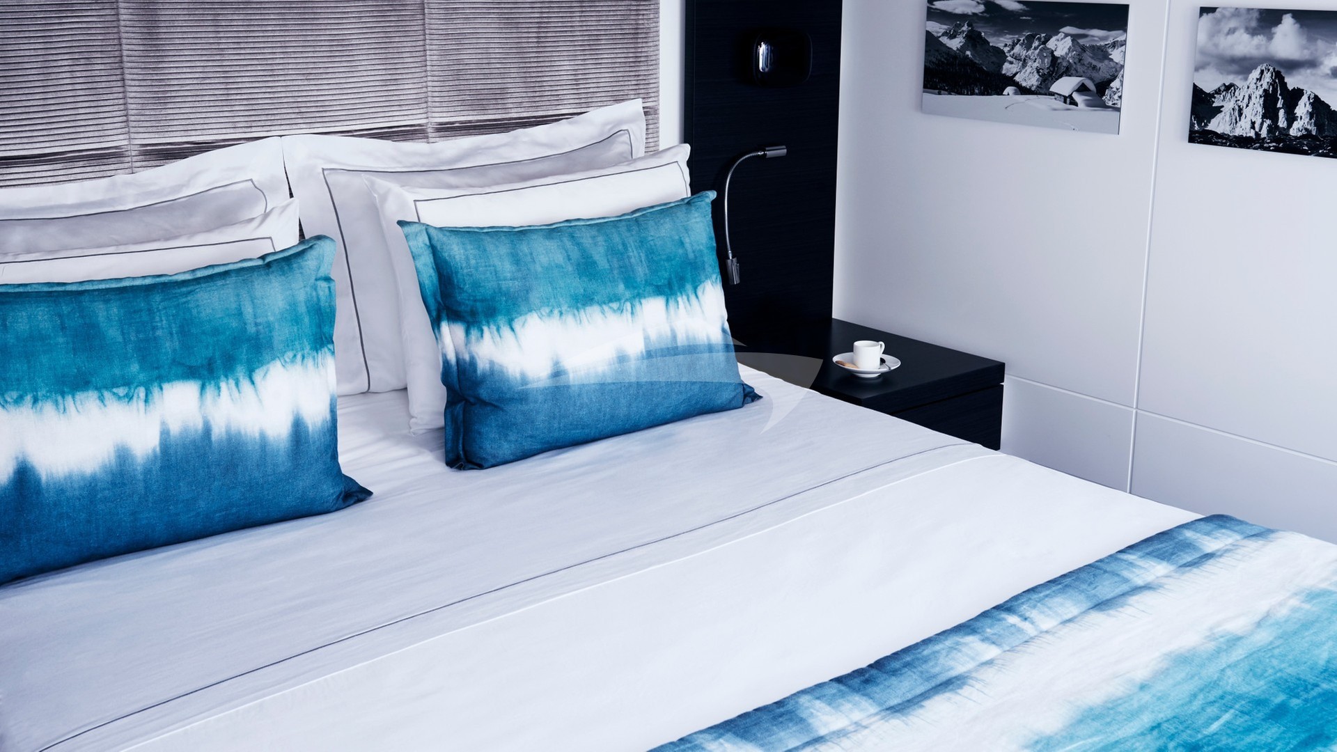 The catamaran can accommodate up to 8+2 guests in four separate spaces in the hulls including 2 deluxe cabins and 2 VIP cabins. Each of them designed to the smallest detail to bring comfort and pleasure. All decorative elements in the VIP cabins are 100% pure Italian linen, strongly desired by the owners, like pillows and a bottom quilt. Their inspiration were the colors from the Mediterranean and the Caribbean Sea as well as the blue sky. The result: the perfect high quality fabric shades of blue, aquamarine and white. A superior level of luxuriousness is also achieved thanks to shimmering silver headboards. The cabins are equipped with comfortable king-size beds, wardrobes and retractable TV’s.Thanks to spacious windows guests can wake up in the morning sun and go to sleep in the star light. The two deluxe guest cabins comprise two single (convertible) beds and a bunk bed to the wall that is ideal for children.Their designs have a common thread with the fabric of the VIP cabins incorporating shades of blue and aquamarine and noble shades of grays and silver colors for the headboards. Each room has its own ensuite spacious bathroom in gray Lava Rock.