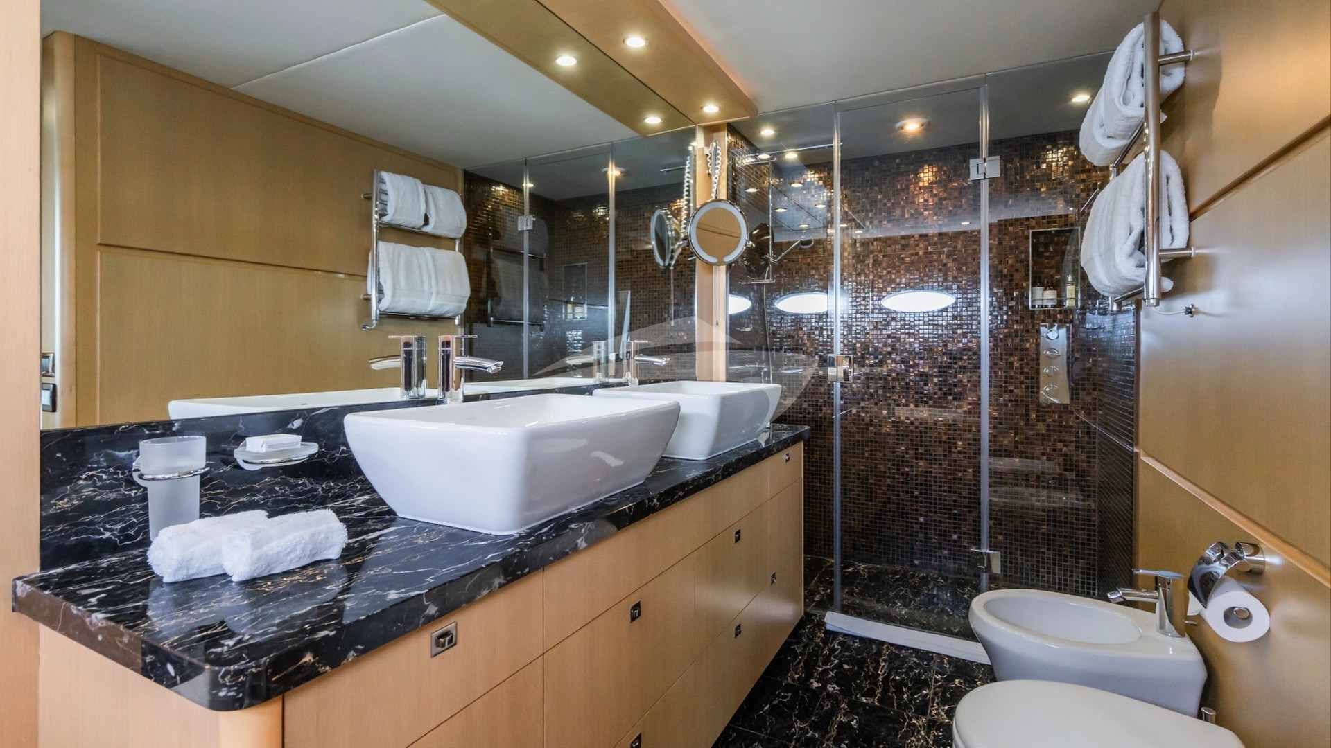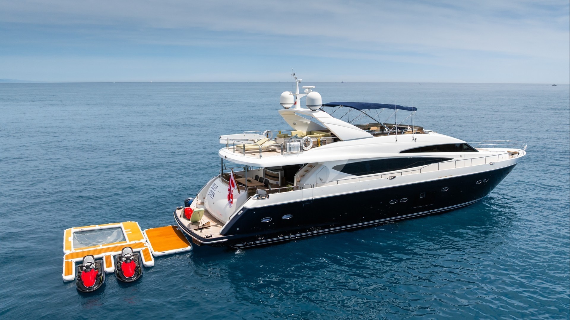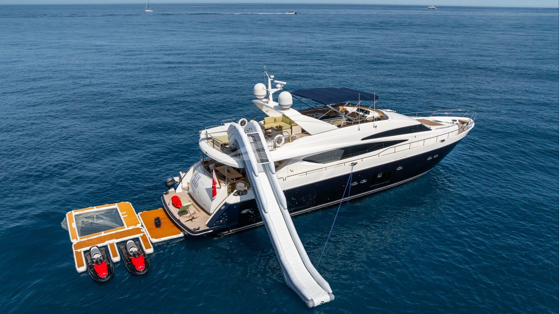 Whether you're cruising or anchored, BLUE EYES delivers comfort, class, and fun—with an impressive toy selection including two jet skis, one slide, jelly fish pool, and all the latest gear with a swimming platform.
