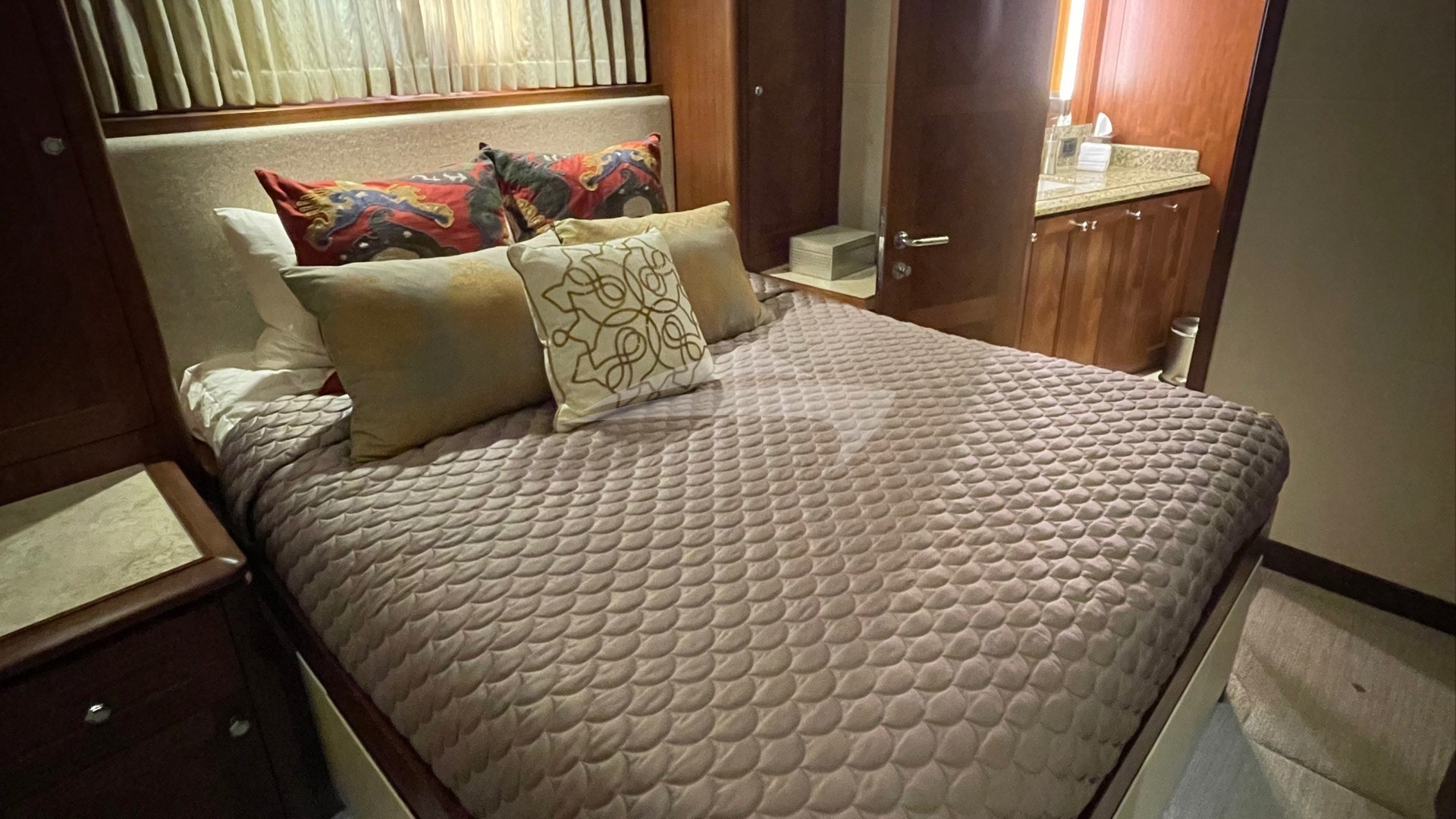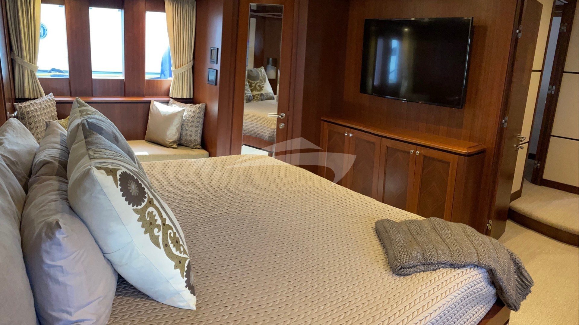 There are three luxury staterooms for guest accommodations. The Primary suite has a king sized bed, make up table, lounge, with his and hers private bathrooms, a large walk through shower with multiple shower heads. The VIP suite has a queen sized bed with walk-around access from both sides (not pushed along a wall or bulkhead) a spacious private en suite bathroom. The Guest suite also has a queen sized walk-around bed with private en suite bathroom. All staterooms have comfortable luxury Hotel Collection linens and towels. Each is a quiet, restful sanctuary with individually controlled thermostats for heat and/or AC. Each stateroom has individually controlled satellite TV and BT music.