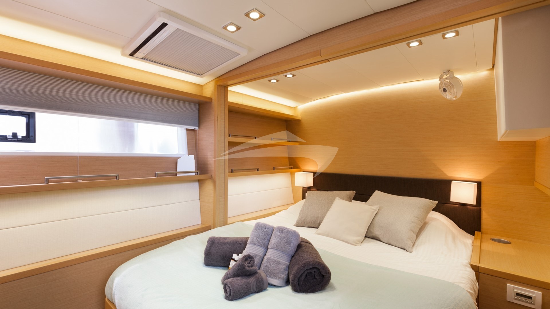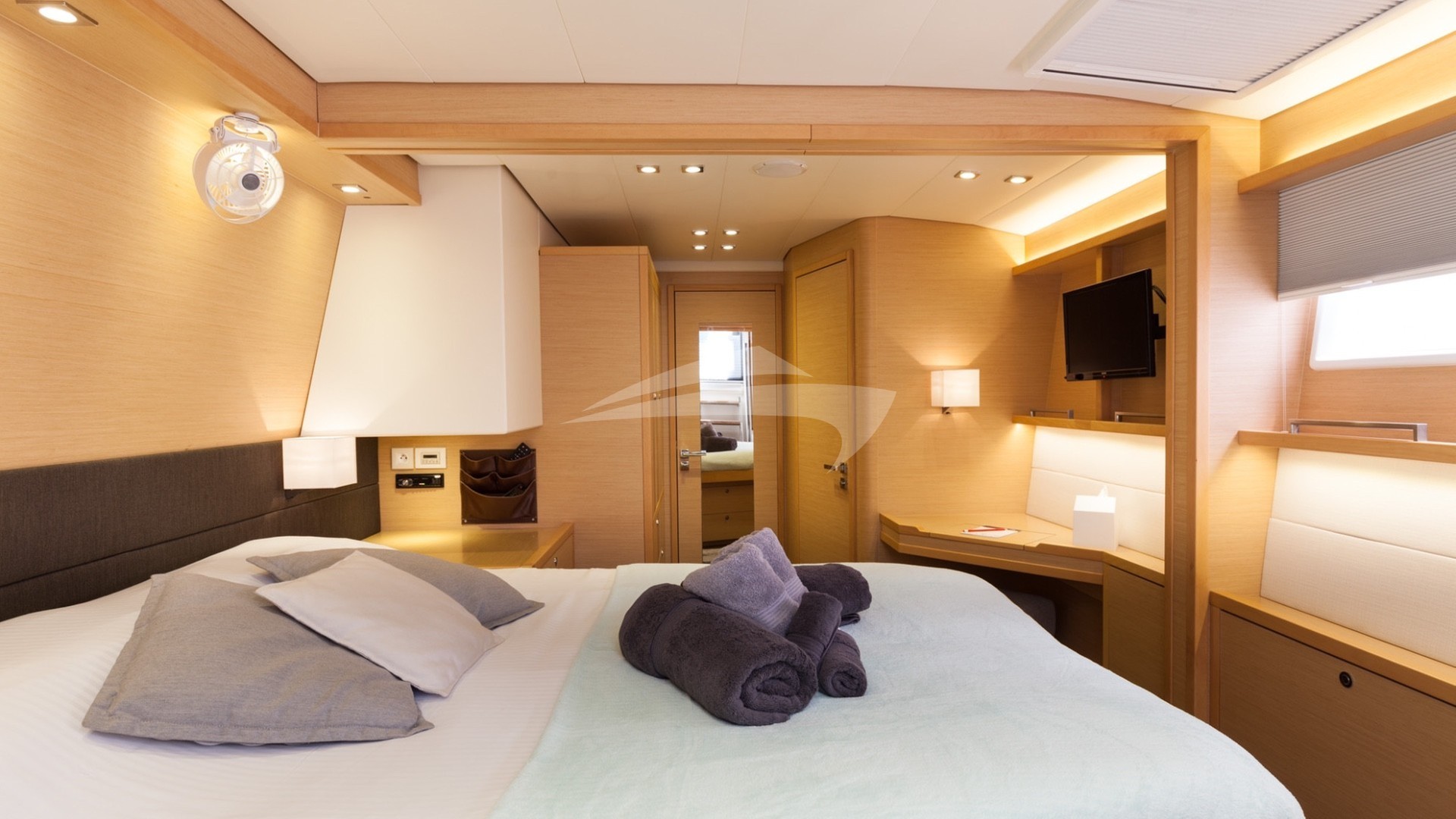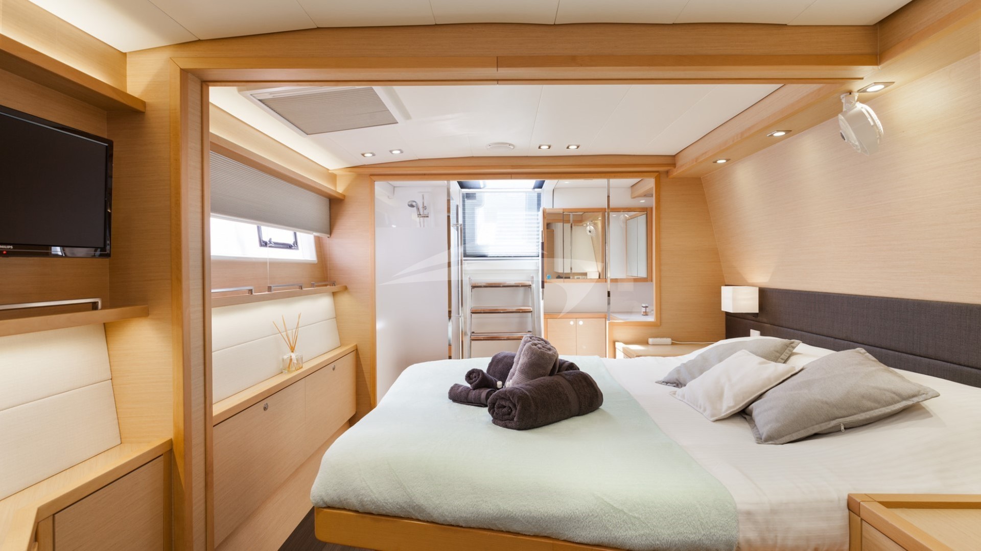 � A vast ensuite Owner's cabin with office, dressing area, and direct access to the aft deck.